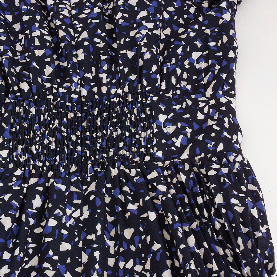 ウエスト部分は後ろゴムのシャーリング仕様で、自然にフィットしてスタイルアップを叶えます。