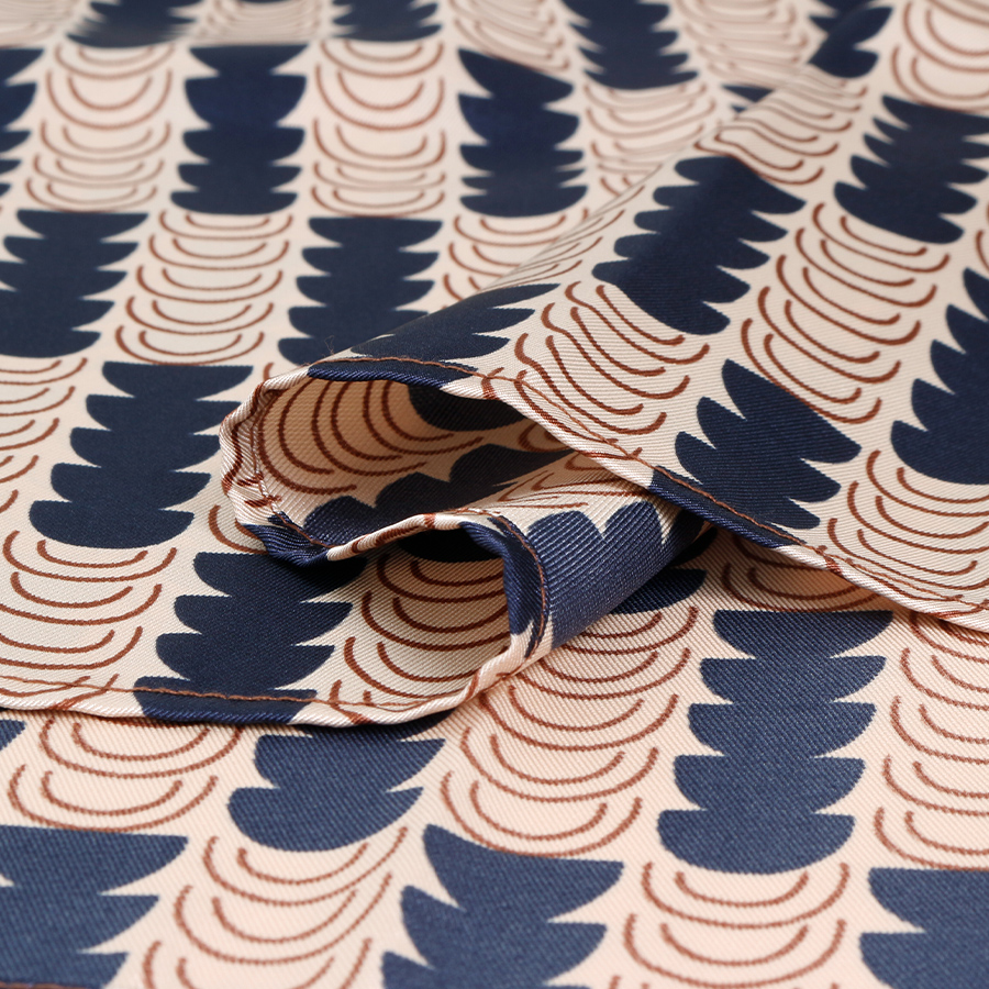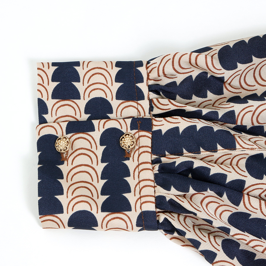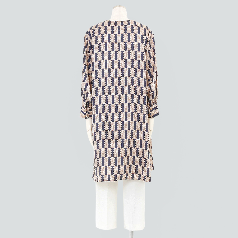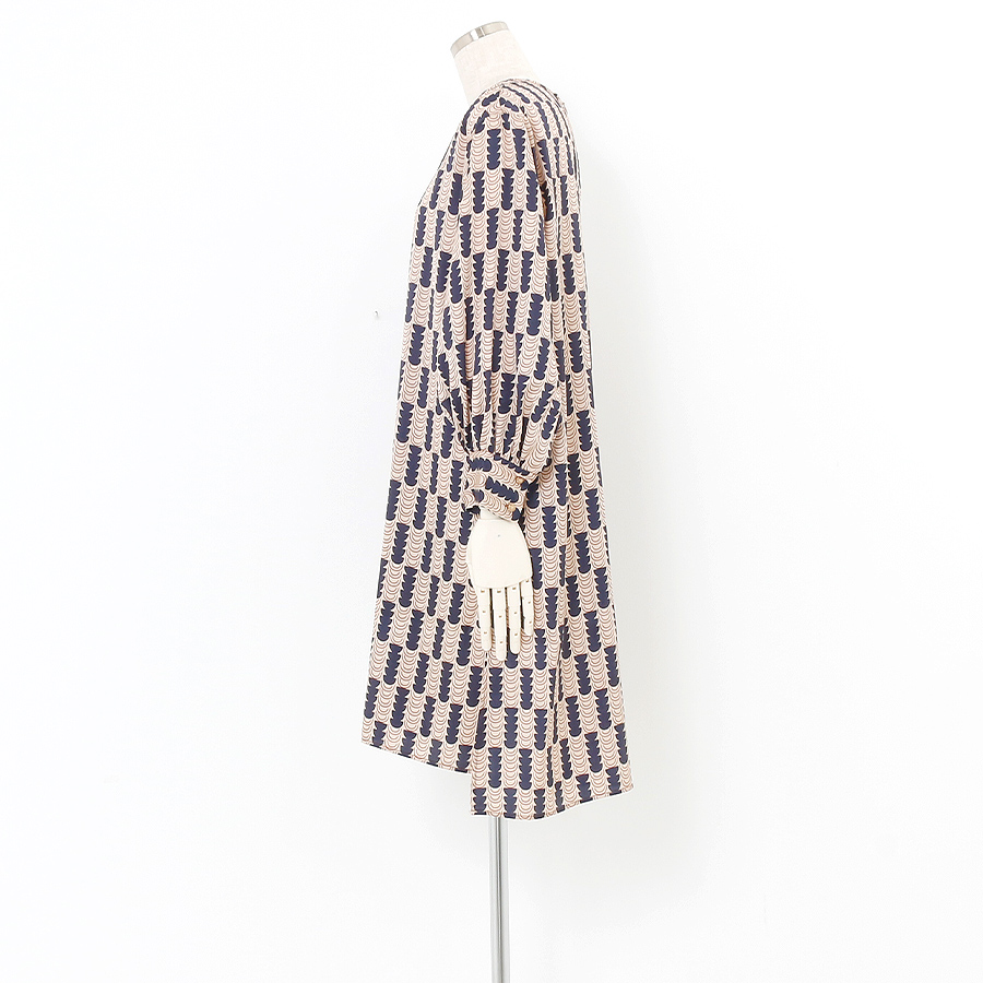 リズミカルな幾何柄が目を引く、軽やかな光沢素材のチュニック。