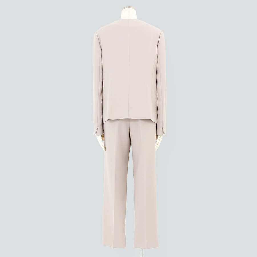 ノーカラージャケットとストレートパンツのセットアップ。