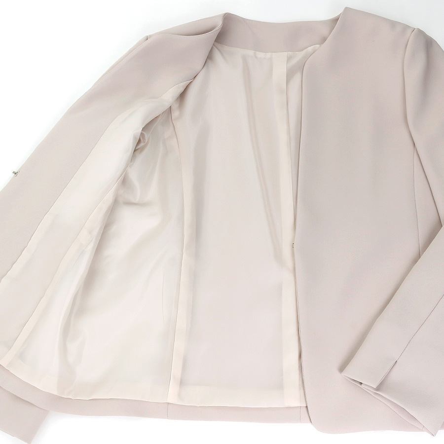 【ジャケット】フロントホックタイプのシンプルなノーカラージャケット。