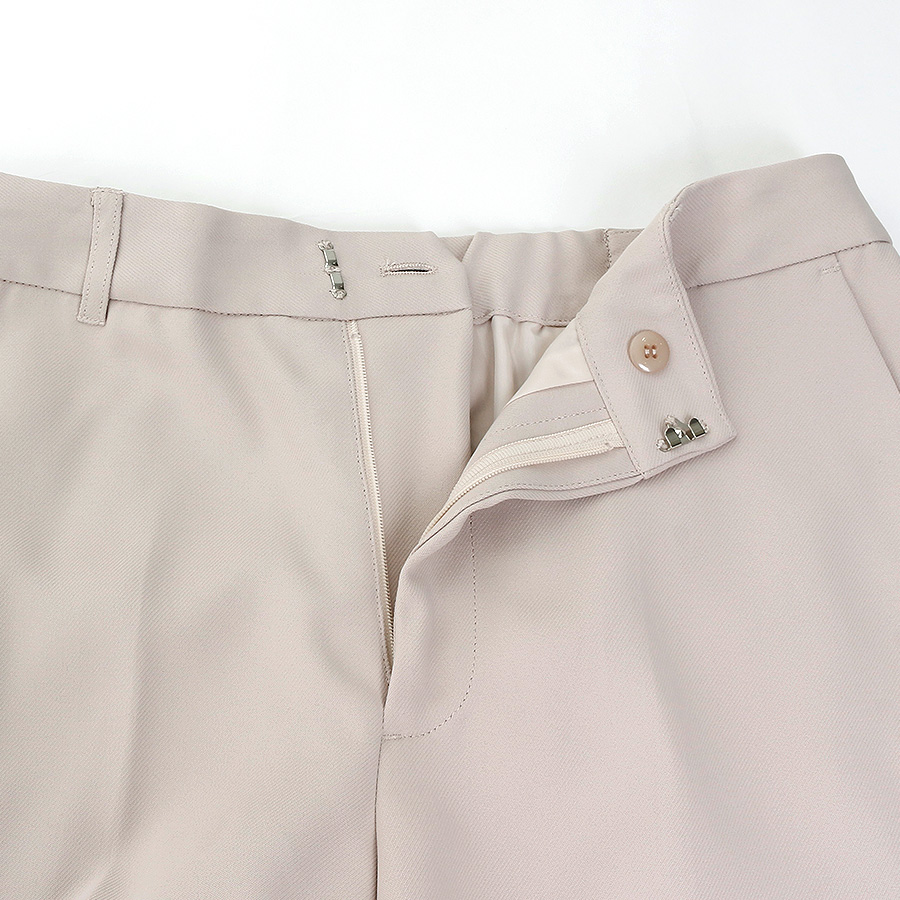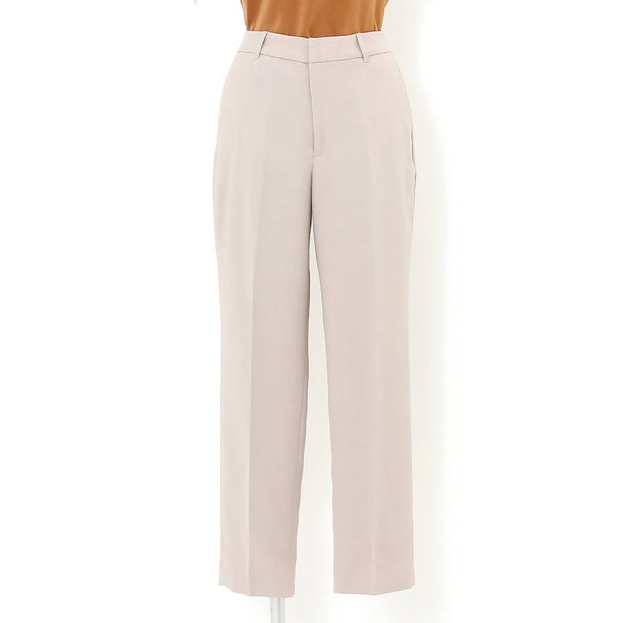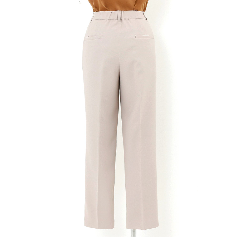 【パンツ】足長効果のあるセンタープレス入りストレートパンツ。ウエストのゴムは一部分にすることでスッキリと見えながら履き心地抜群。