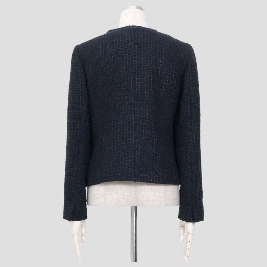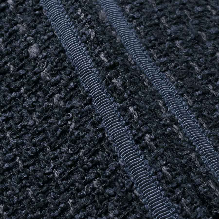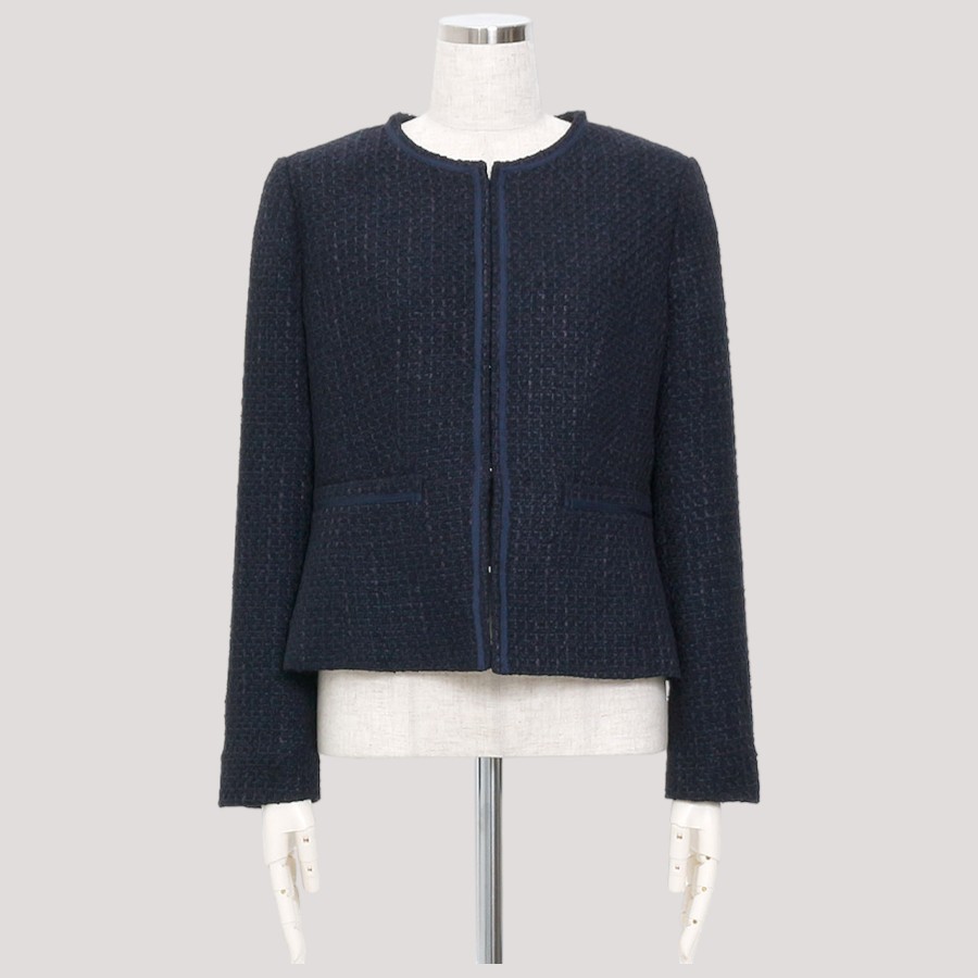 同系色のブレードがあしらわれた上品なノーカラージャケット。