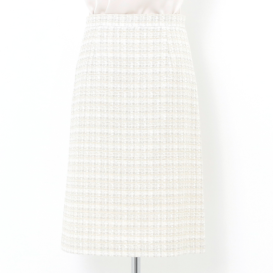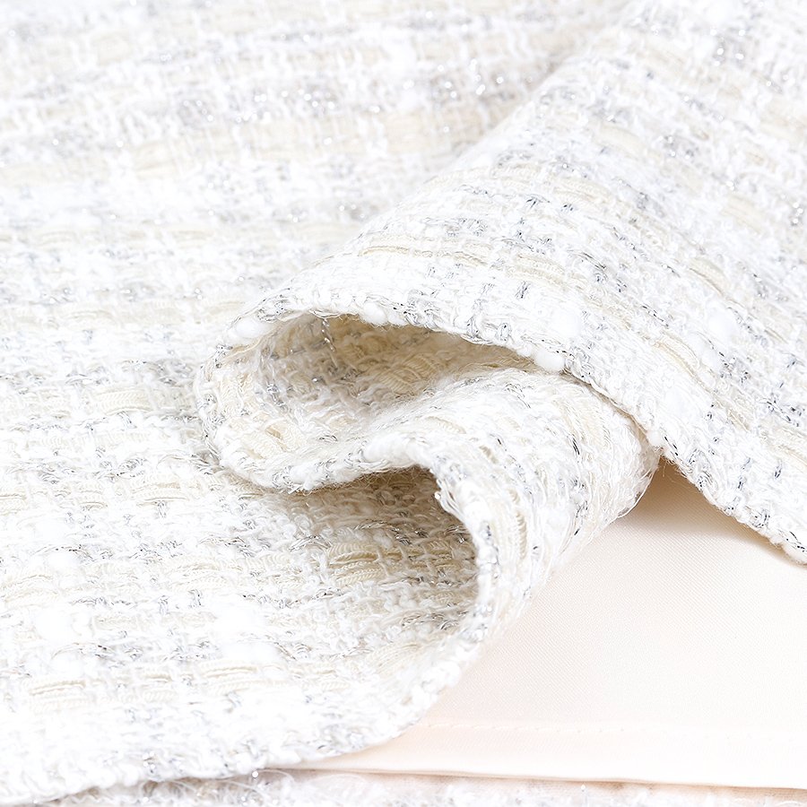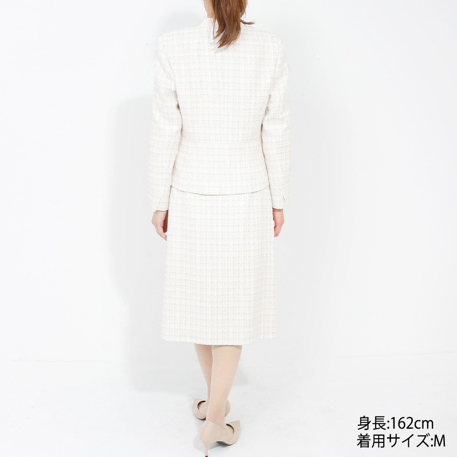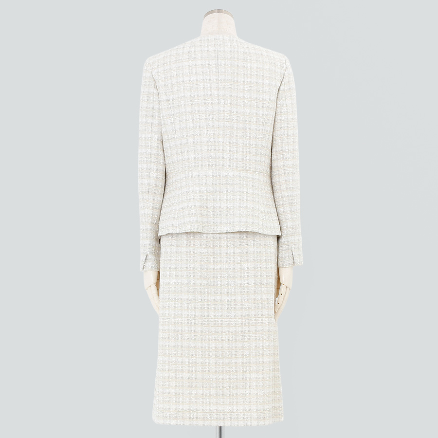 上品なラメ糸やテープヤーンなど意匠糸を使用した華やかなファンシーツィードのノーカラージャケットとスカートのセットアップ。