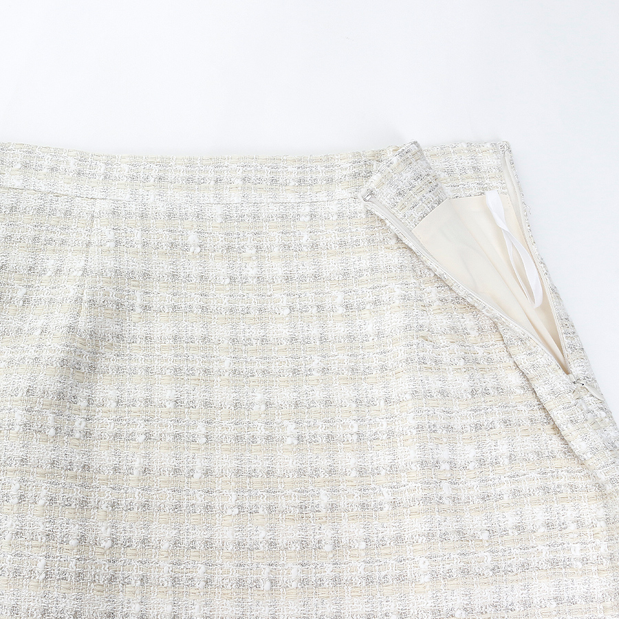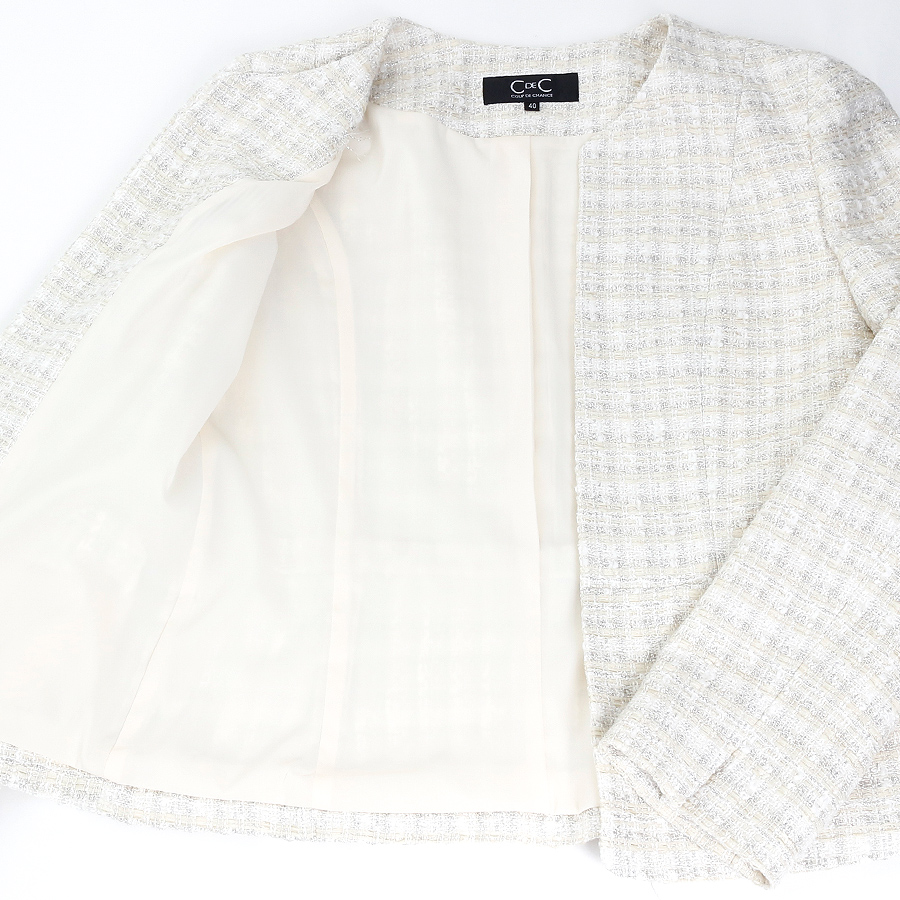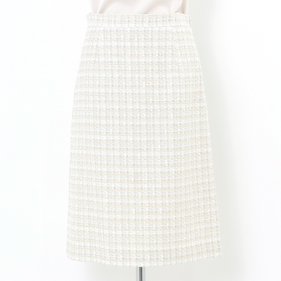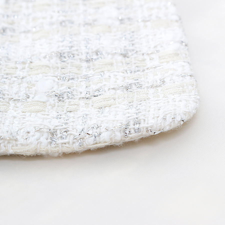 上品なラメ糸やテープヤーンなど意匠糸を使用した華やかなファンシーツィードのノーカラージャケットとスカートのセットアップ。
