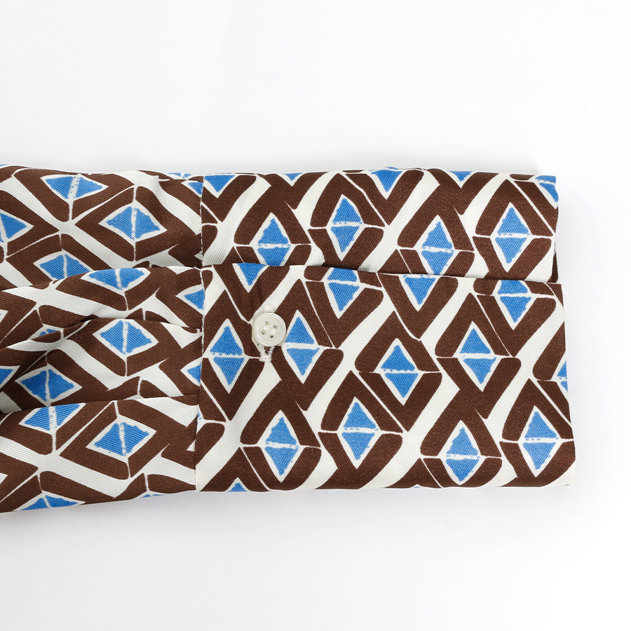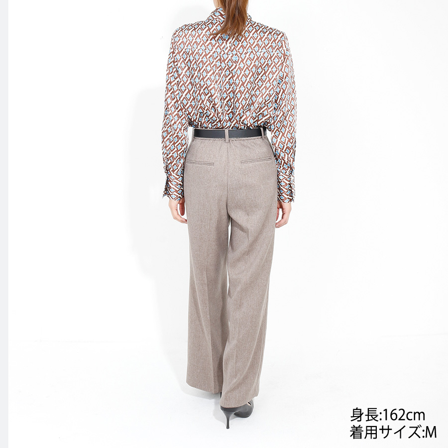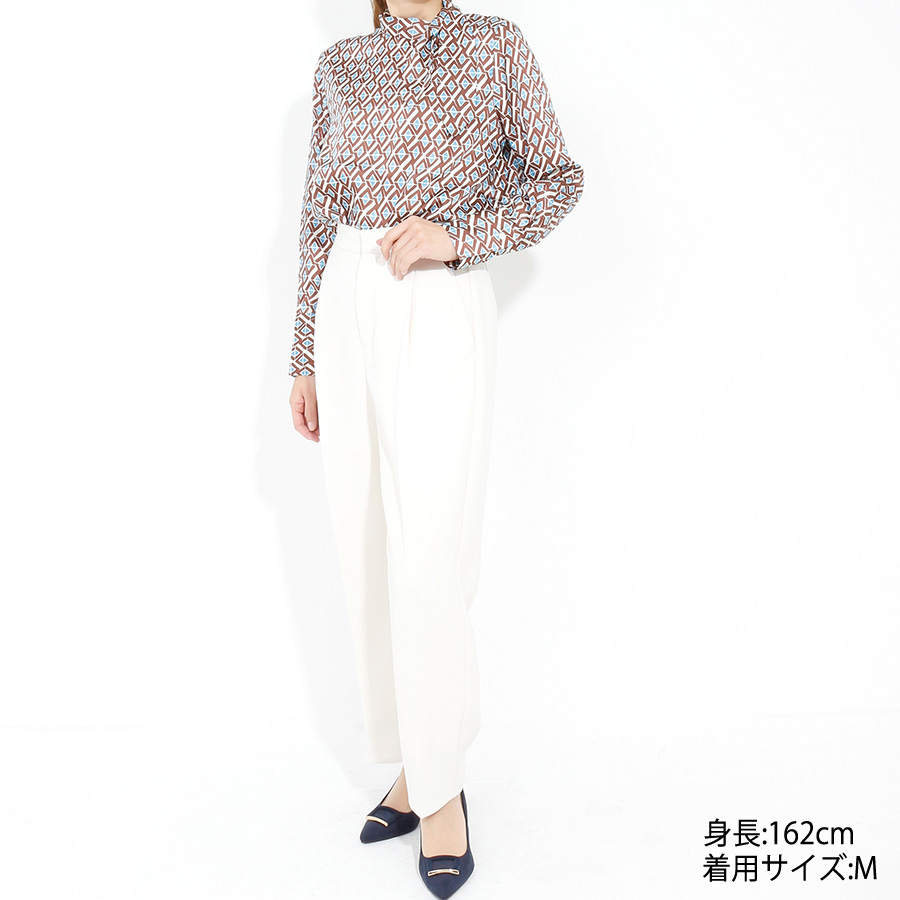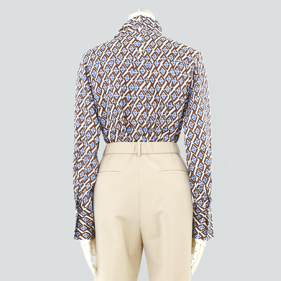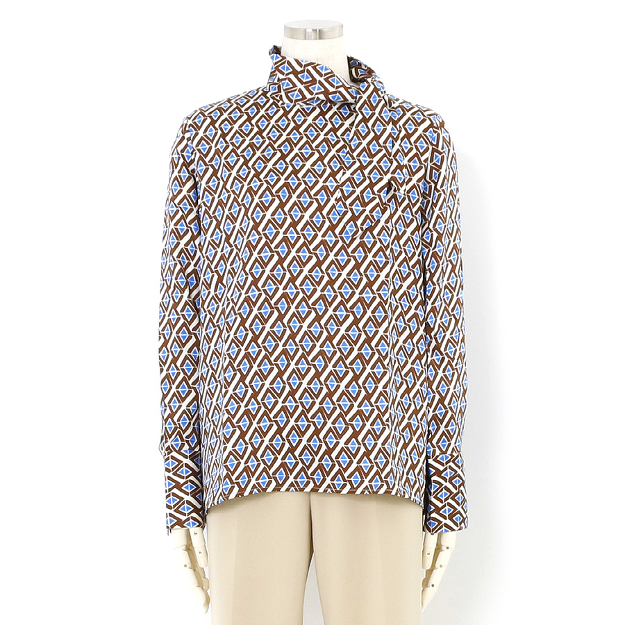★スタッフコメント★レトロな幾何学柄が目を惹くブラウス。さらりとした光沢感のある生地が上品な印象を演出します。首元のタイ風デザインがこなれ感をプラス。ジャケットと合わせれば、ビジネスシーンにもぴったり。インでもアウトでもコーディネイトしやすいデザイン。女子会やパーティでの華やかコーデにもおすすめです。こちらは未使用商品です。