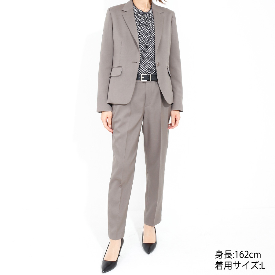 上品なグレージュカラーが魅力のテーラードカラーのセットアップスーツ。【ジャケット】