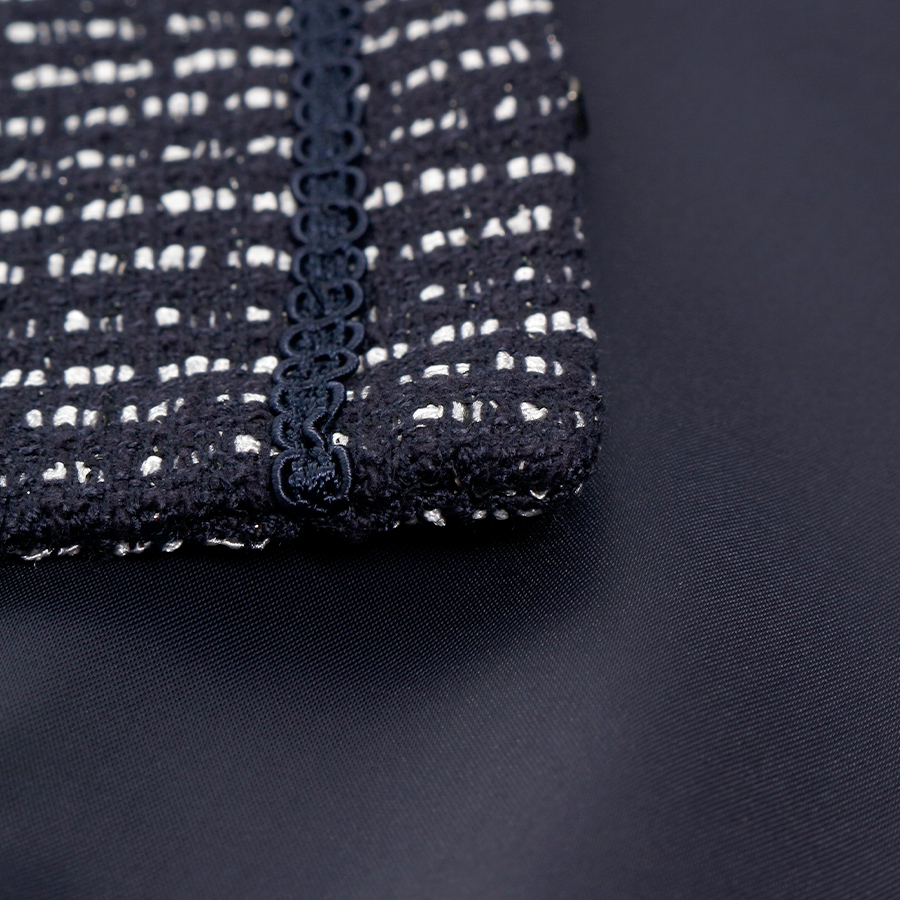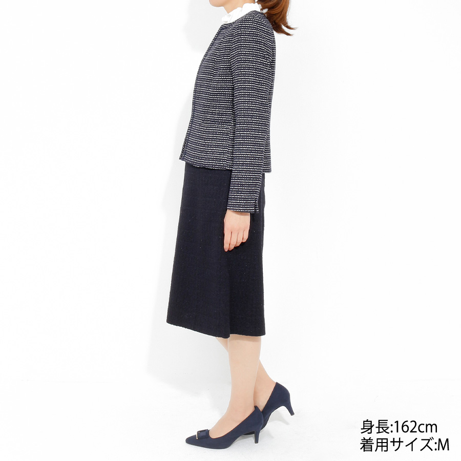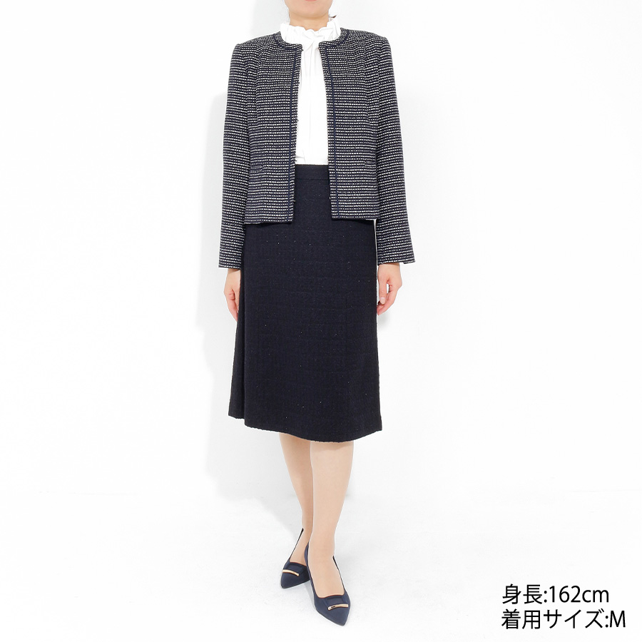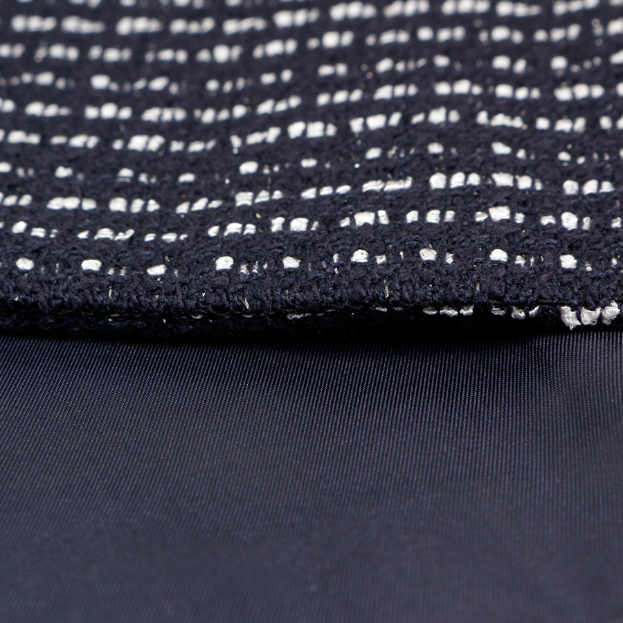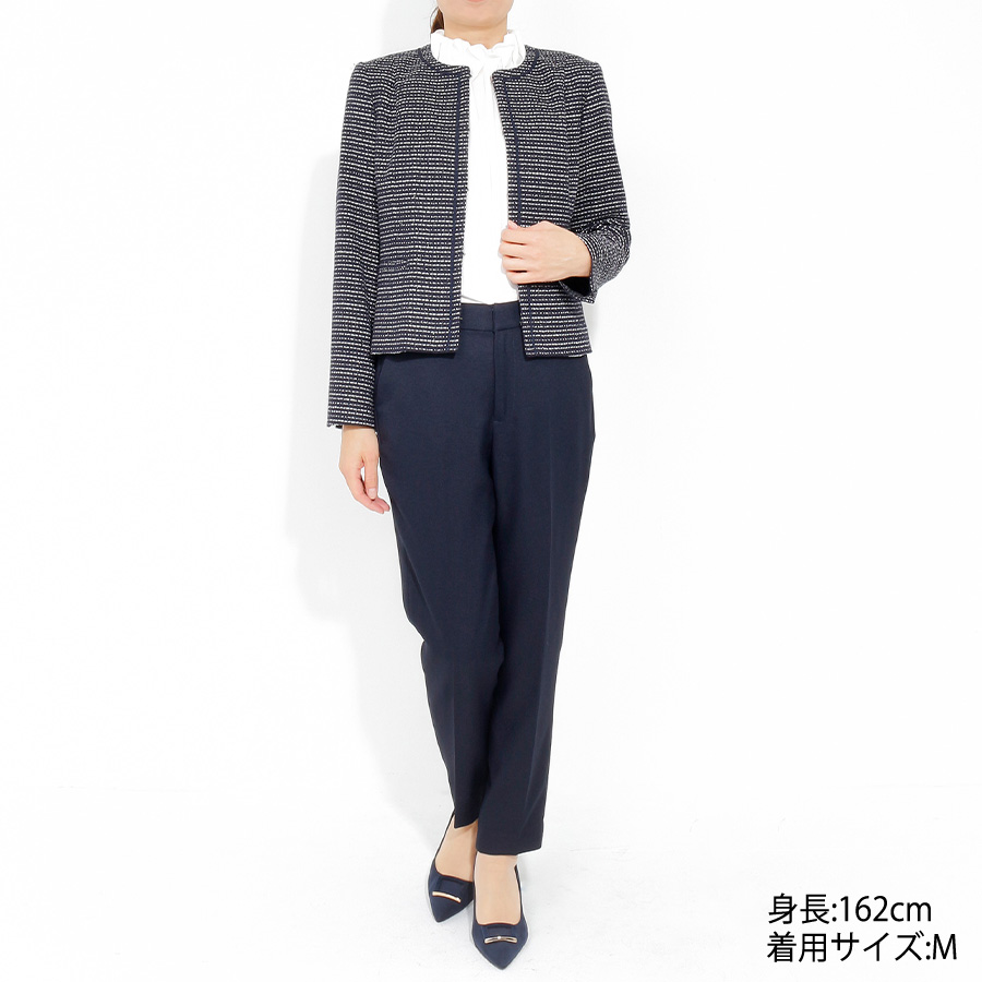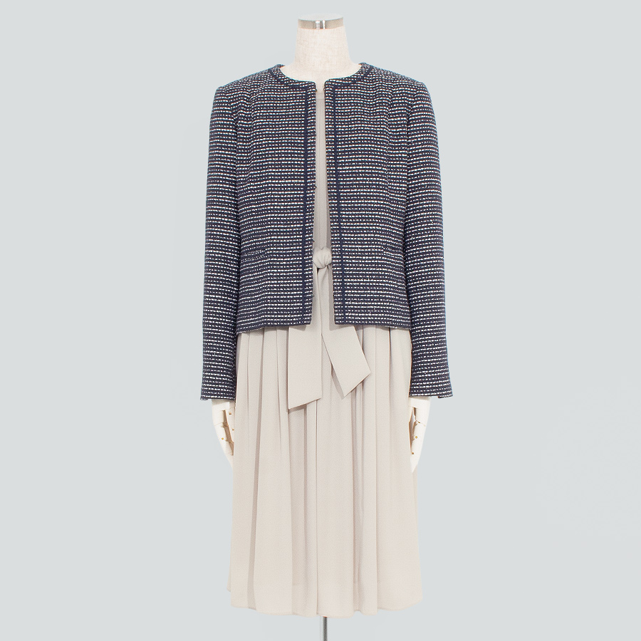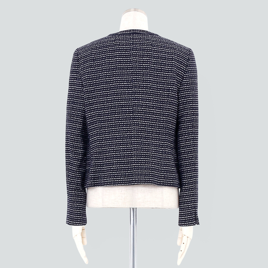 ネイビー×ホワイトのミックスツイードが華やかなノーカラージャケット。