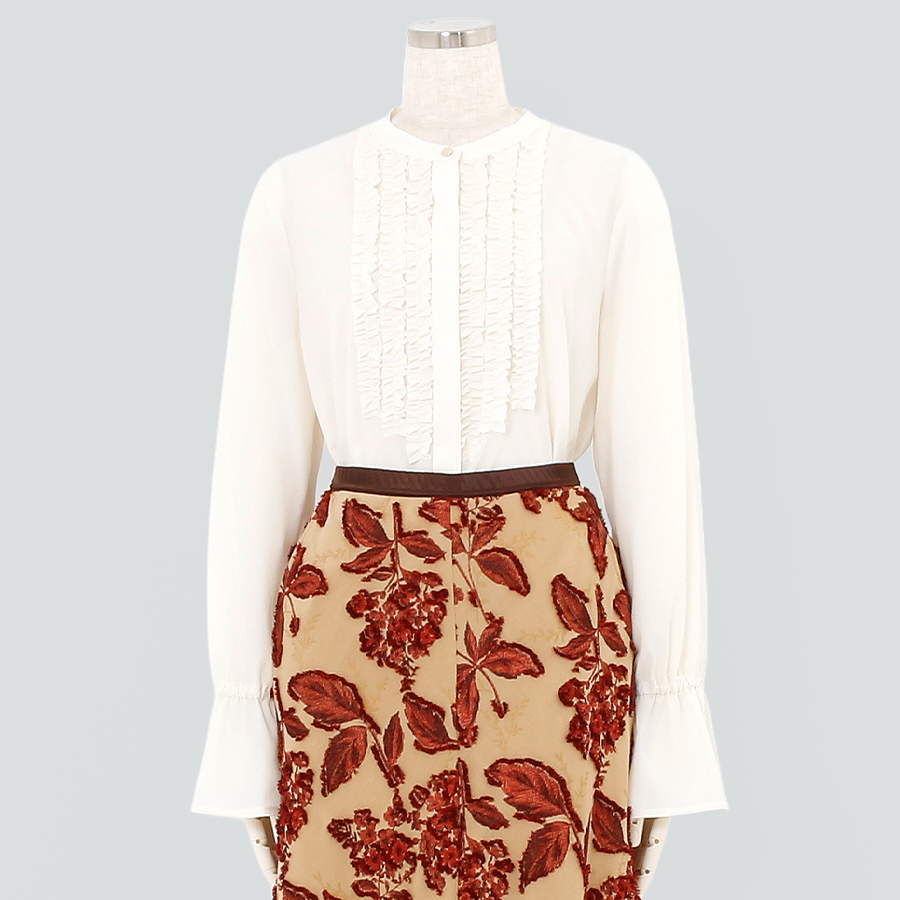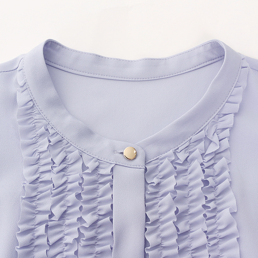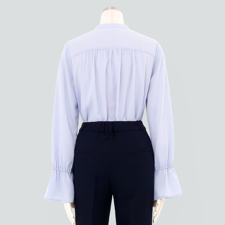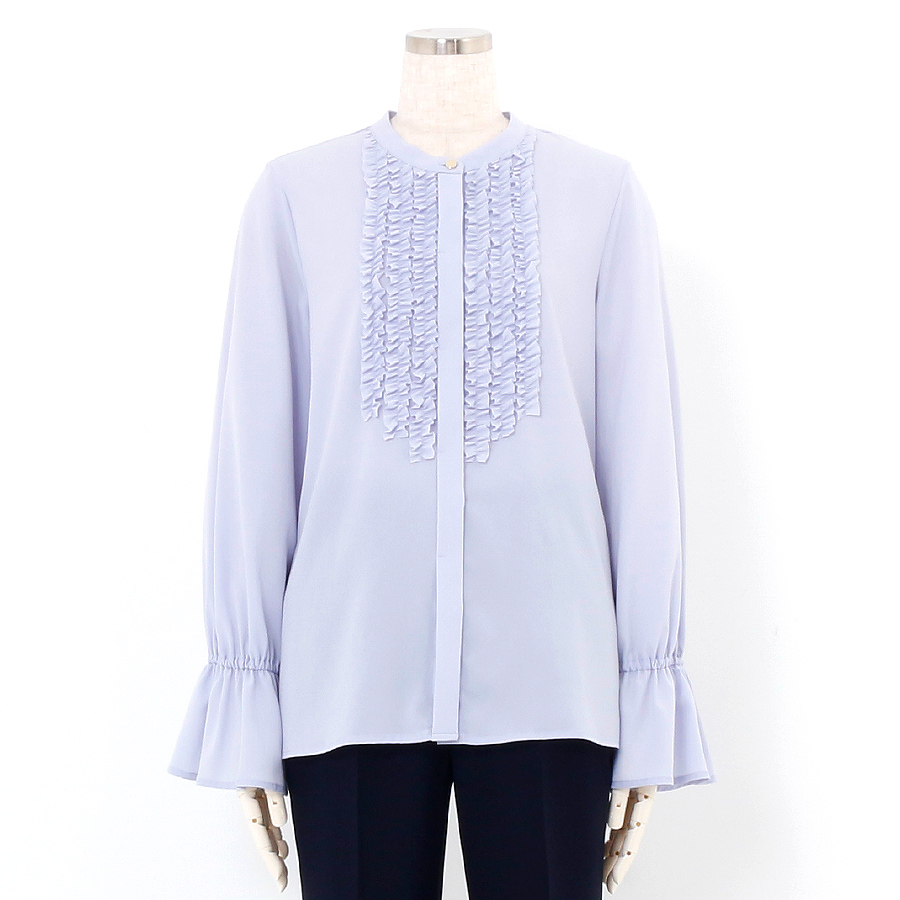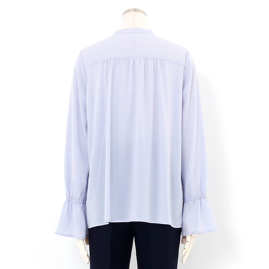 ★スタッフコメント★繊細なフリルが印象的なスタンドカラーのブラウス。ふんわりと広がるベルスリーブが女性らしさを引き立て、優雅なシルエットを演出します。落ち着いたラベンダーカラーで、ビジネスや女子会、セレモニーにもぴったりの上品な一枚です。こちらは未使用商品です。