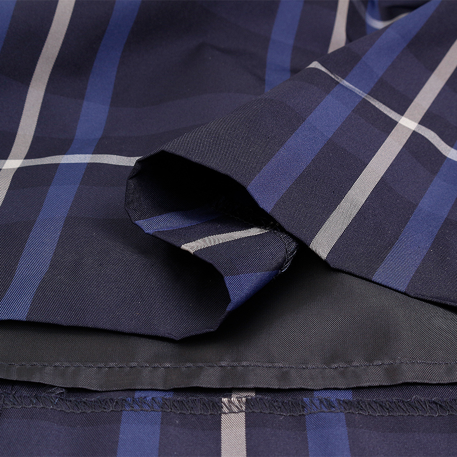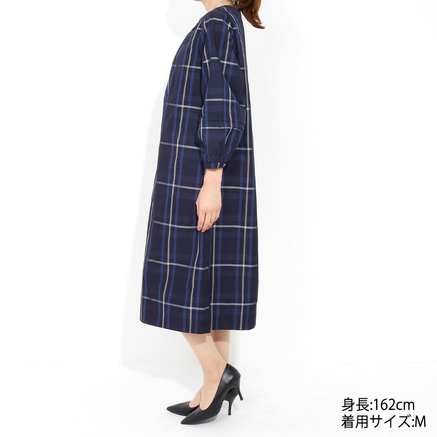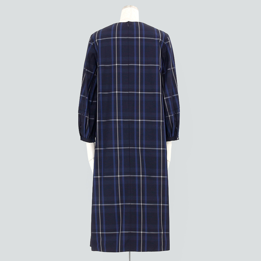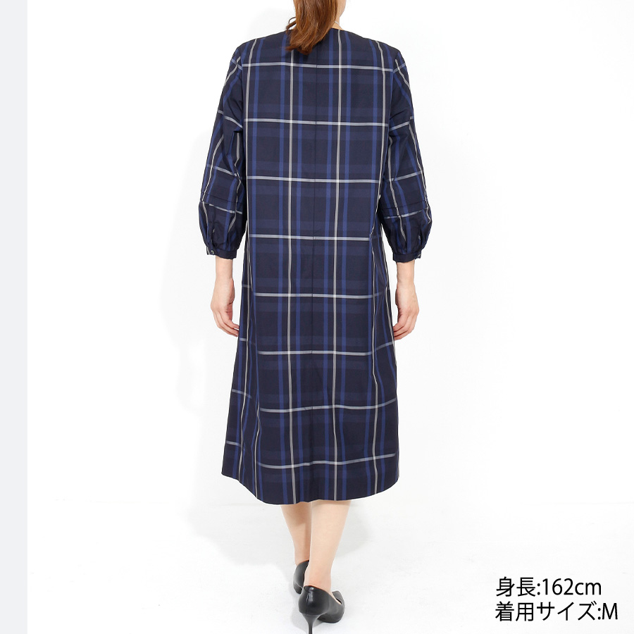 落ち着いたネイビーベースのチェック柄ワンピース。