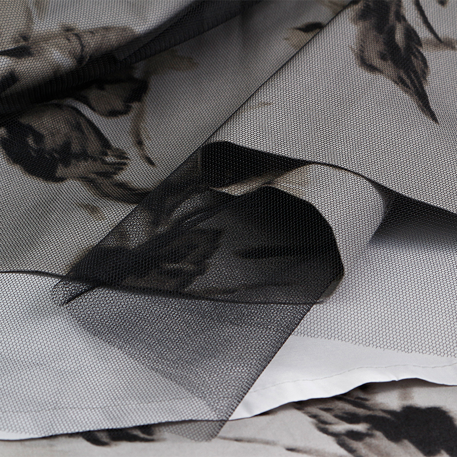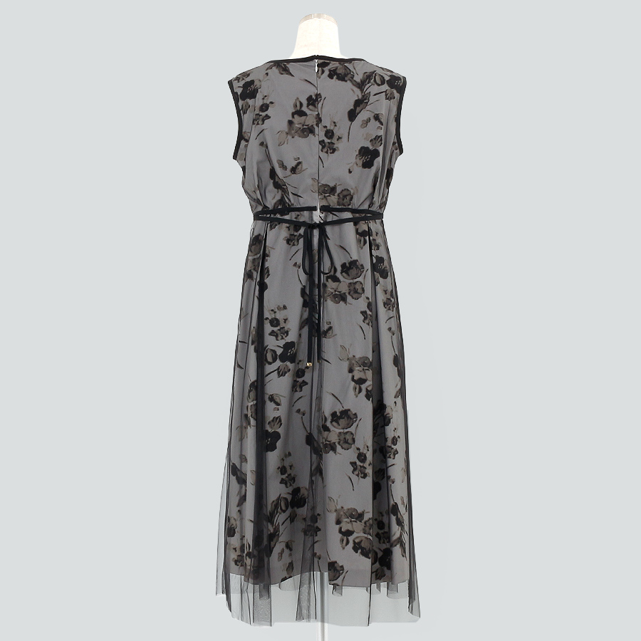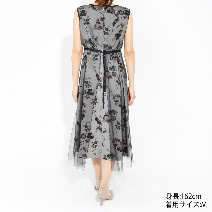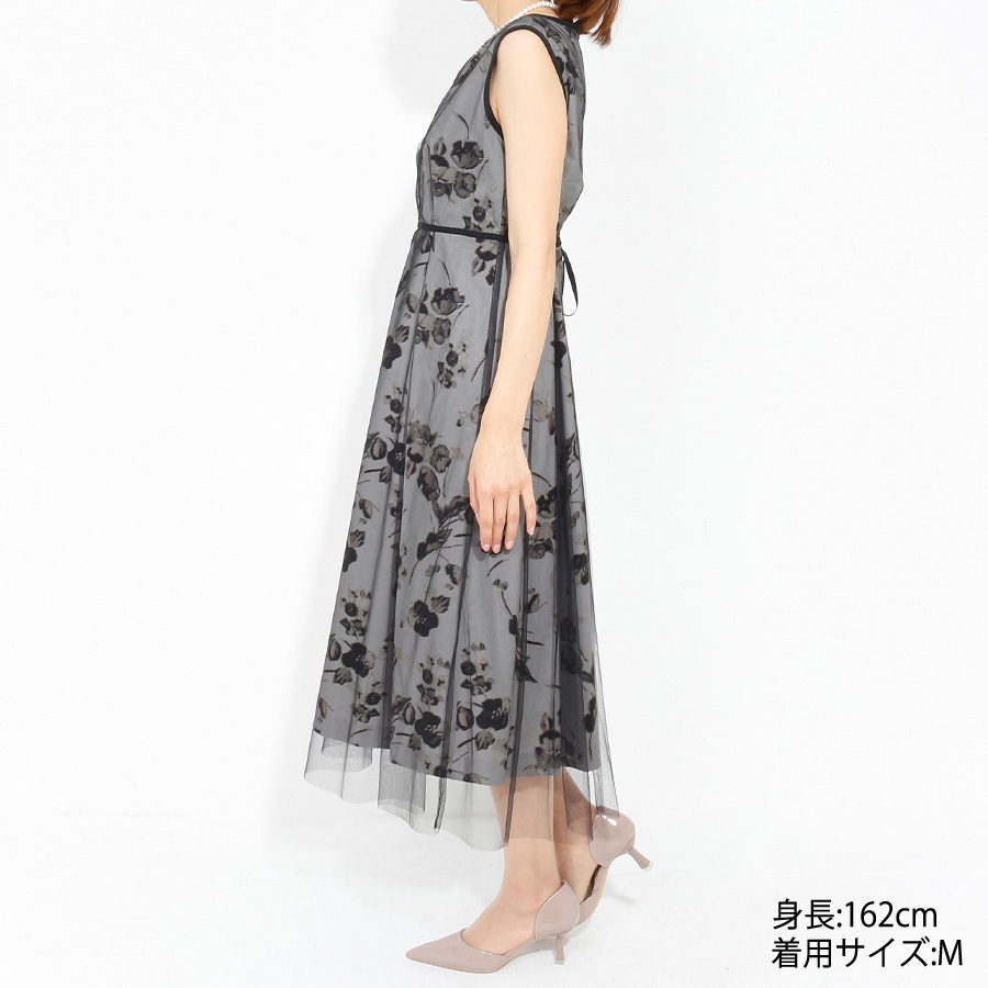 繊細なチュールと上品なフラワープリントが魅力のワンピース。