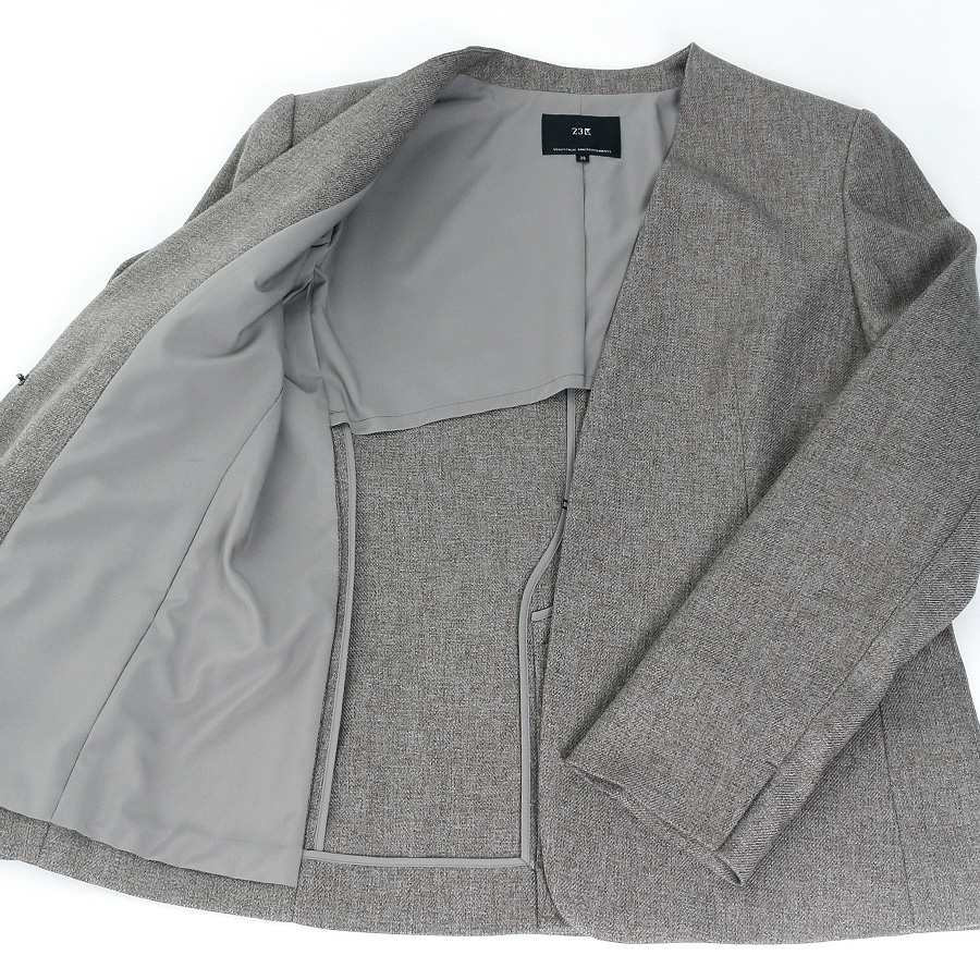 柔らかな杢調生地が上品な印象を与えるノーカラージャケット。