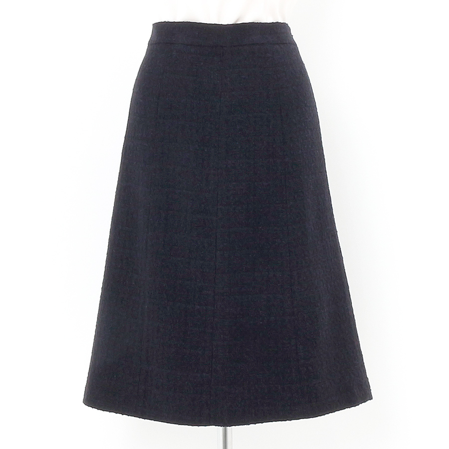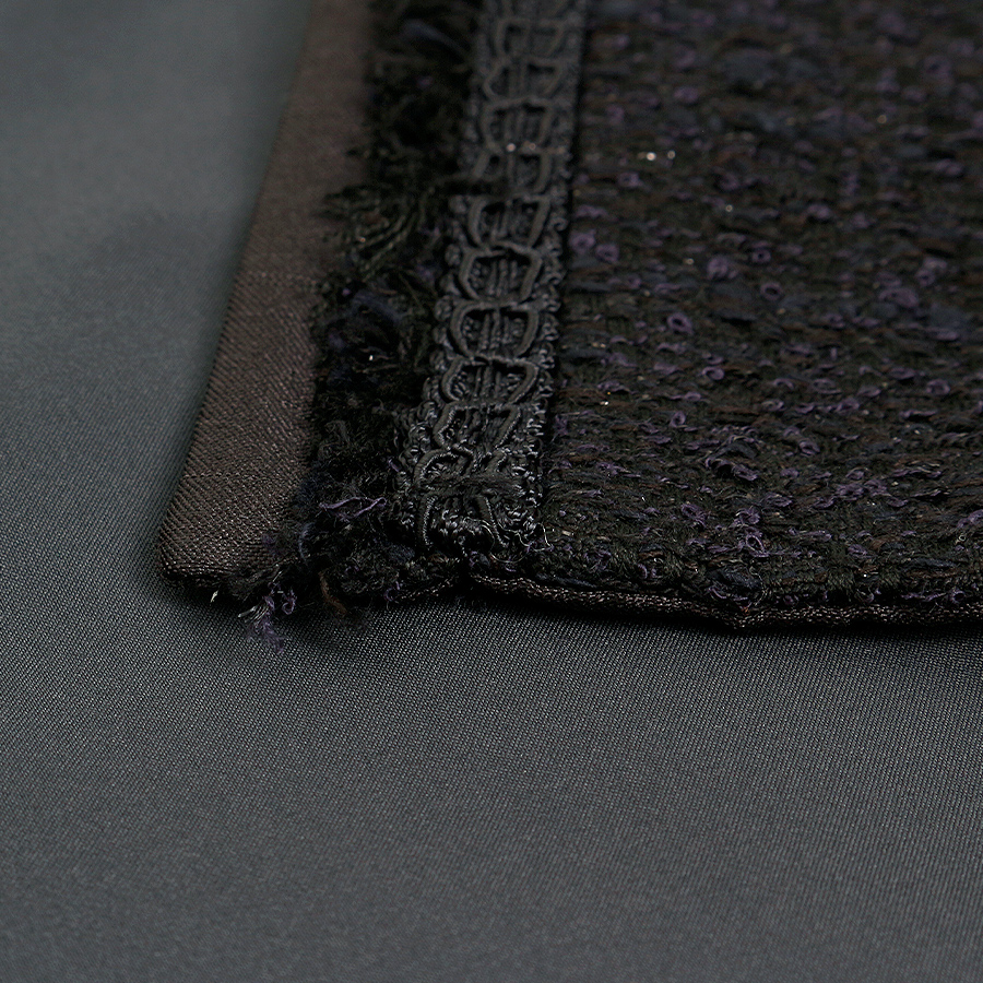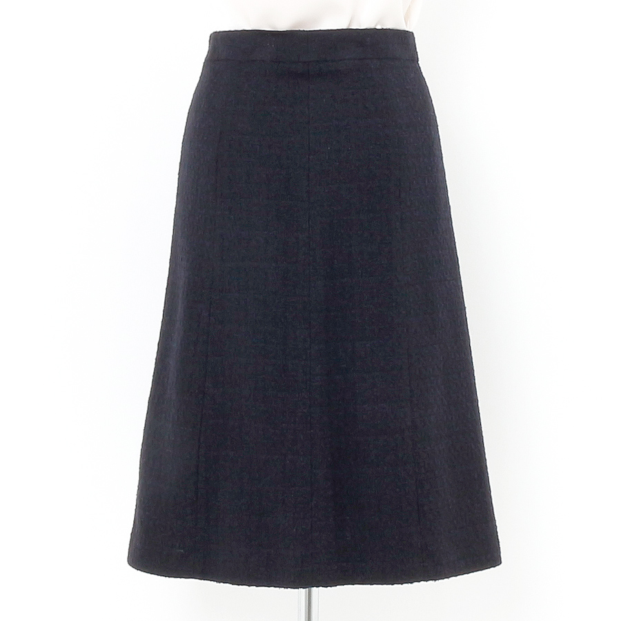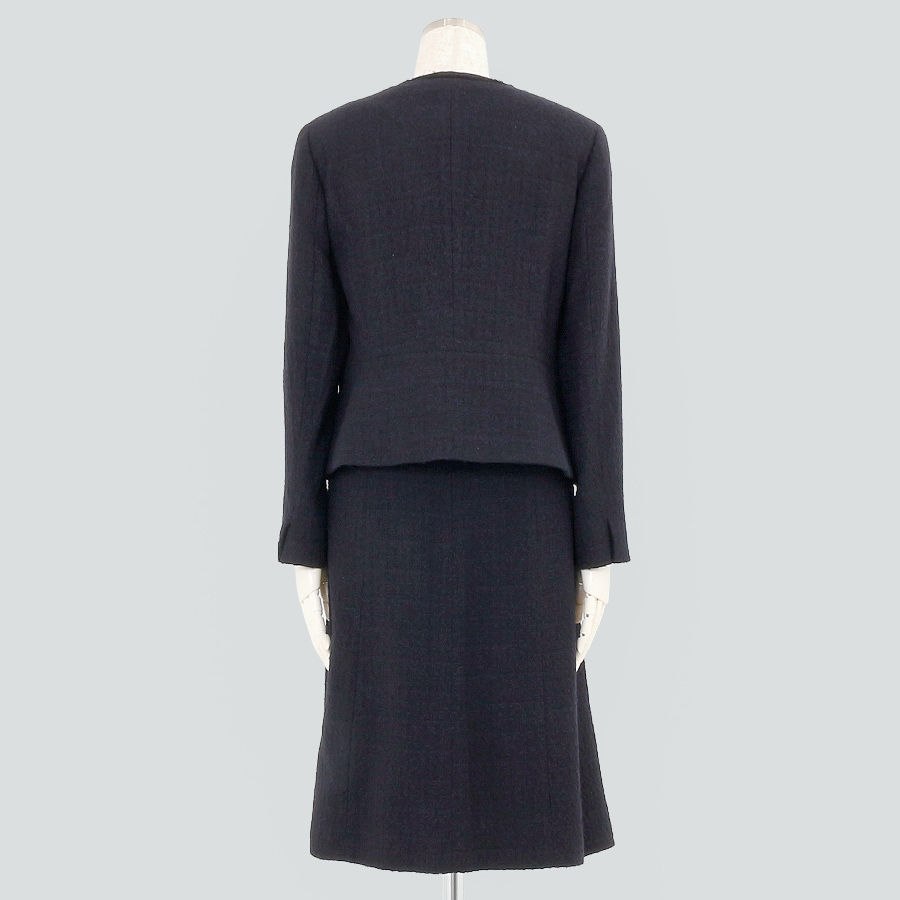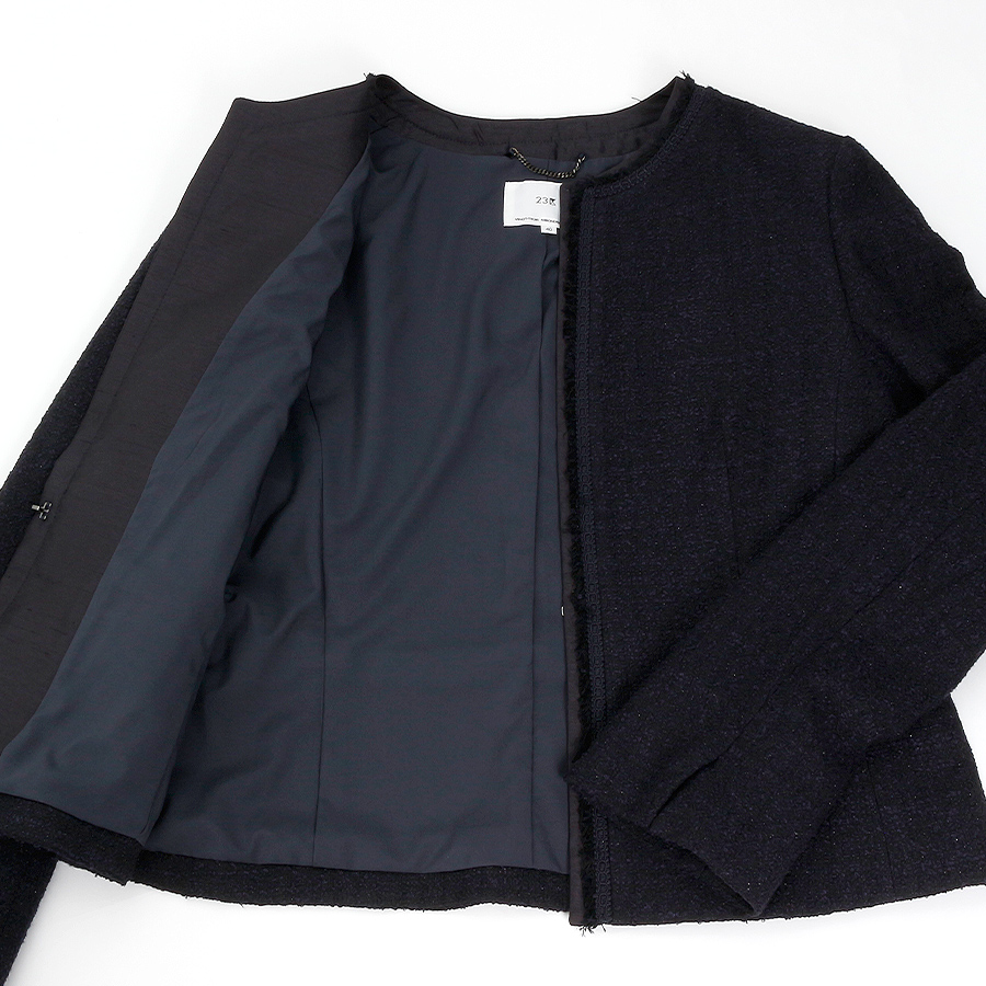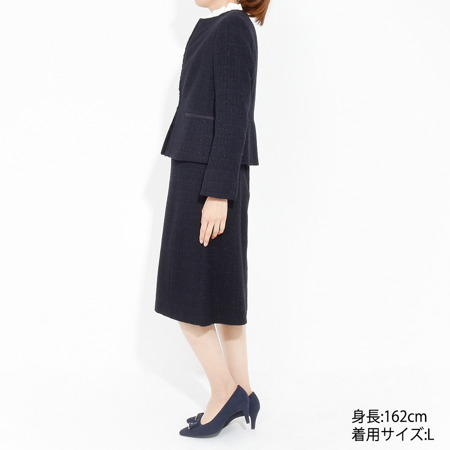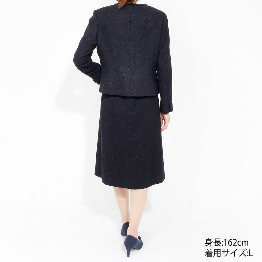 上品なツイード素材が魅力のノーカラージャケットとスカートのセットアップ。