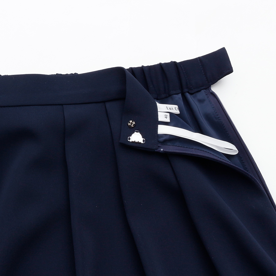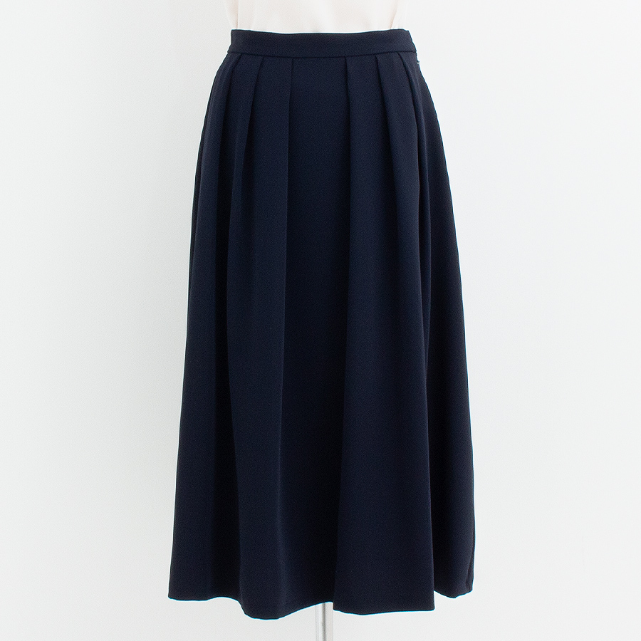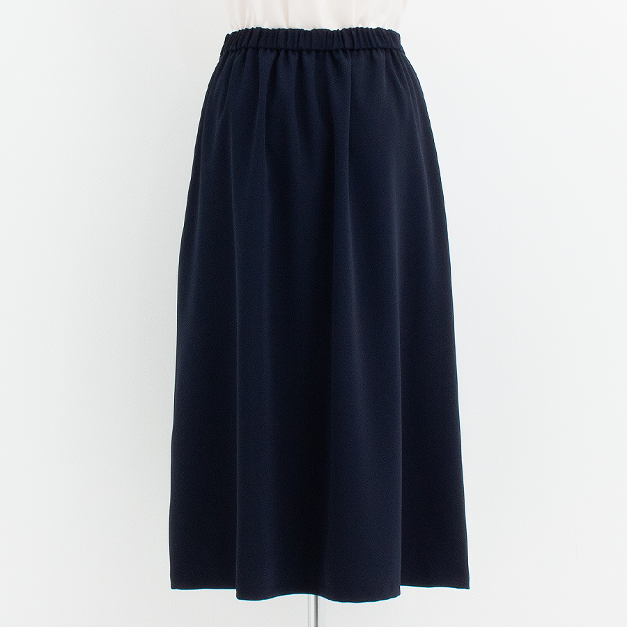 シンプルながら美シルエットを叶えるネイビーのセミロングスカート。