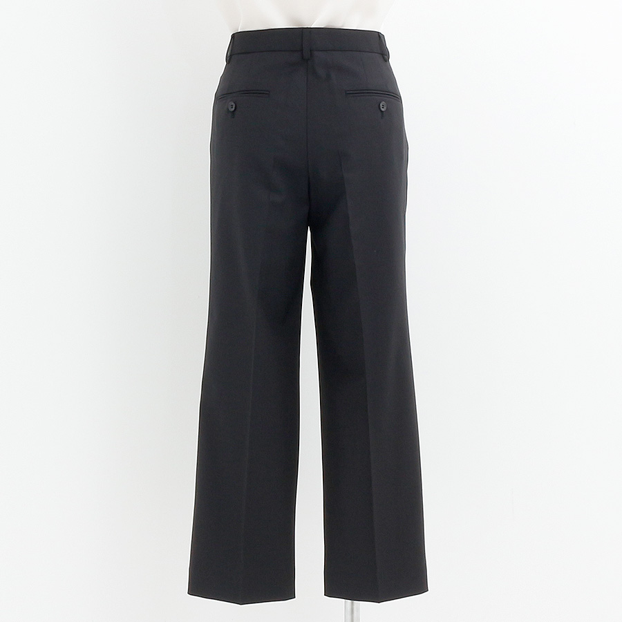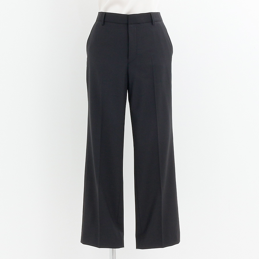 ストレートラインのパンツで、縦のラインを強調し脚長効果も◎。