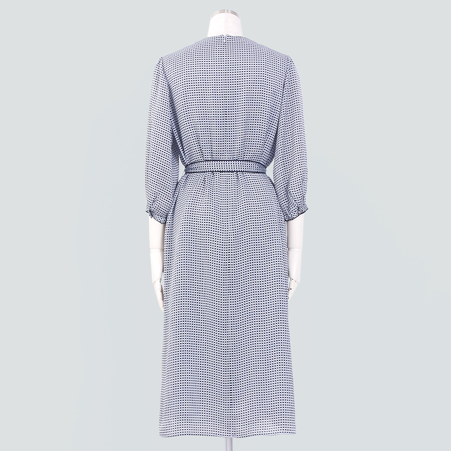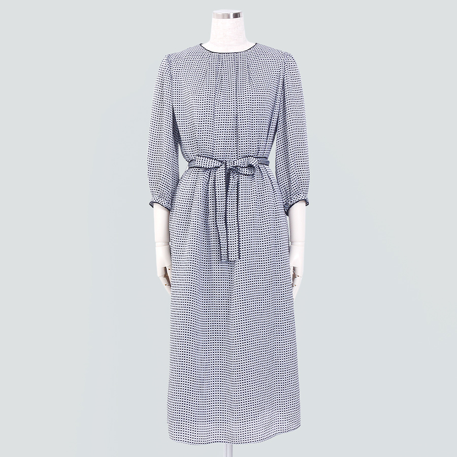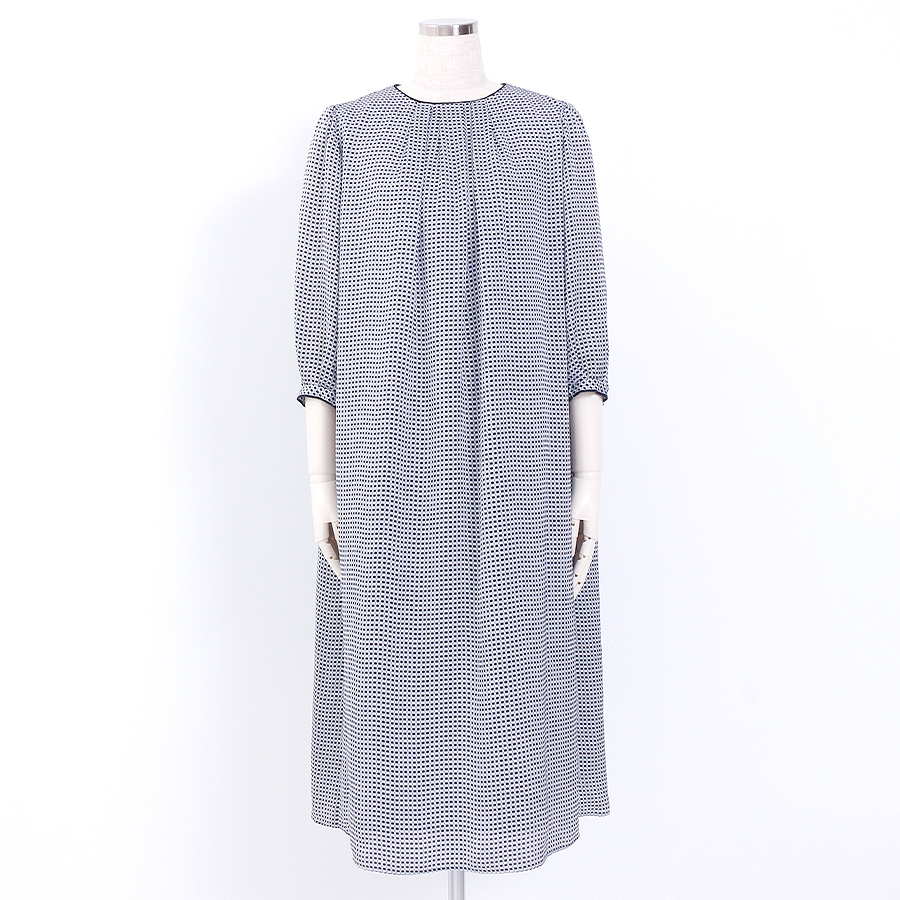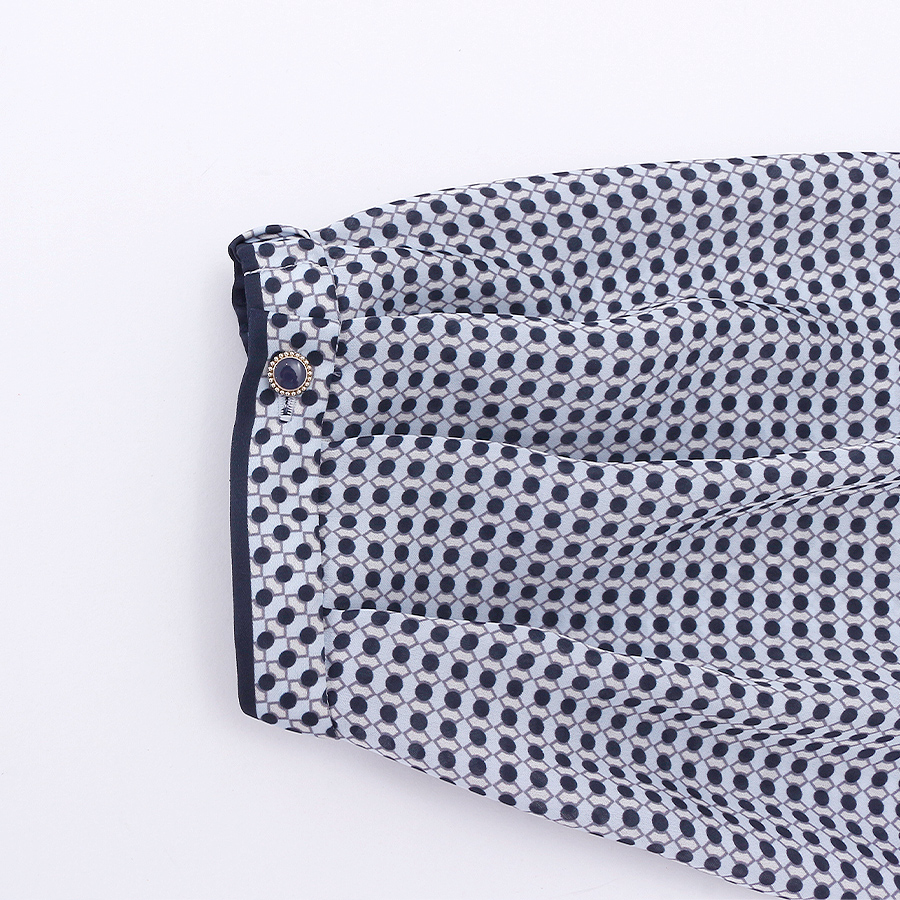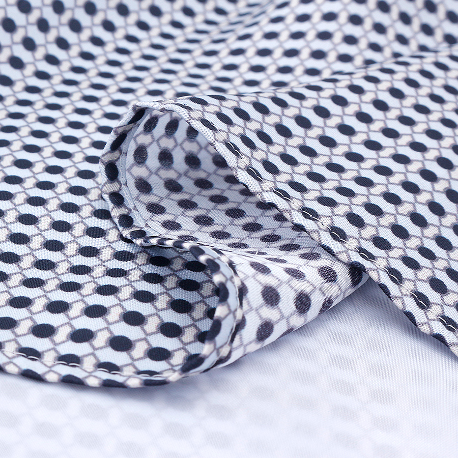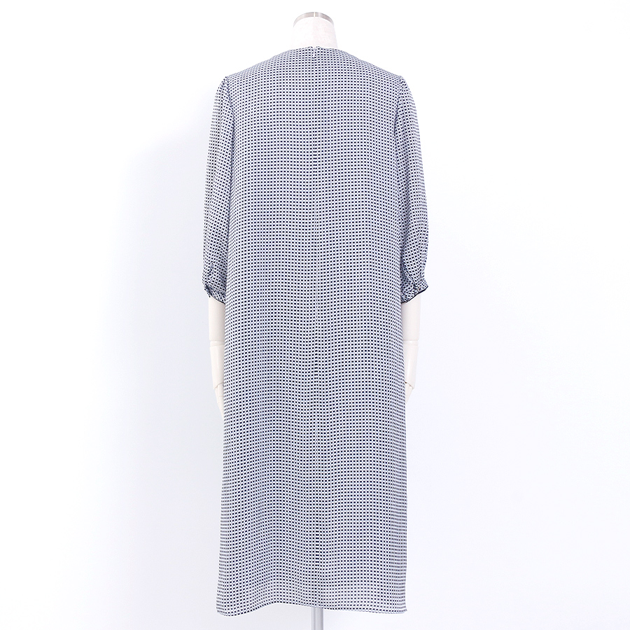 素材はジオメトリックなドットモチーフがプリントされたシルクのような光沢と発色性、しなやかな風合いが特徴です。