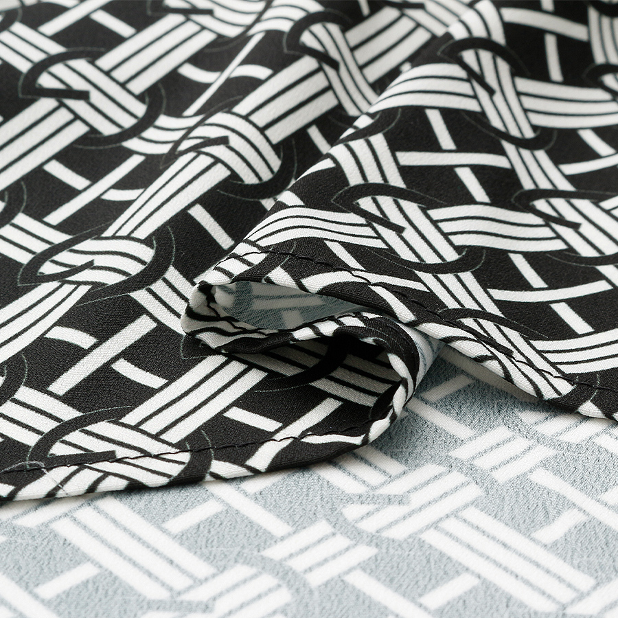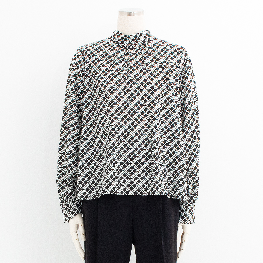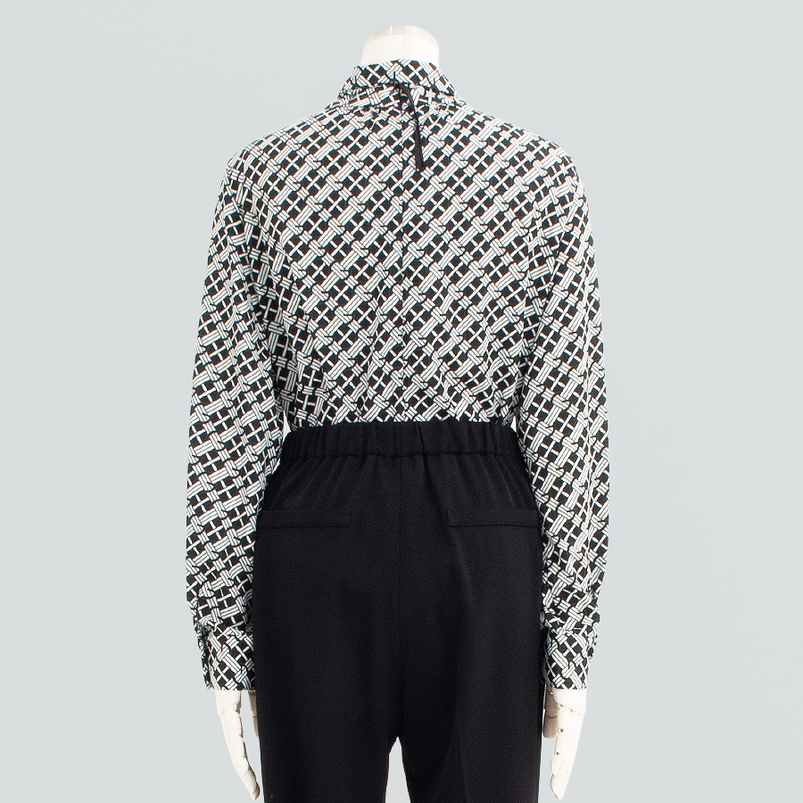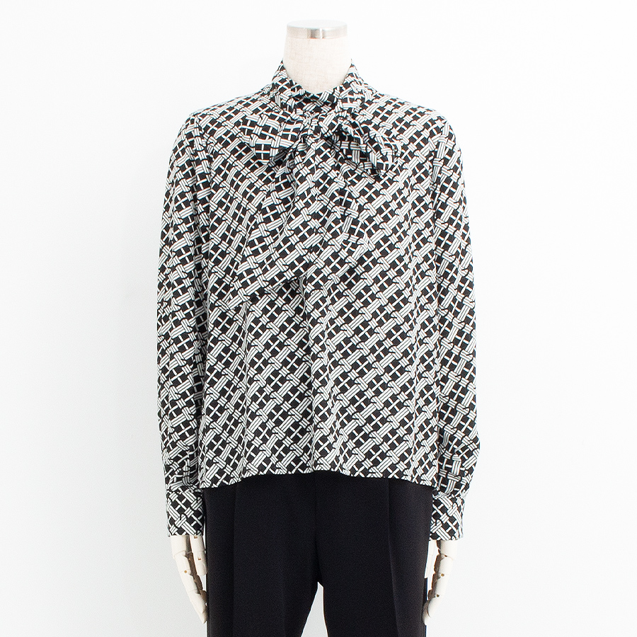 クラシカルな幾何柄が目を引くボウタイブラウス。