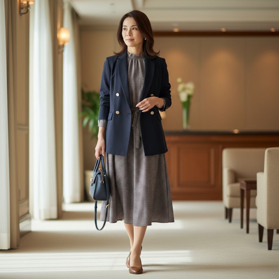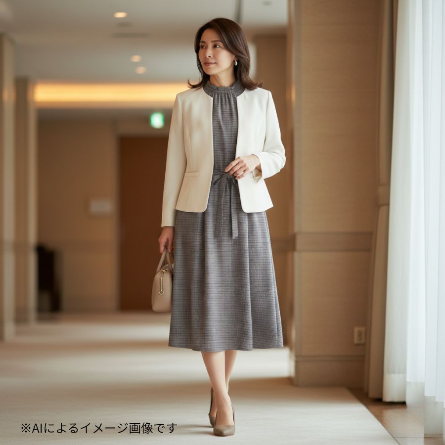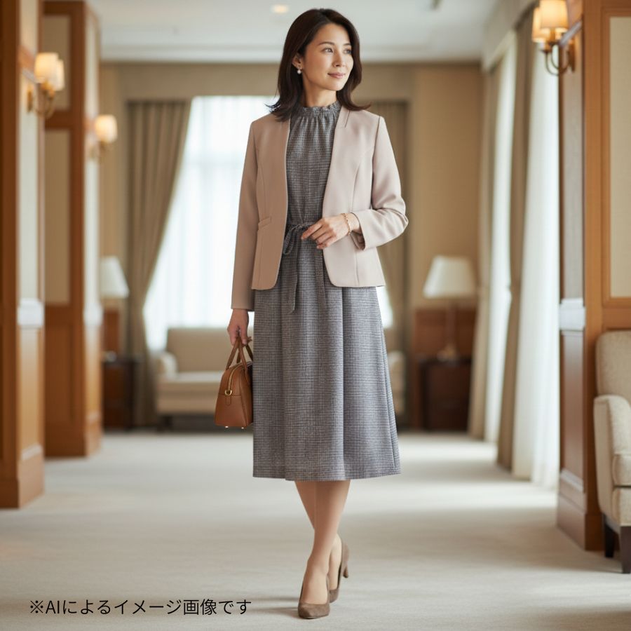 ジャケット合わせでビジネスはもちろん、女子会や、お出かけ、レジャーにも汎用性のある万能ワンピースです。