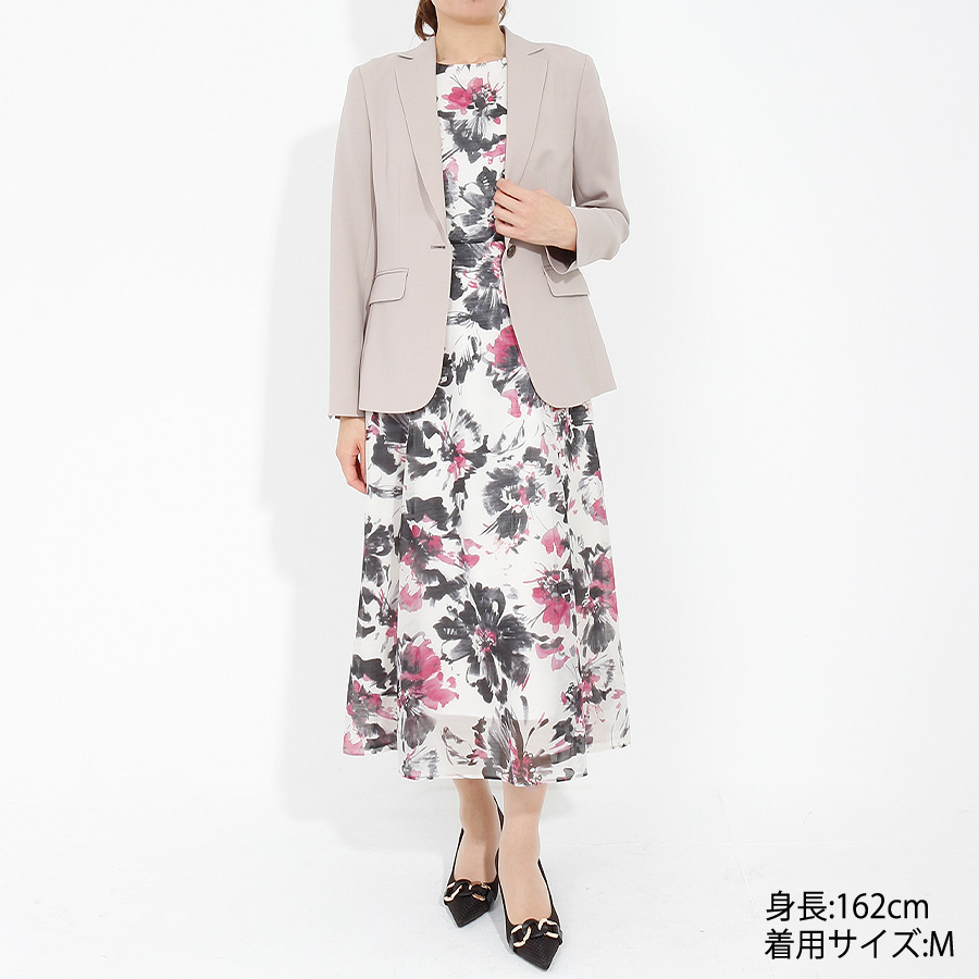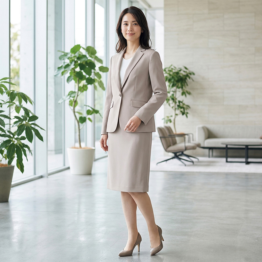 柔らかなベージュが上品な印象を与えるテーラードジャケットとタイトスカートのセットアップ。