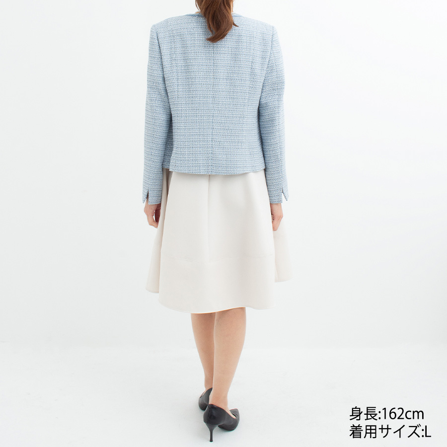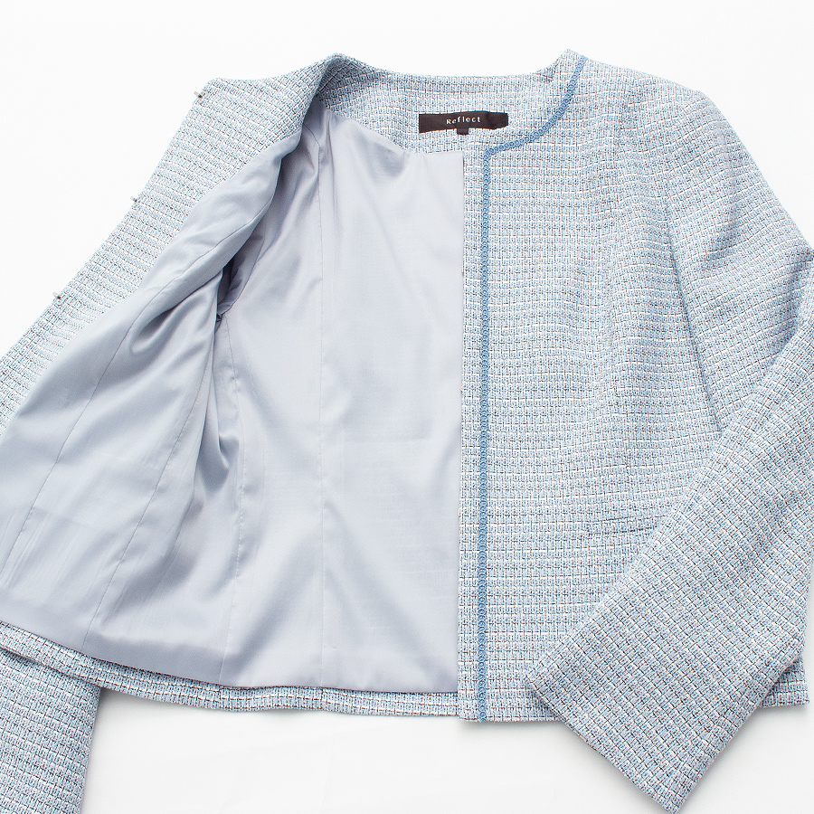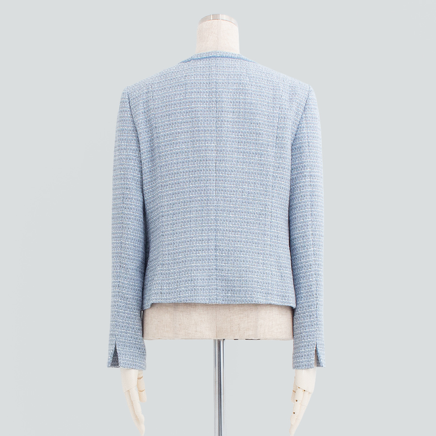 爽やかなライトブルーが印象的なツイードジャケット。
