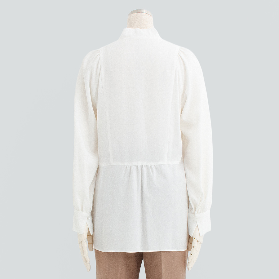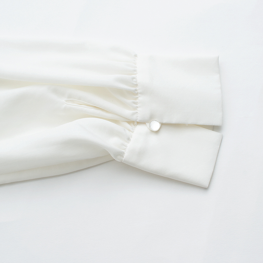 やわらかなアイボリーカラーが上品なボウタイブラウス。