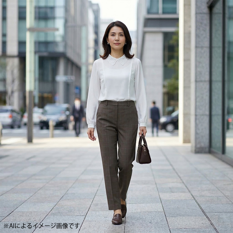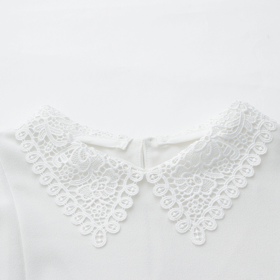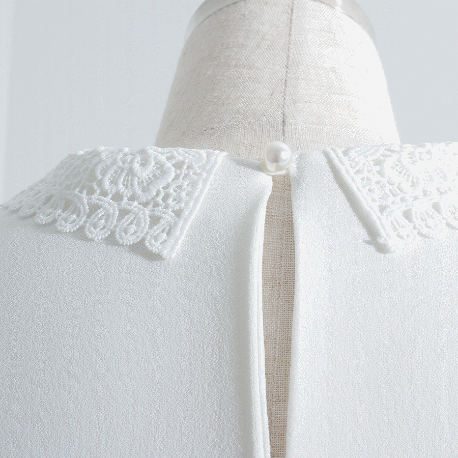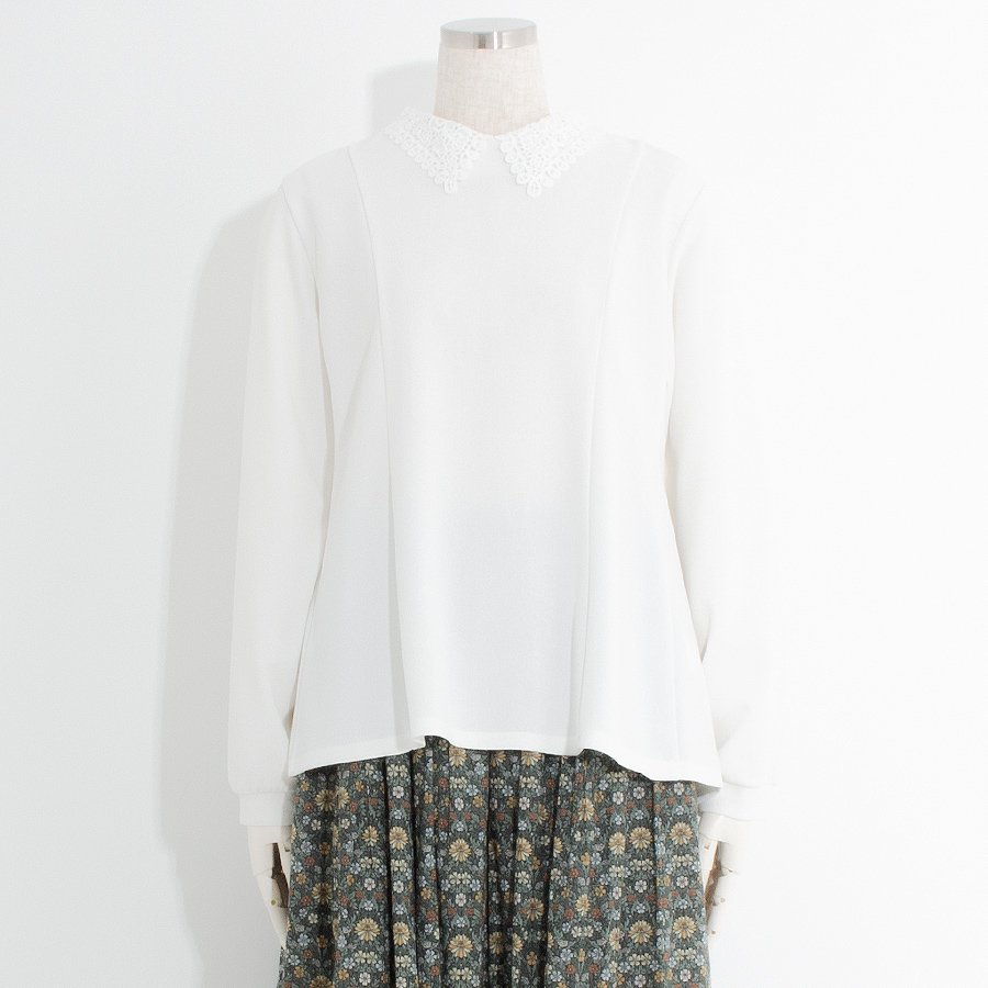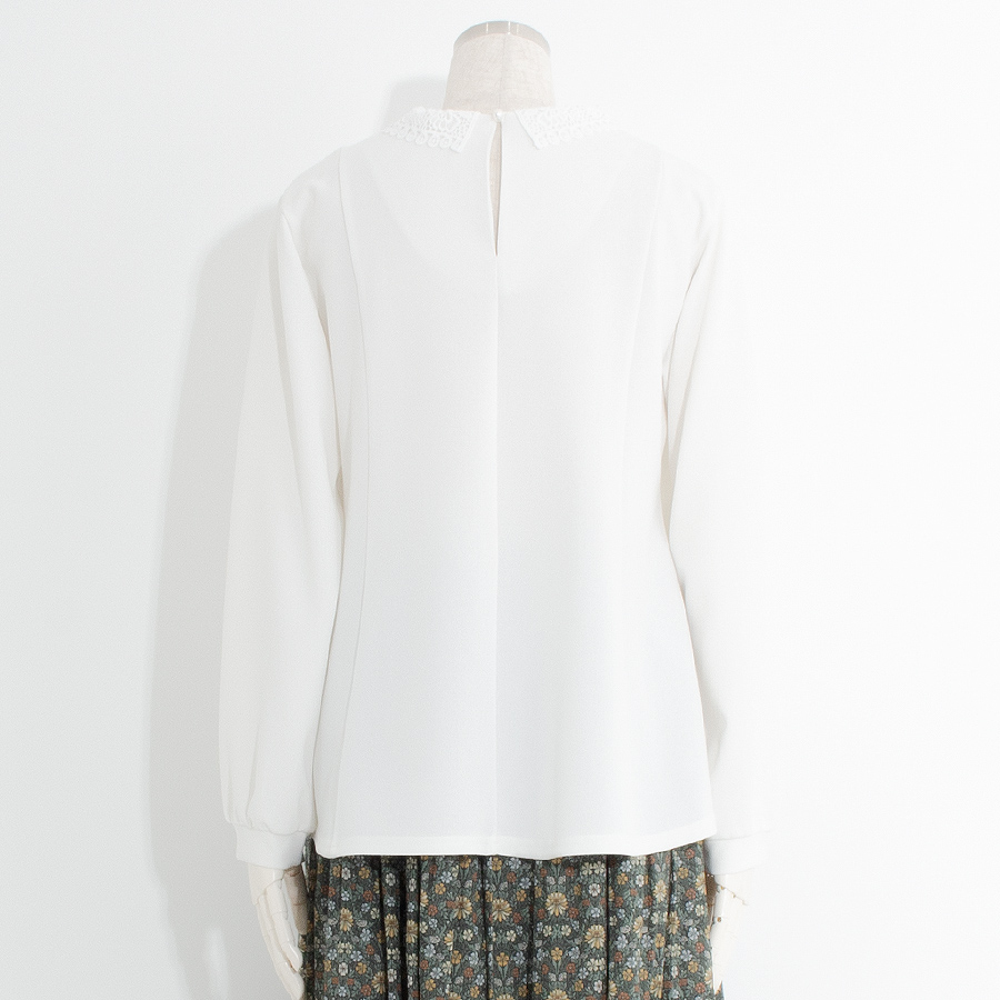 繊細なレースカラーが顔まわりを華やかに演出し、女性らしいやわらかな雰囲気を引き立てます。