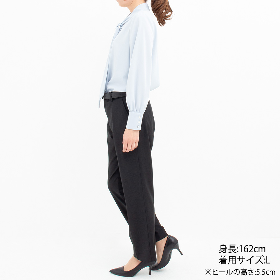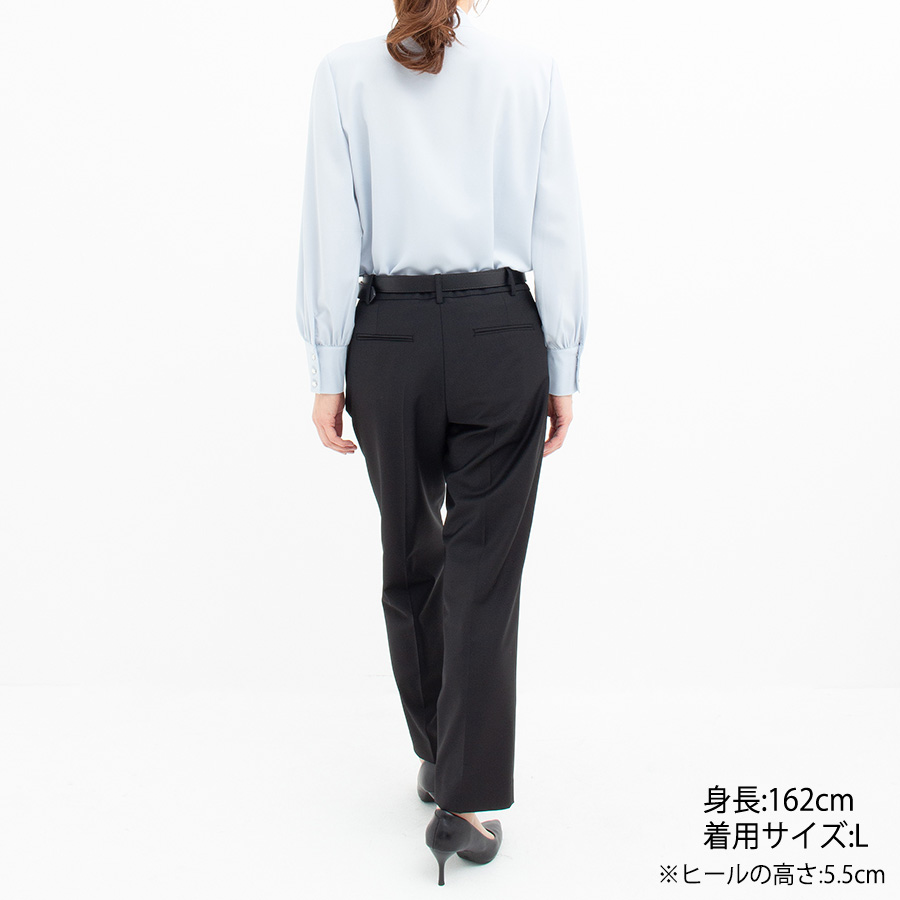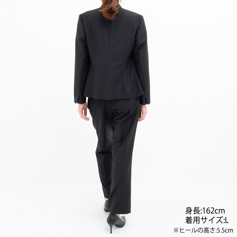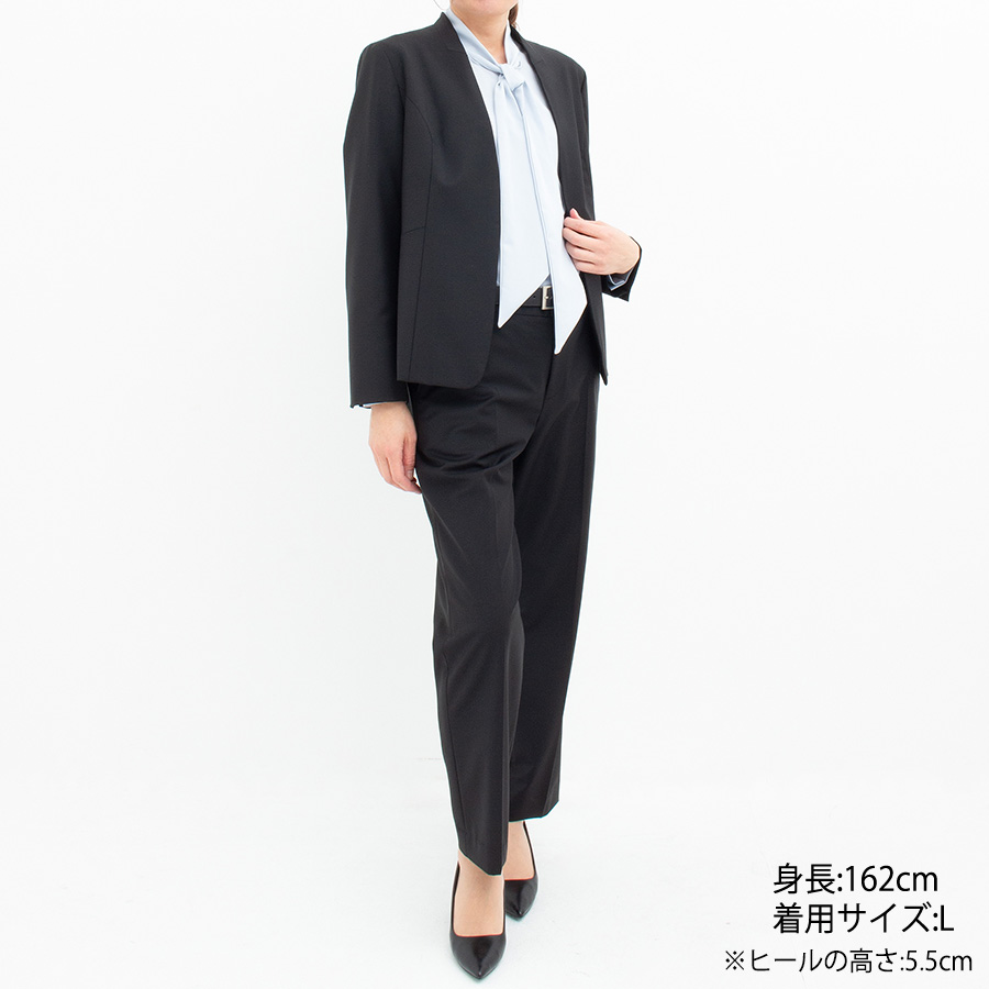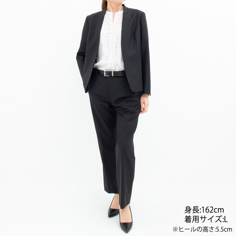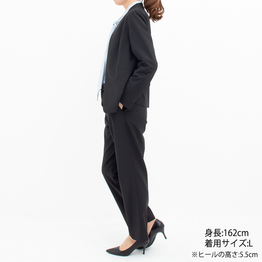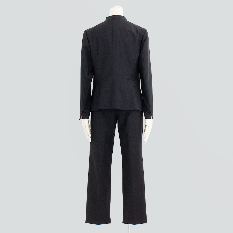 すっきりとしたノーカラーデザインのパンツスーツ。