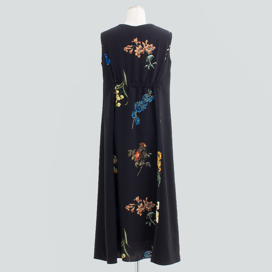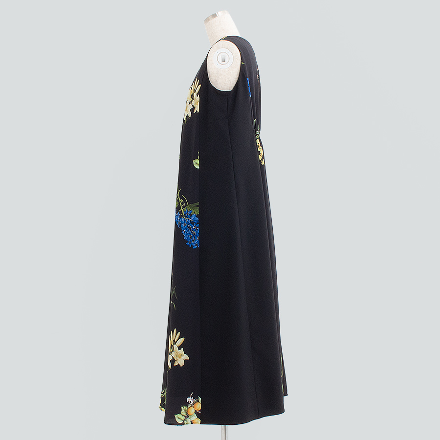 華やかなフラワープリントが映えるノースリーブワンピース。
