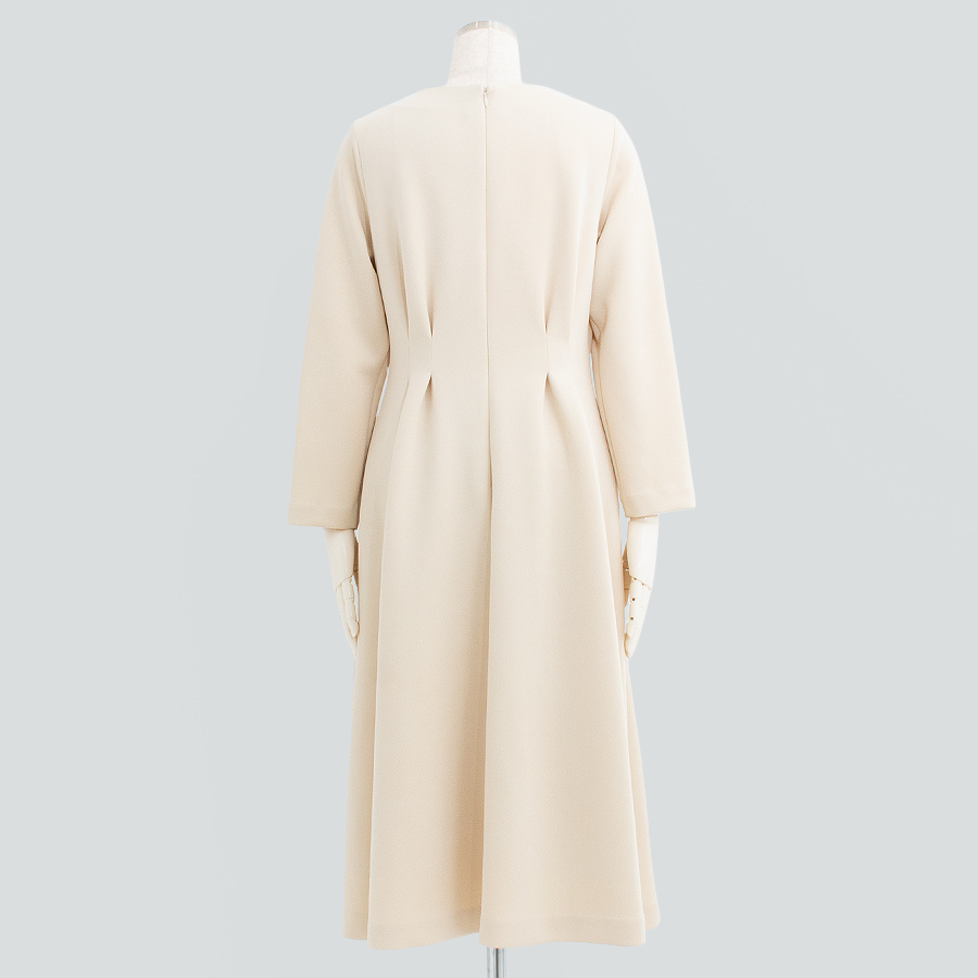 ウエストにタックを施し、自然に広がるフレアシルエットで女性らしさを演出します。