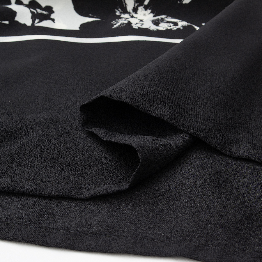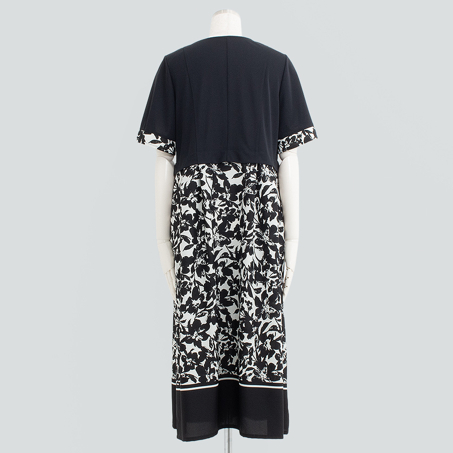 上身頃はシンプルに、スカート部分に大胆なフラワープリントを施したドッキングワンピース。