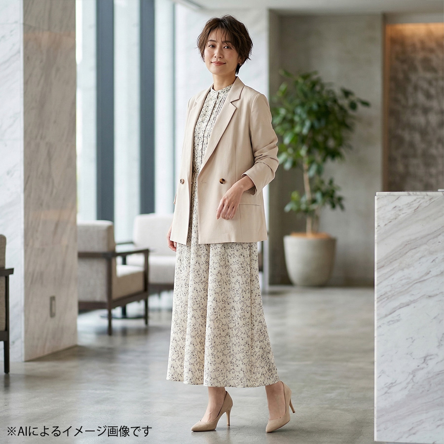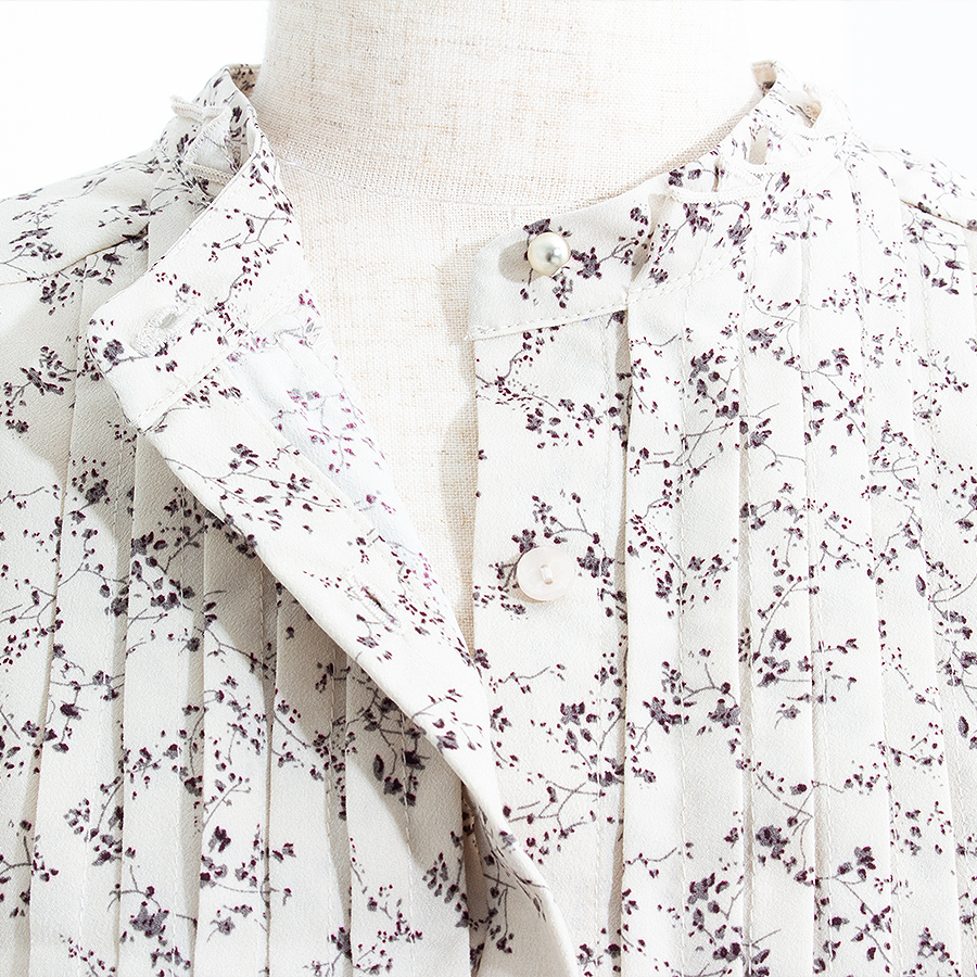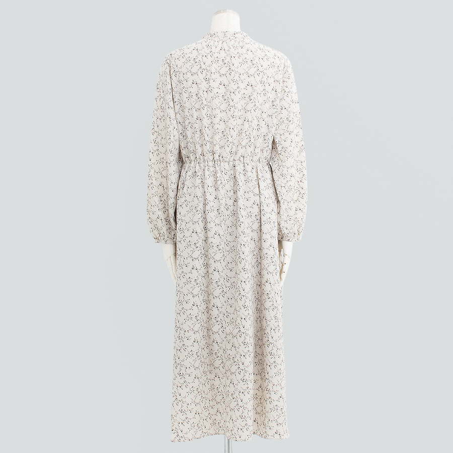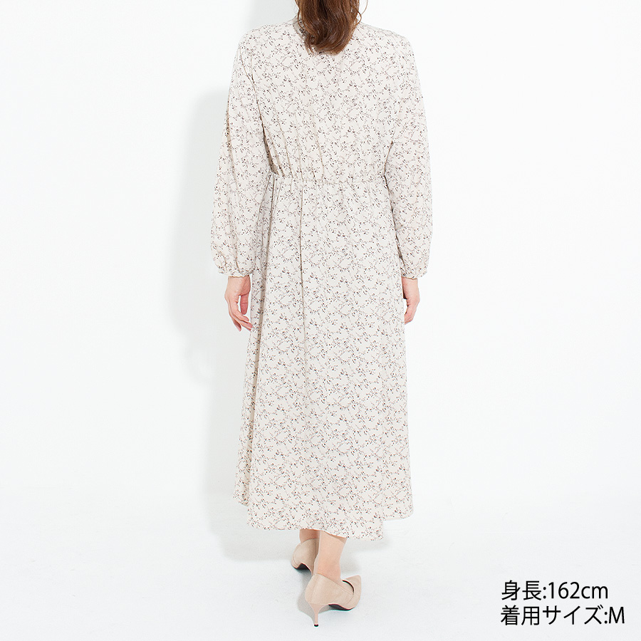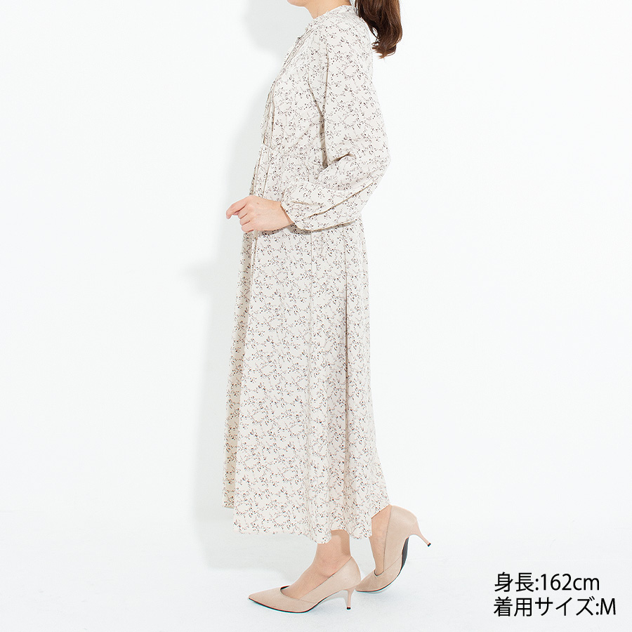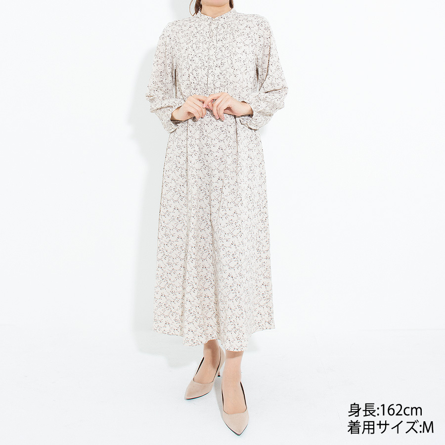 ★スタッフコメント★繊細な小花柄が上品に映えるワンピース。軽やかな素材感と程よいギャザーで、ふんわりとしたシルエットを演出します。スタンドカラーとフロントタックがきちんと感をプラス。一枚ではもちろん、ジャケット合わせでビジネスやセレモニーにも活躍。女子会やパーティにもおすすめの、優雅で女性らしい一着です。※スカート部分裏地付きこちらは未使用商品です。
