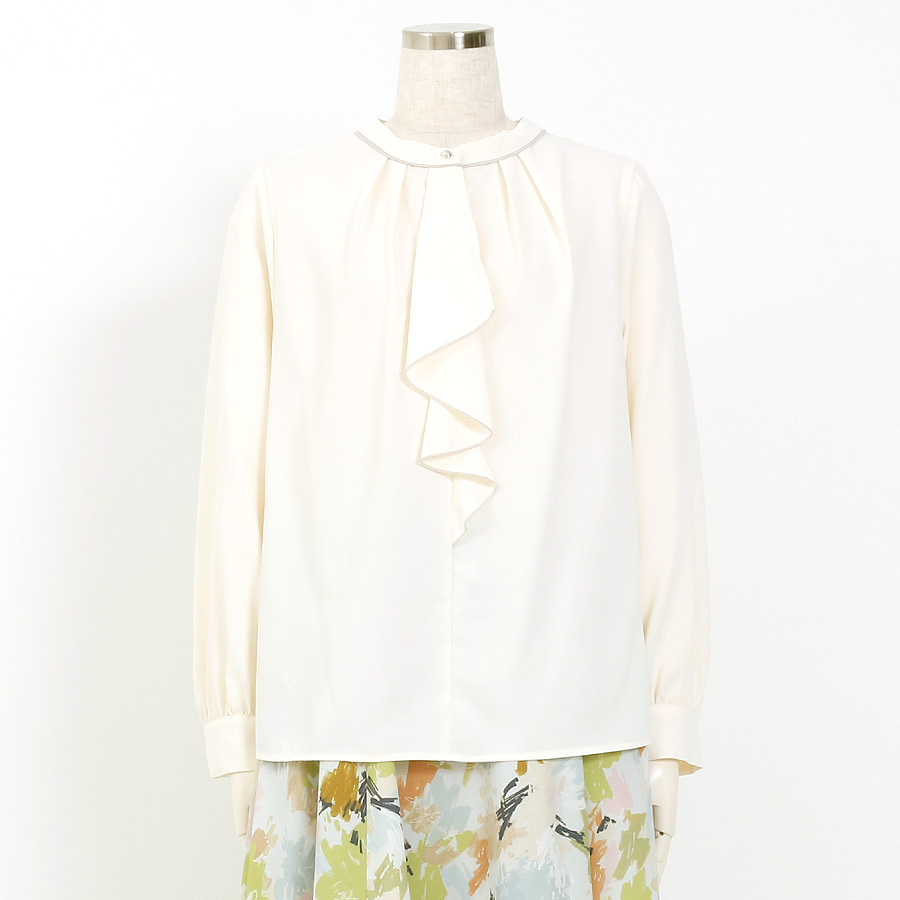 フロントのラッフルデザインが華やかな印象を与える、上品なブラウス。