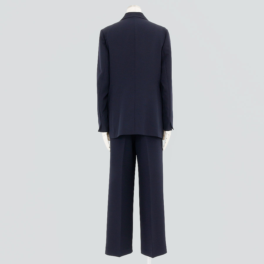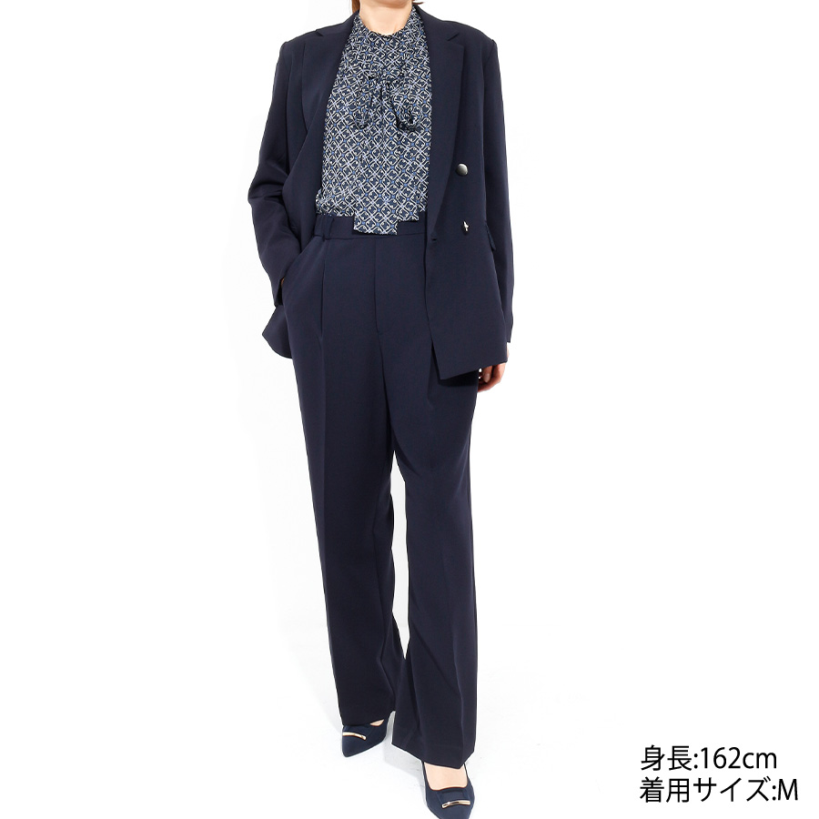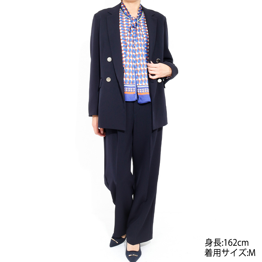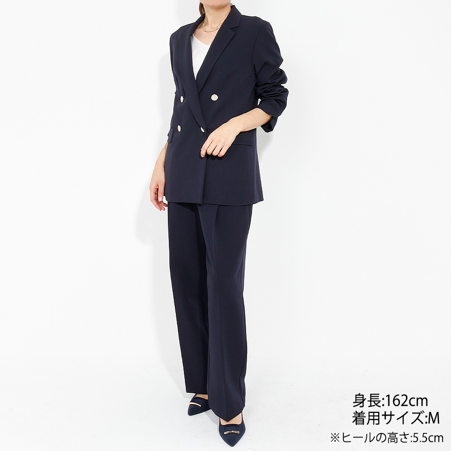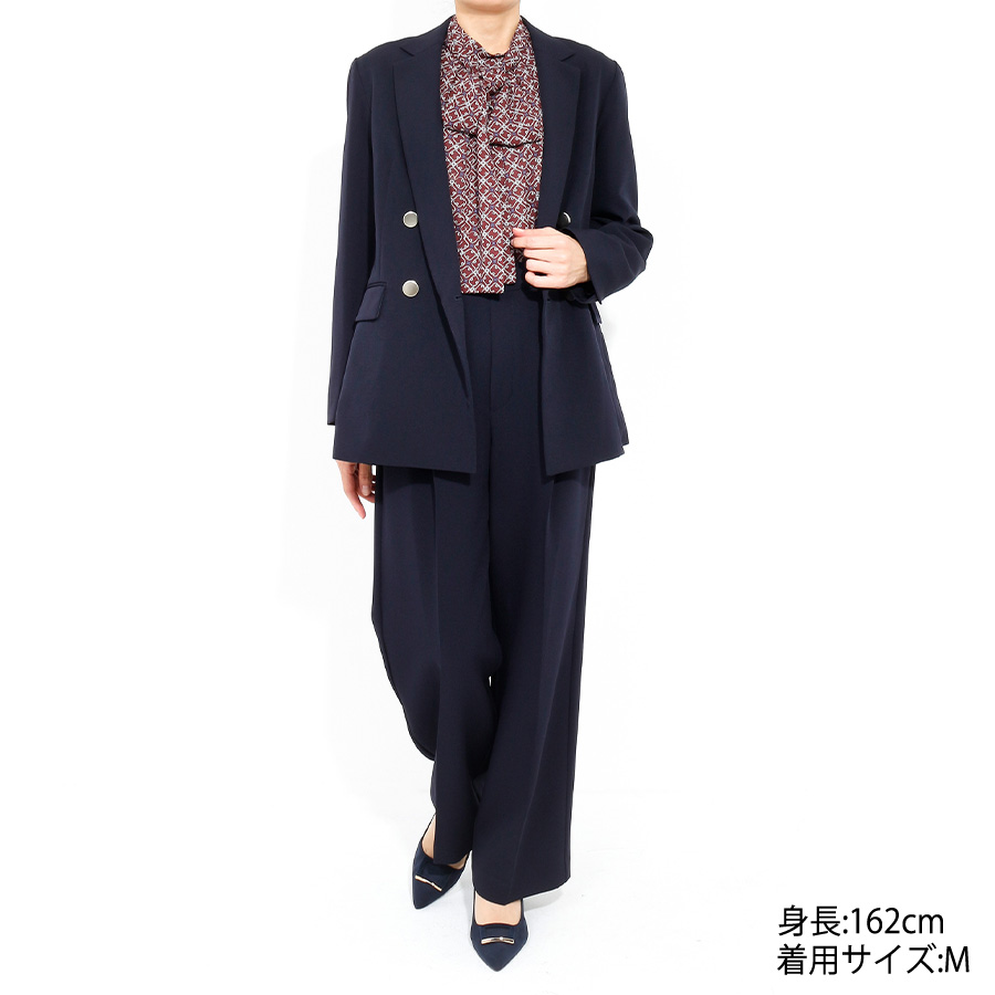 上品なネイビーのダブルジャケットとワイドパンツのセットアップ。