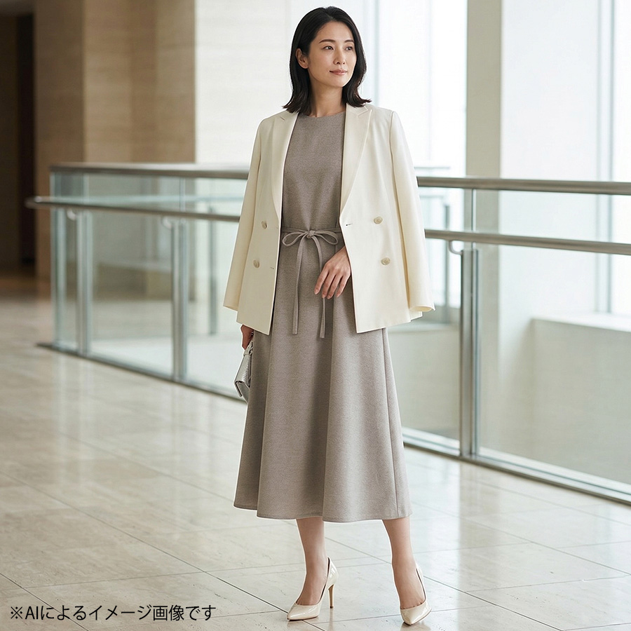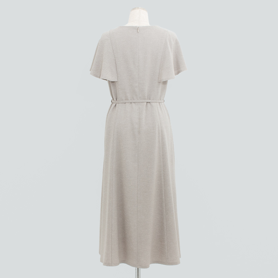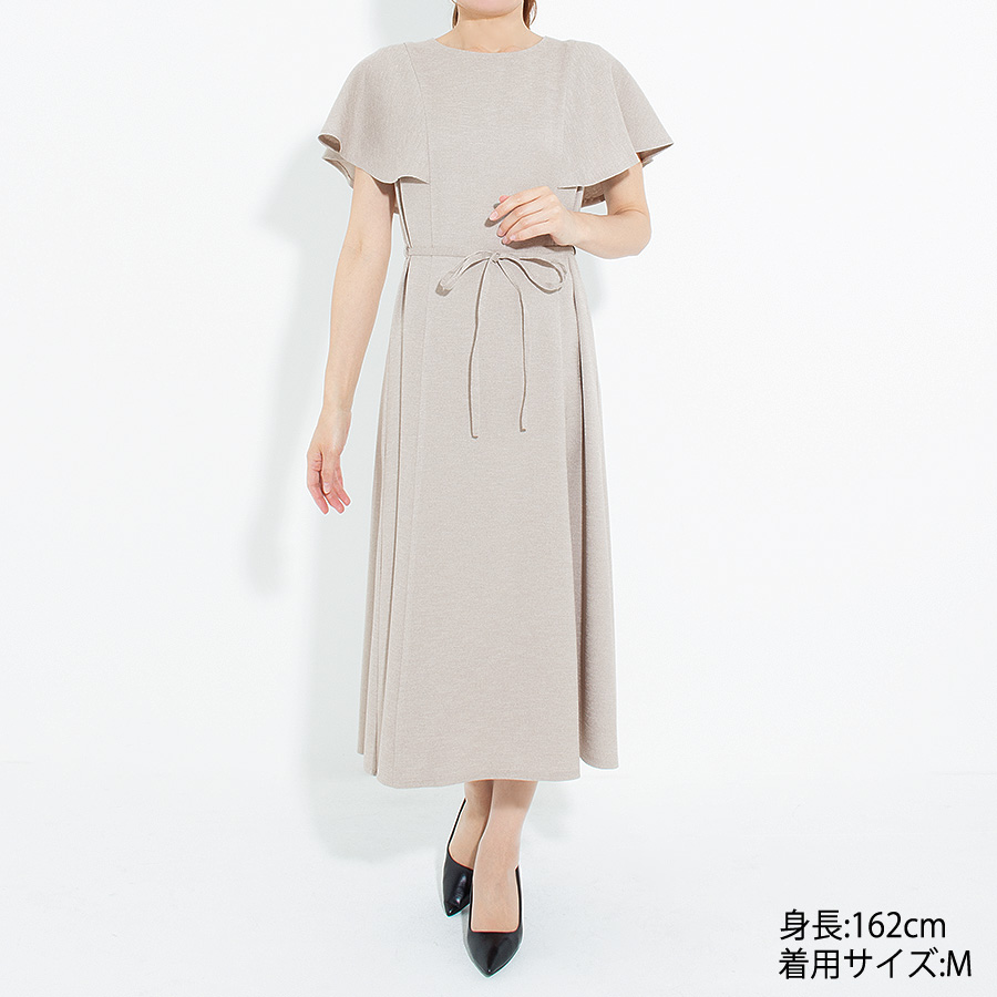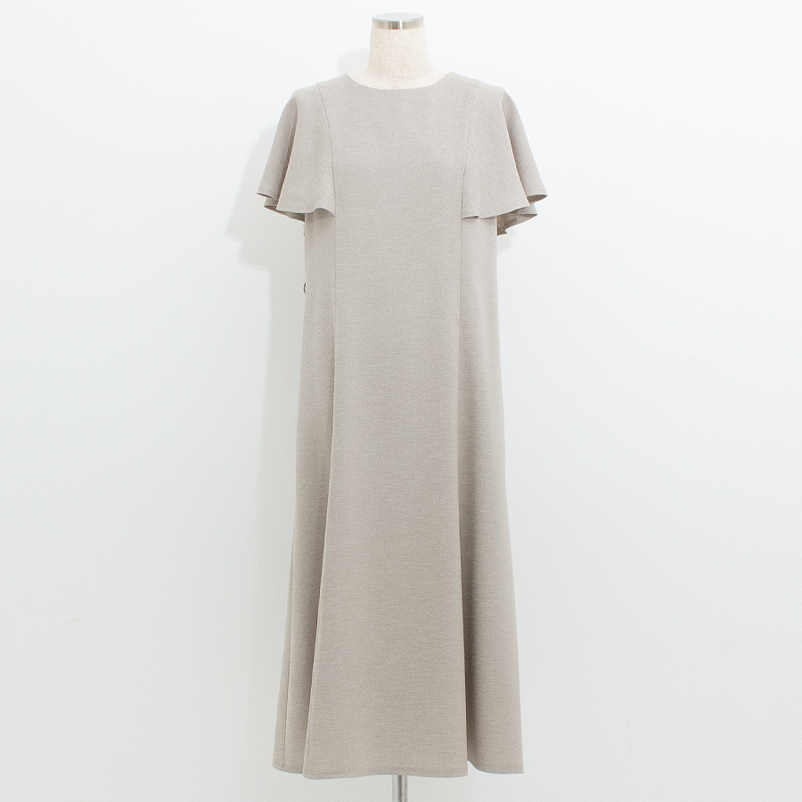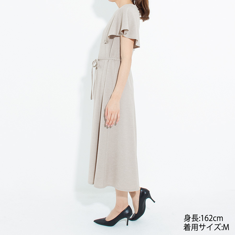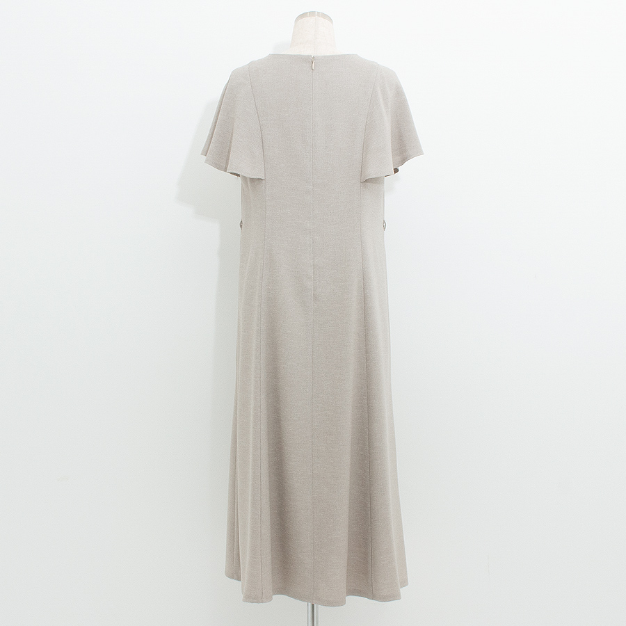 落ち着いた麻調素材のベージュカラーが上品な印象を与えるワンピース。