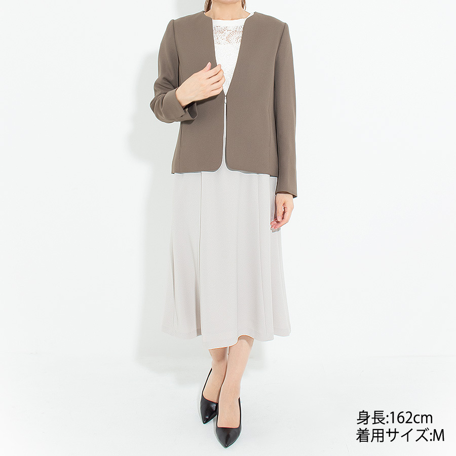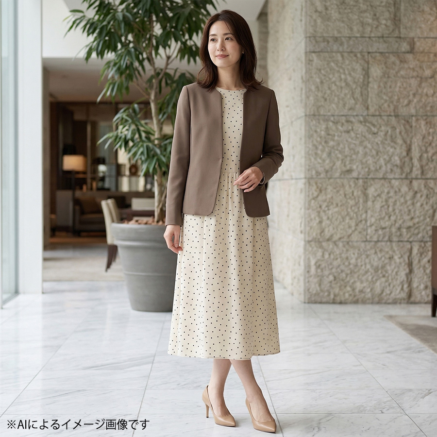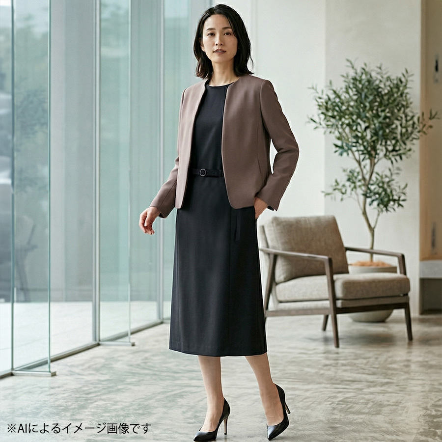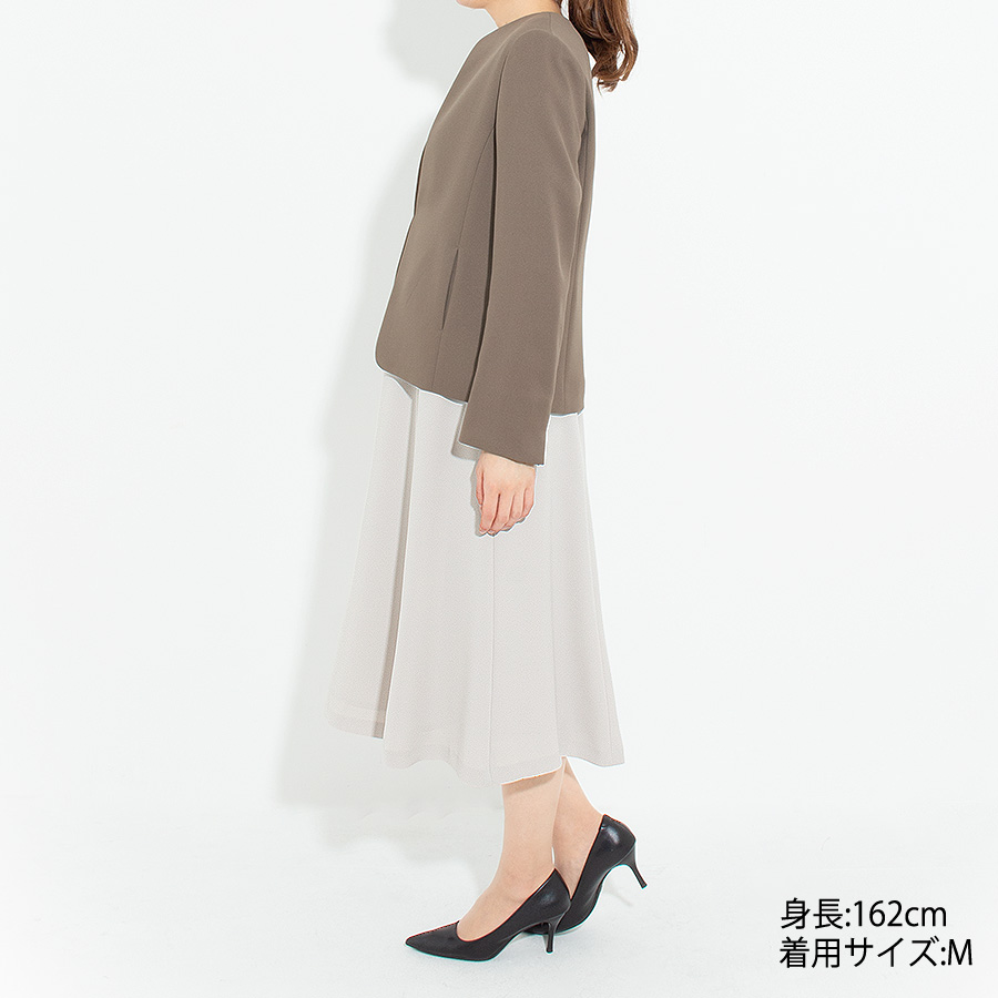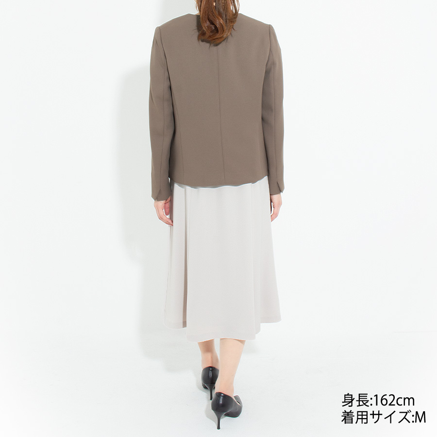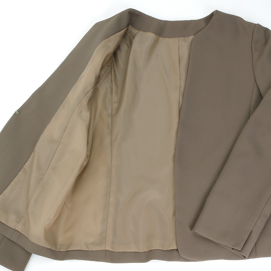 しなやかな落ち感のある生地が上品落ち着いた素材で、大人のブラウンカラーのノーカラージャケットは、こなれ感のあるコーディネイトを楽しめます。