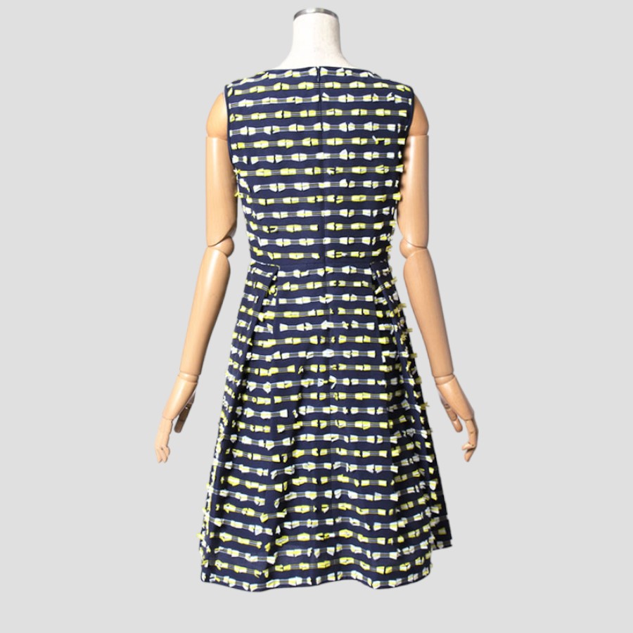 フランスのインポートのジャガードを使用したワンピース。首回りと脇部分のパイピングがアクセント。