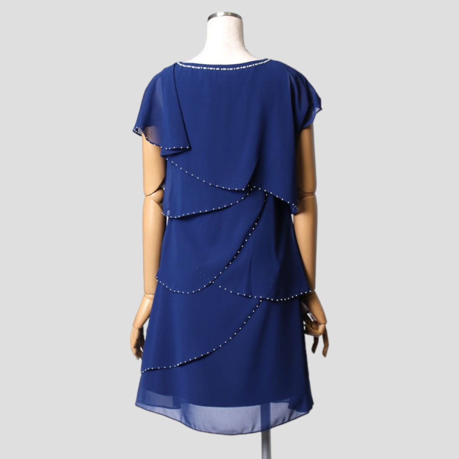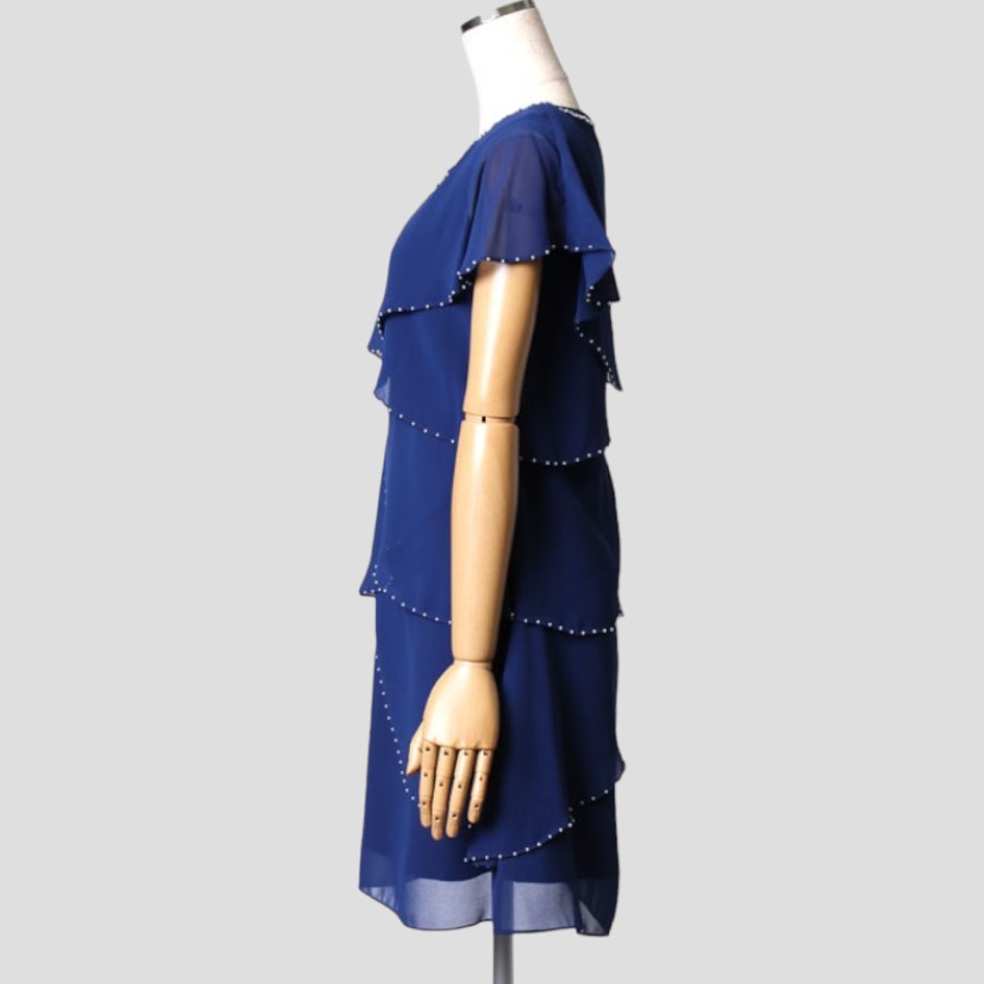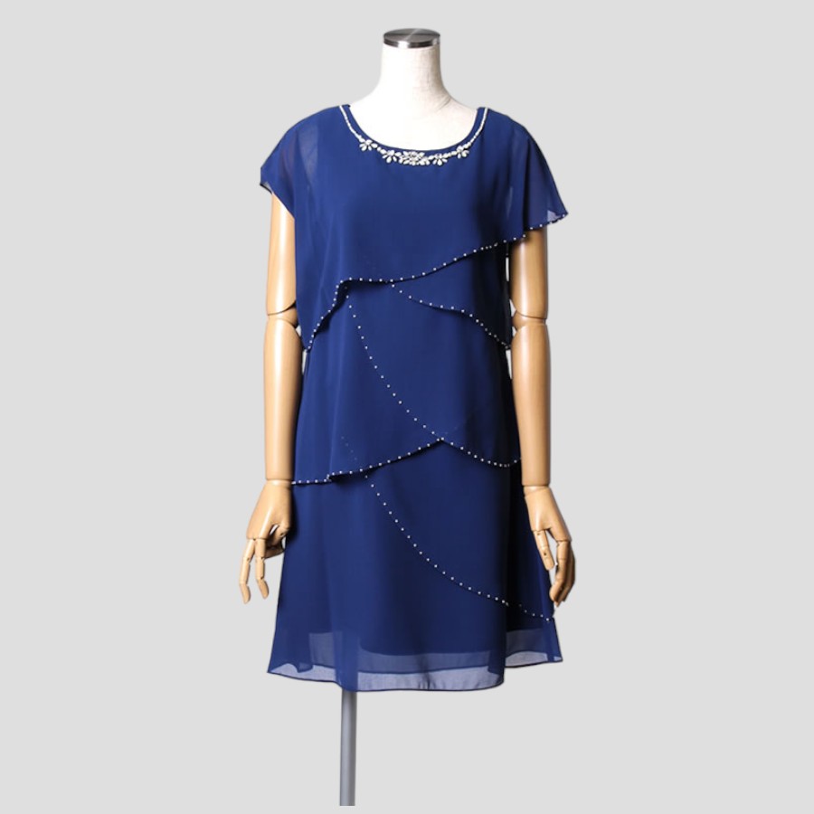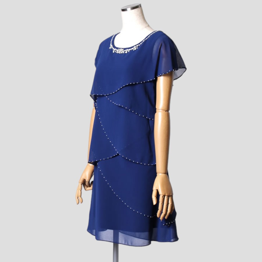 胸元のフラワーモチーフのビジューとティアードデザインがポイントの1着。