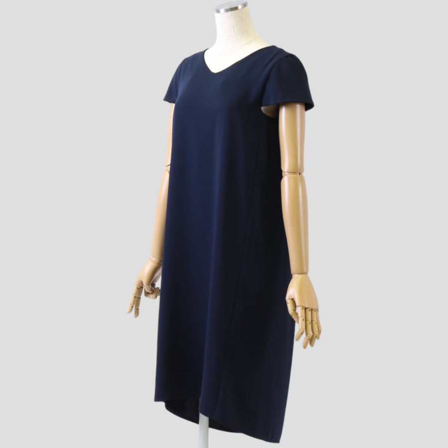 上品なワンピースですが、後ろのリボンに重みがあり、後ろへ引っ張られるので前の中央の裾が上がってました。