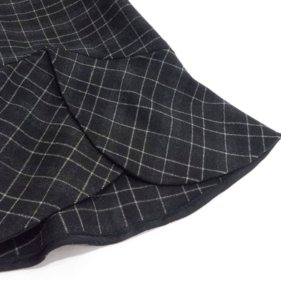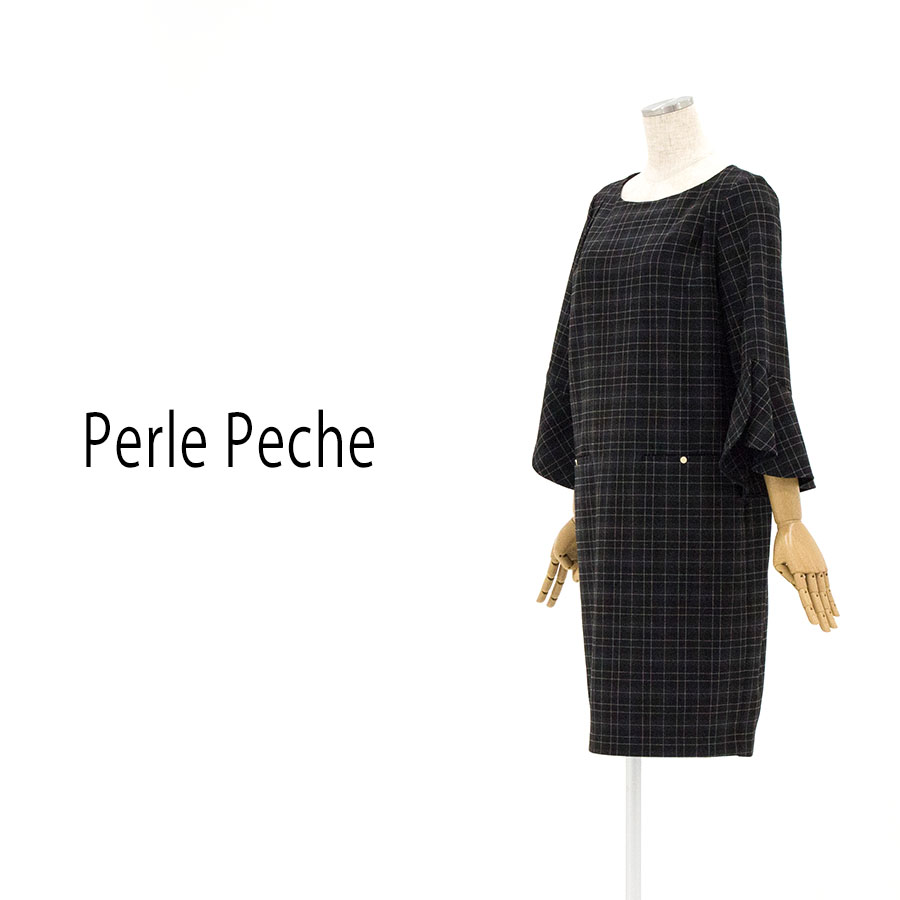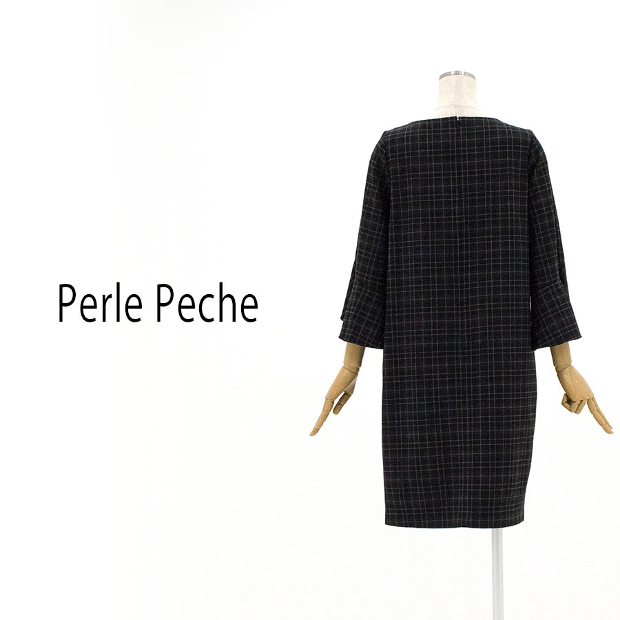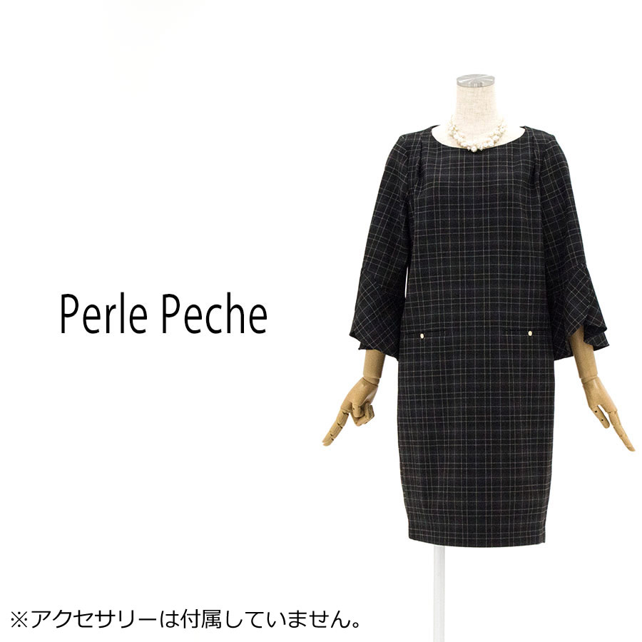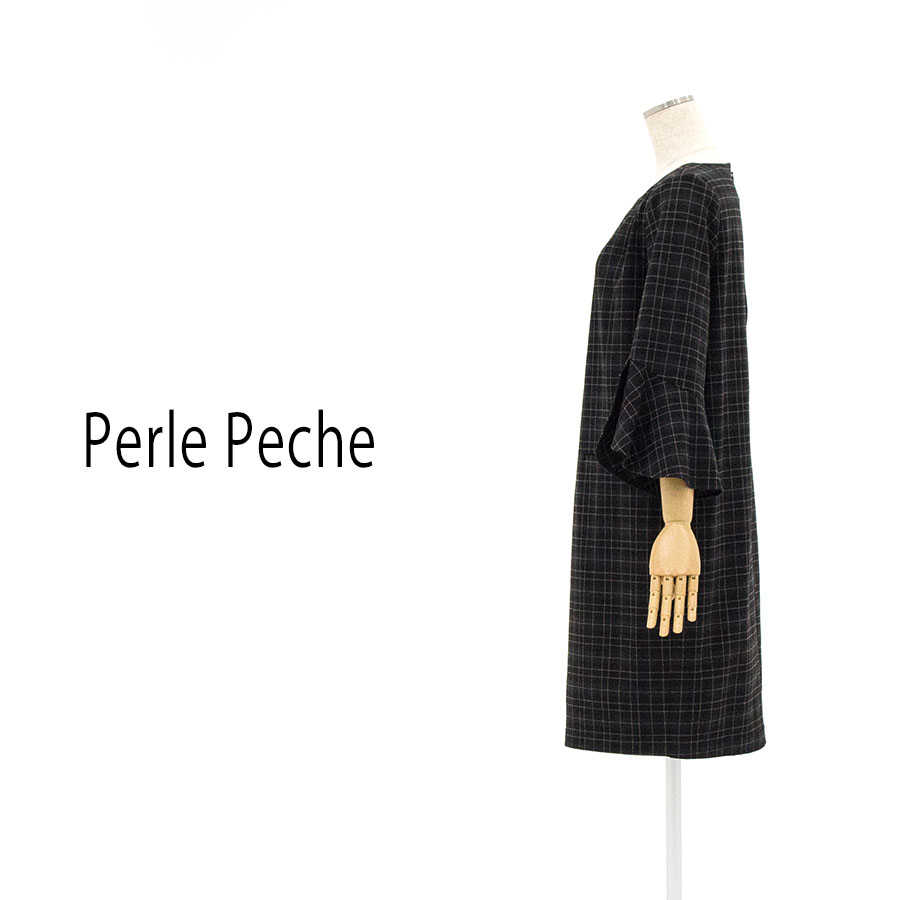 チェック柄 フレアースリーブ ワンピース(Mサイズ / ブラック / Perle Peche(ペルルペッシュ))
