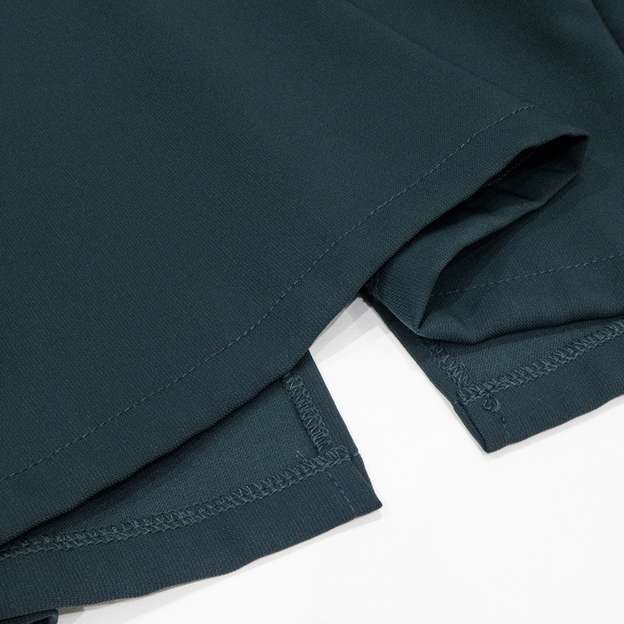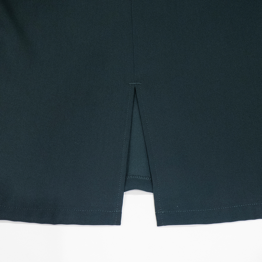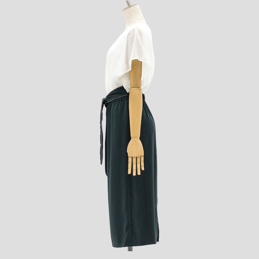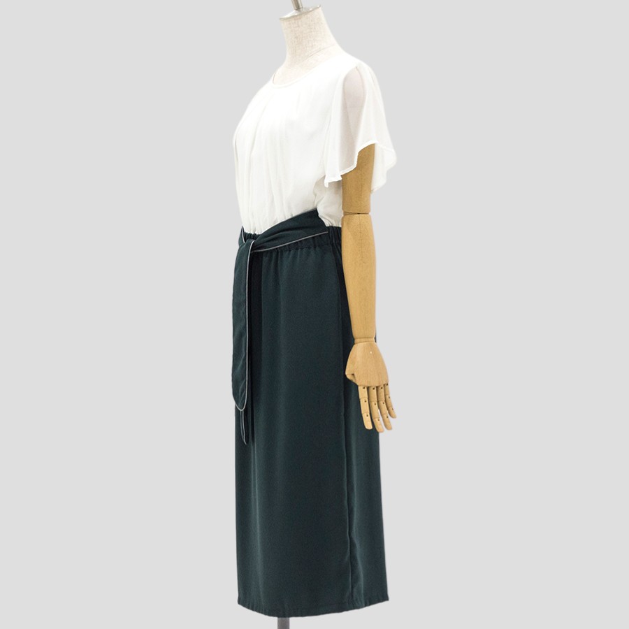 さらりと着やすく、スカートの着丈が長いのも落ち着いた印象で気に入っています。グリーンがかった色味もよい。ただ、ベルトが着ているうちにズレてしまい、気になりました。 ジャケットと合わせて、何度も着回せ満足です。