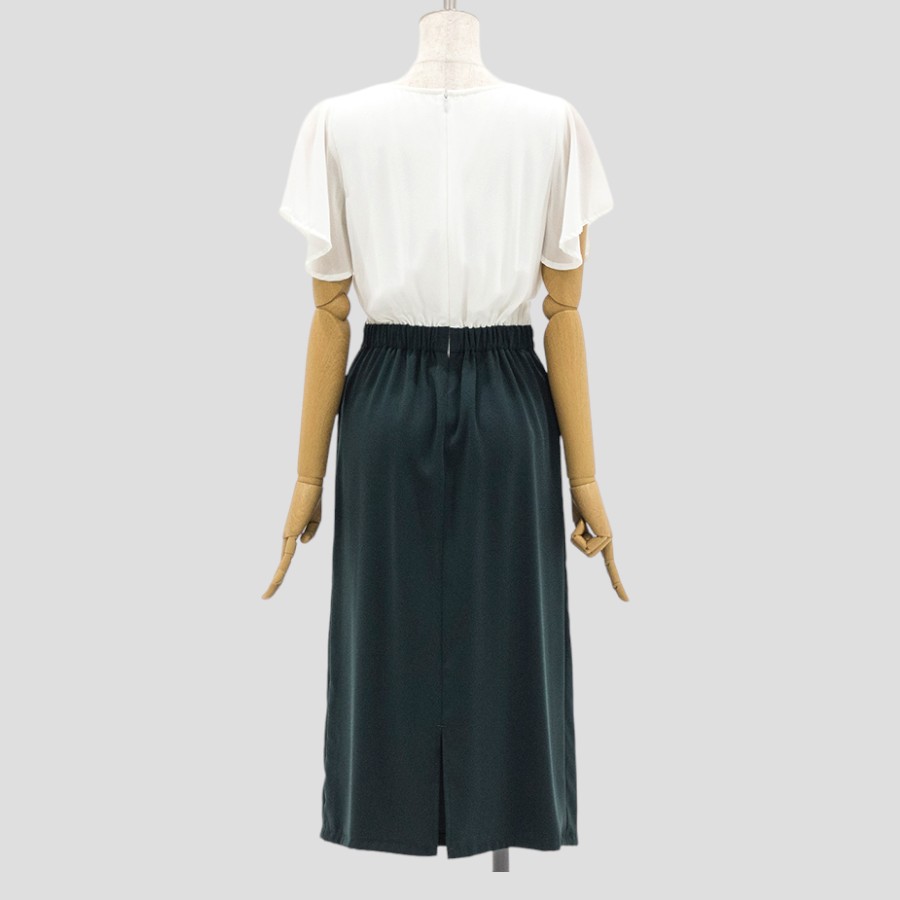 身長162cm、やせ形。通勤にほどよいスカート丈と色合いです。春は上にジャケットを羽織ればちょうどいい感じに落ち着きます。トップスは白なのでインナー注意。春~夏まで活躍しそうです。