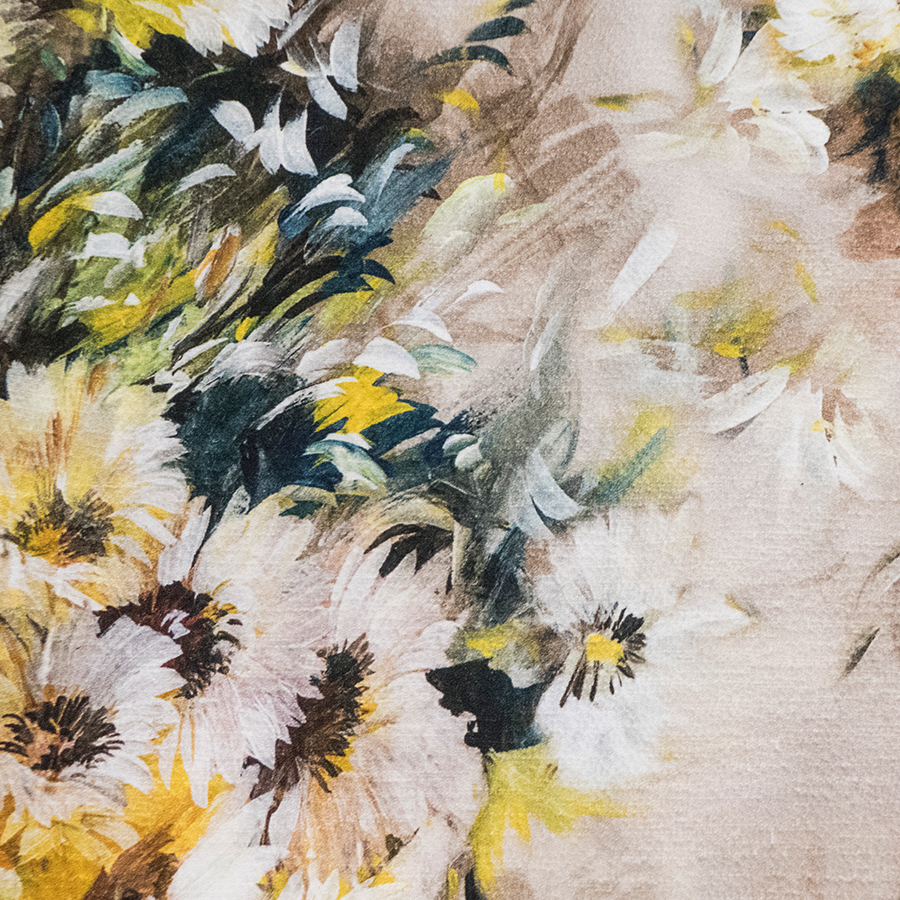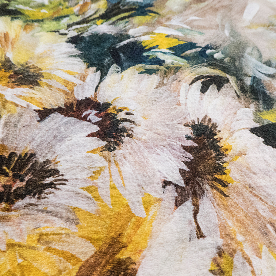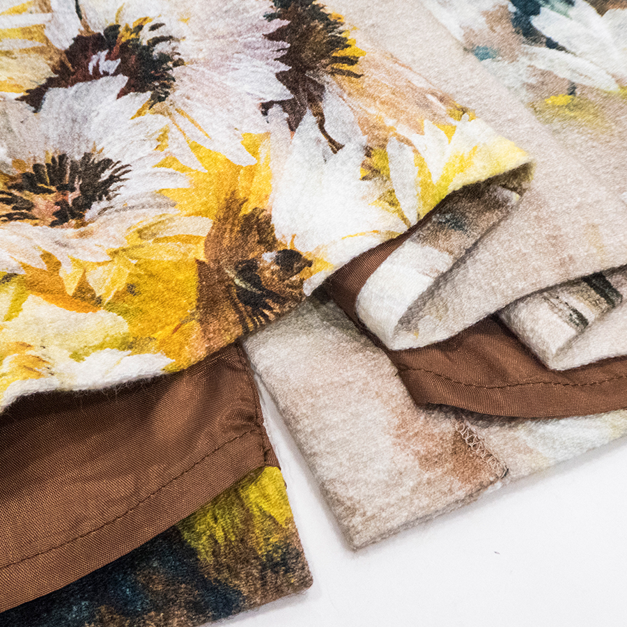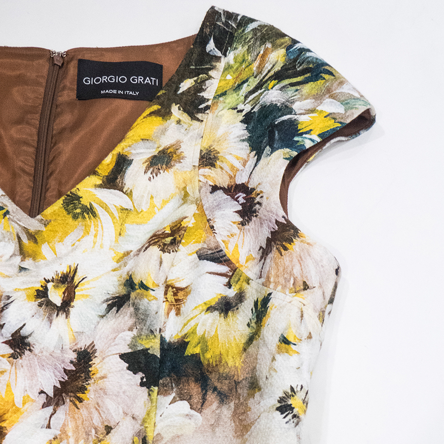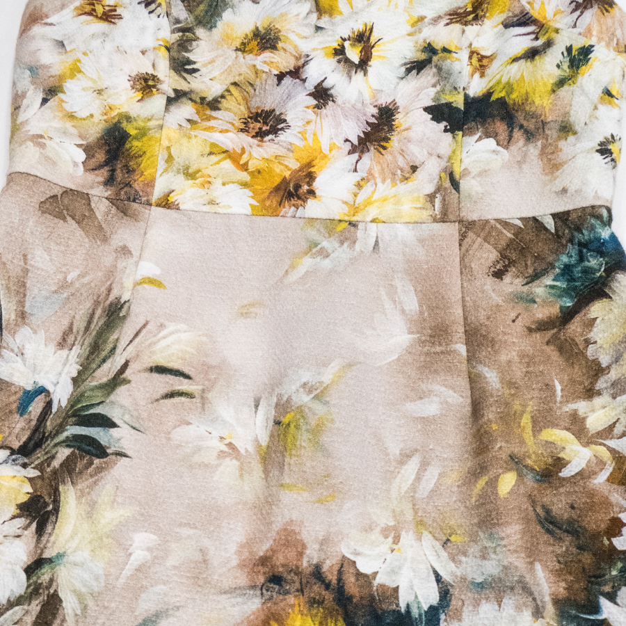 ブラウンベースの生地に同系色の花柄がプリントされたワンピース。