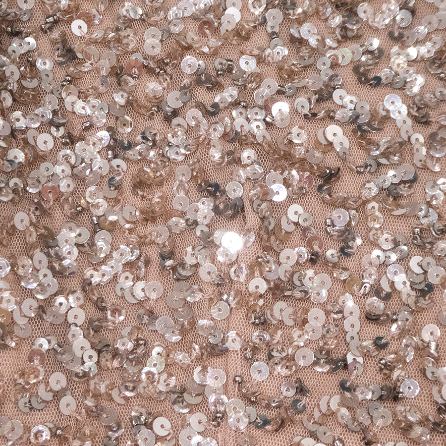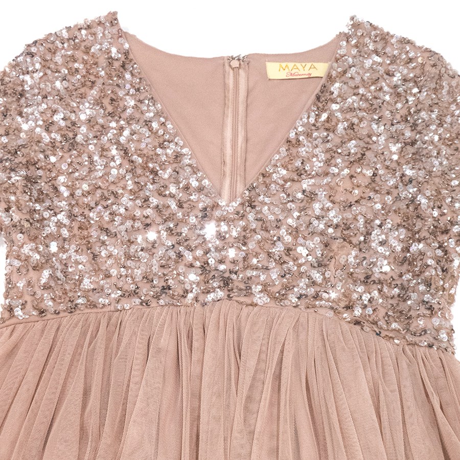 チュール生地にスパンコールがまんべんなく施されたトップス部分が華やかな、マタニティロングドレス。
