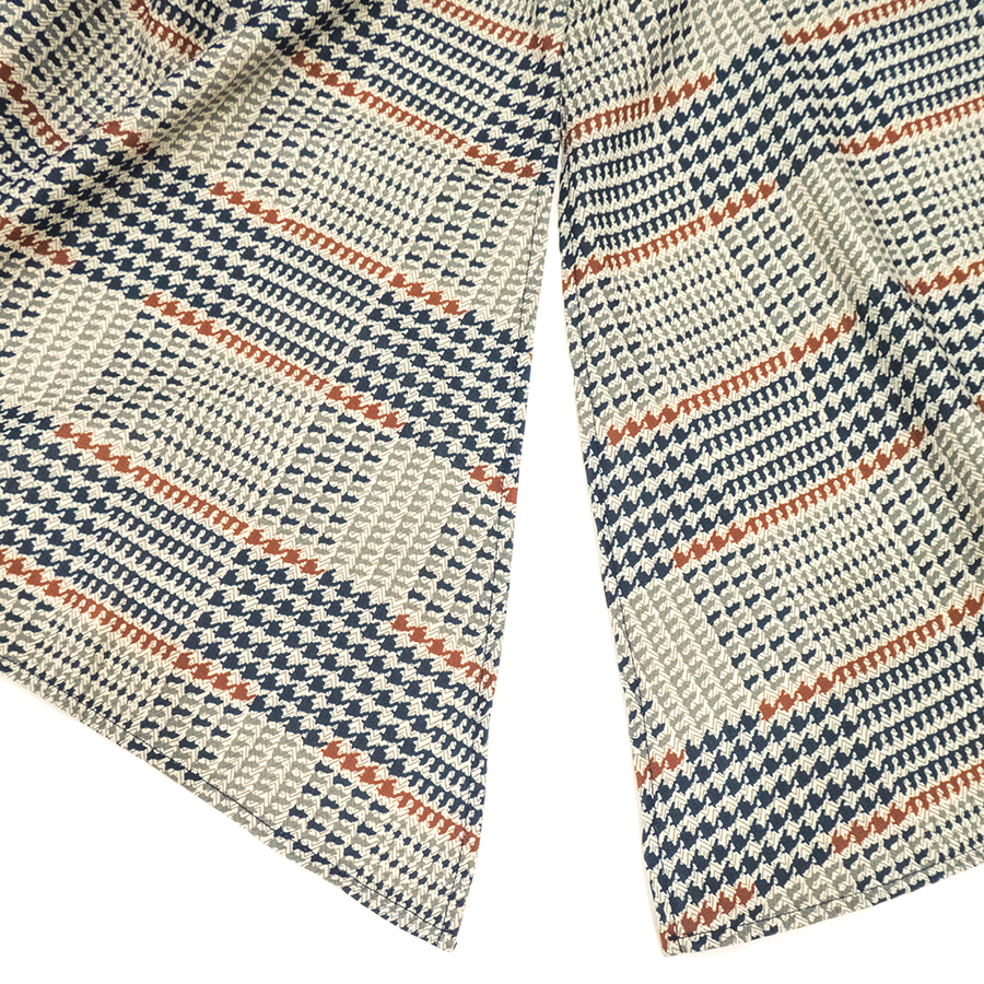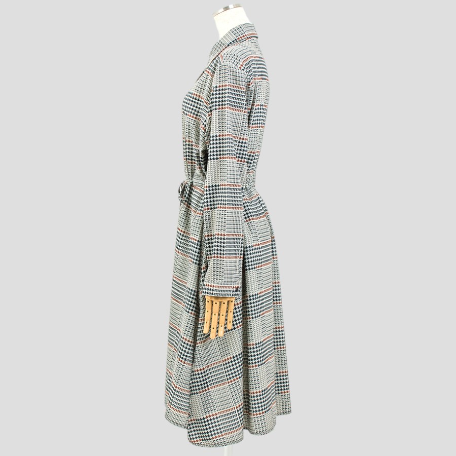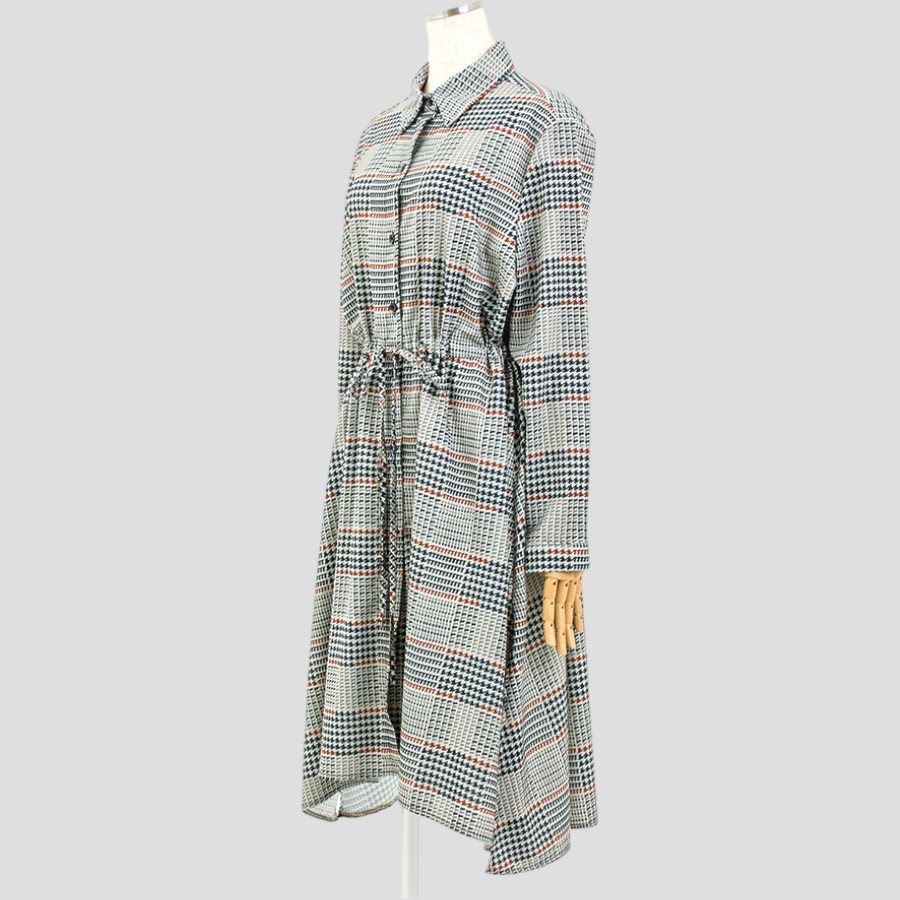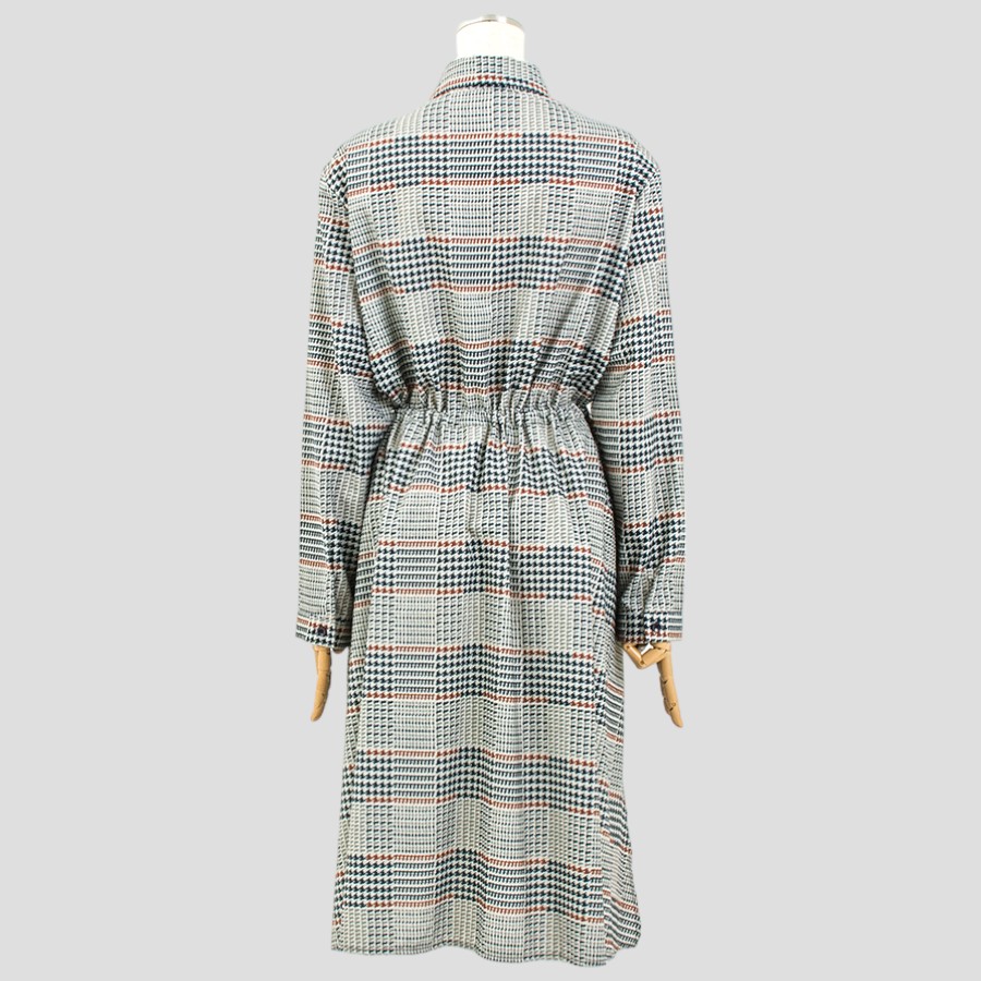 ★スタッフコメント★千鳥柄がボーダーのようににデザインされたワンピース。ボタンを多めに外して抜け感のあるシルエットで着ていただくのがおススメです。アシンメトリーな裾のデザインは動くたびにふんわり広がり、大人レトロな雰囲気です。ブーツやスニーカーなどと合わせていただいても◎。また、前のボタンを全て開けていただければ、羽織としてもお使いいただけます。※一番下のボタンの位置が脚の付け根辺りとなりますので、レギンスなどのアイテムと合わせていただくのがおすすめです。