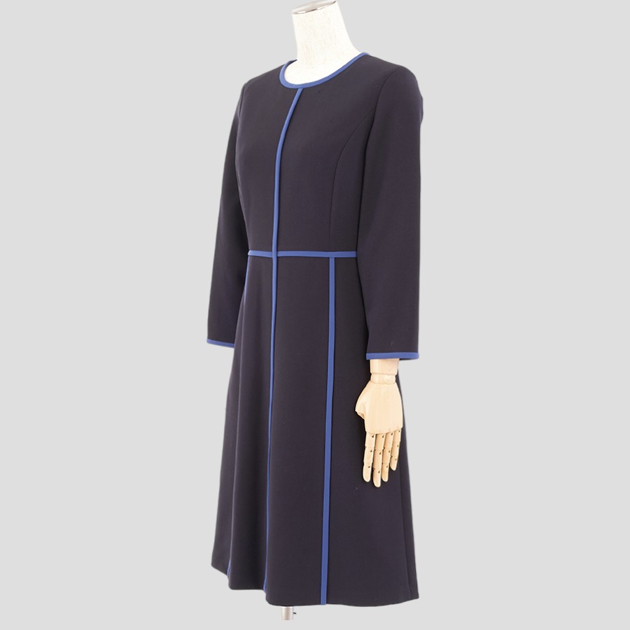 明るいパイピングのラインがスリムに見せてくれるワンピース。