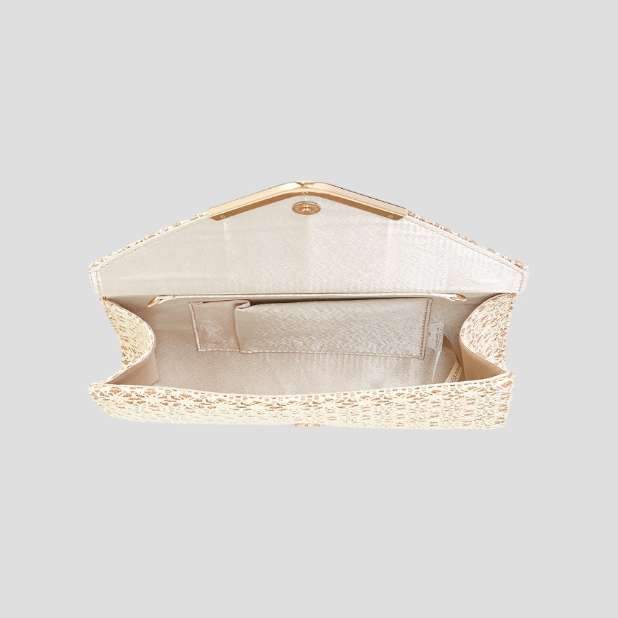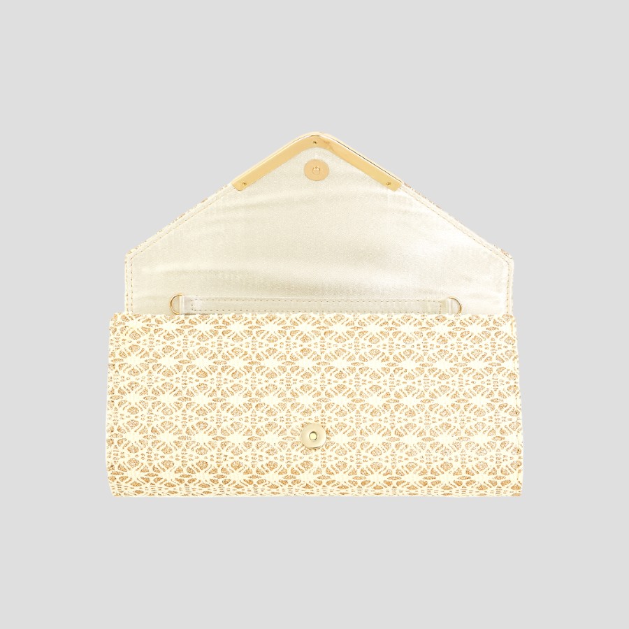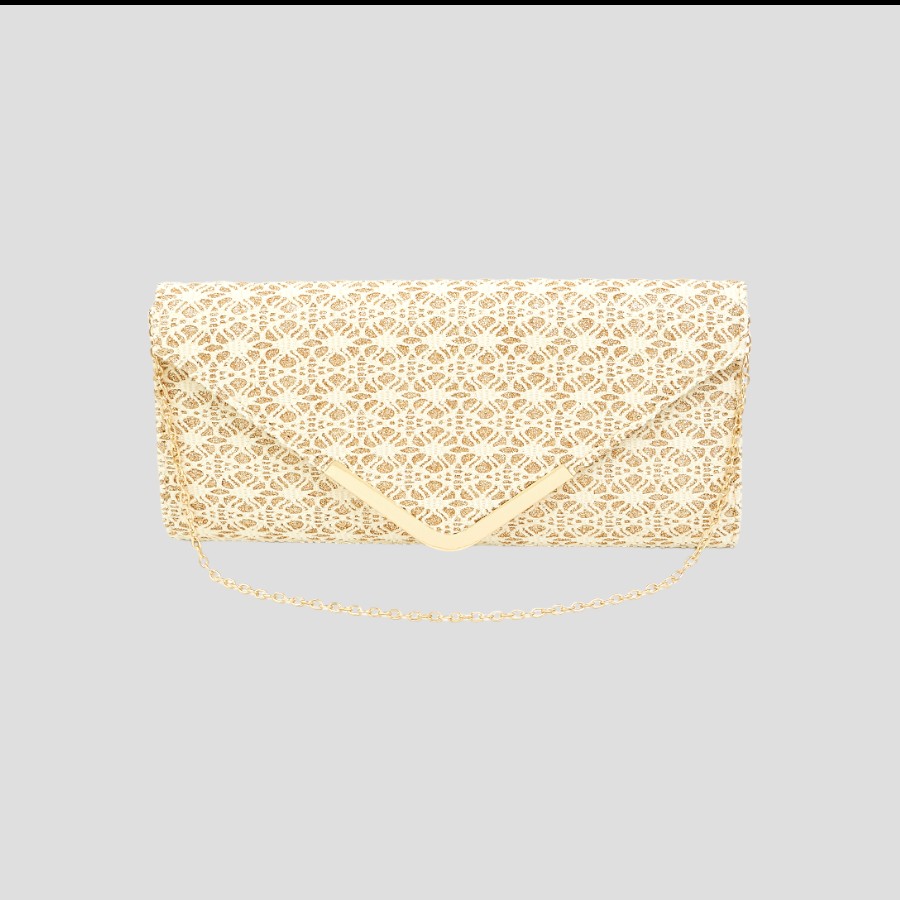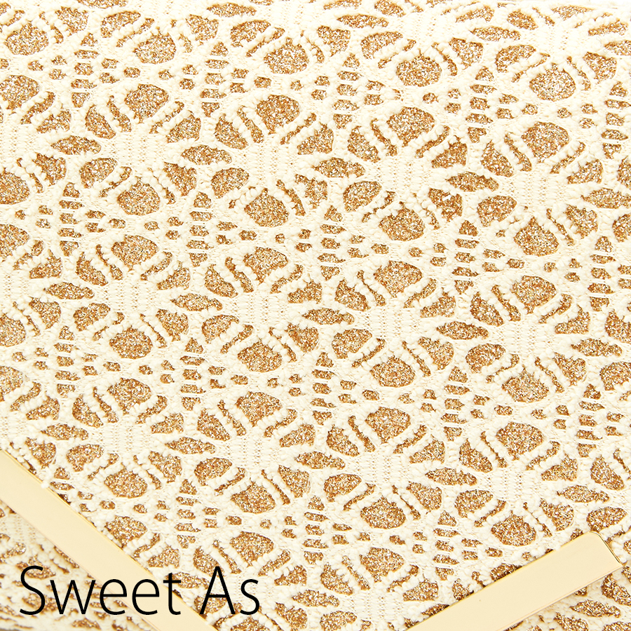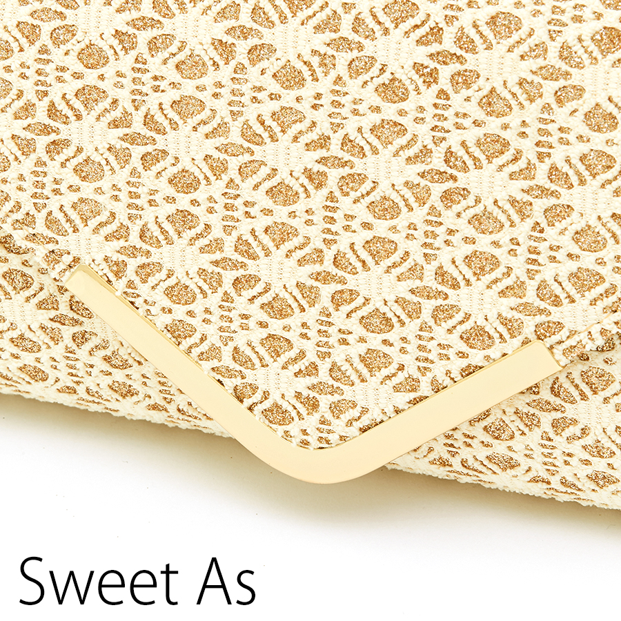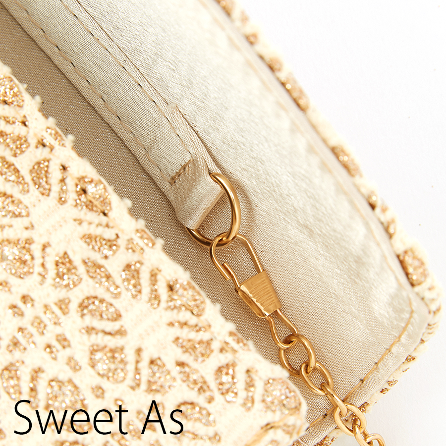 ★スタッフコメント★ゴールドラメとクロシェレースのクラッチバッグ。和にも洋にもマッチするデザインです。型崩れしにくいデザインで、オケージョンシーンにお薦めです。取り外し可能なチェーン付。