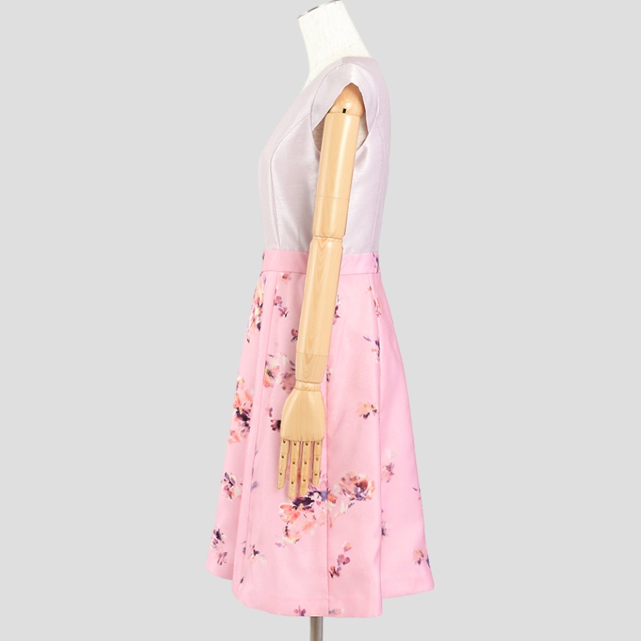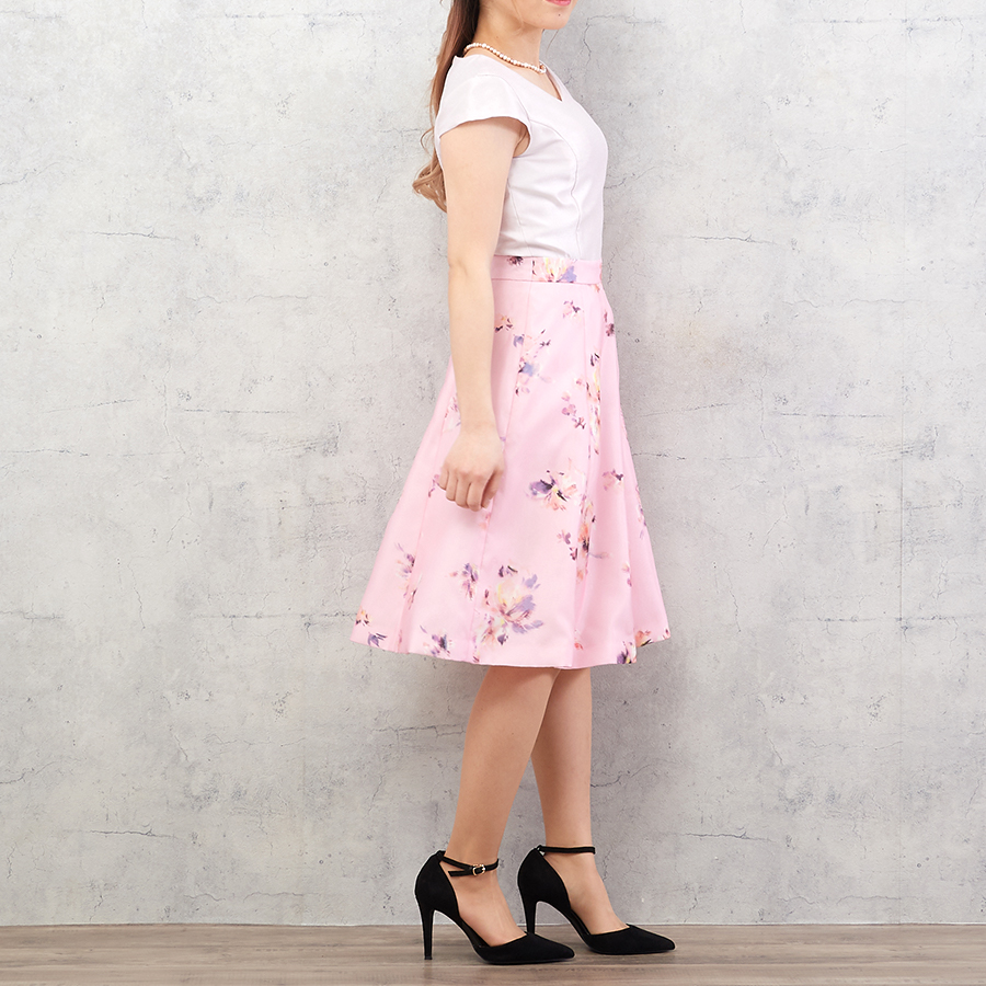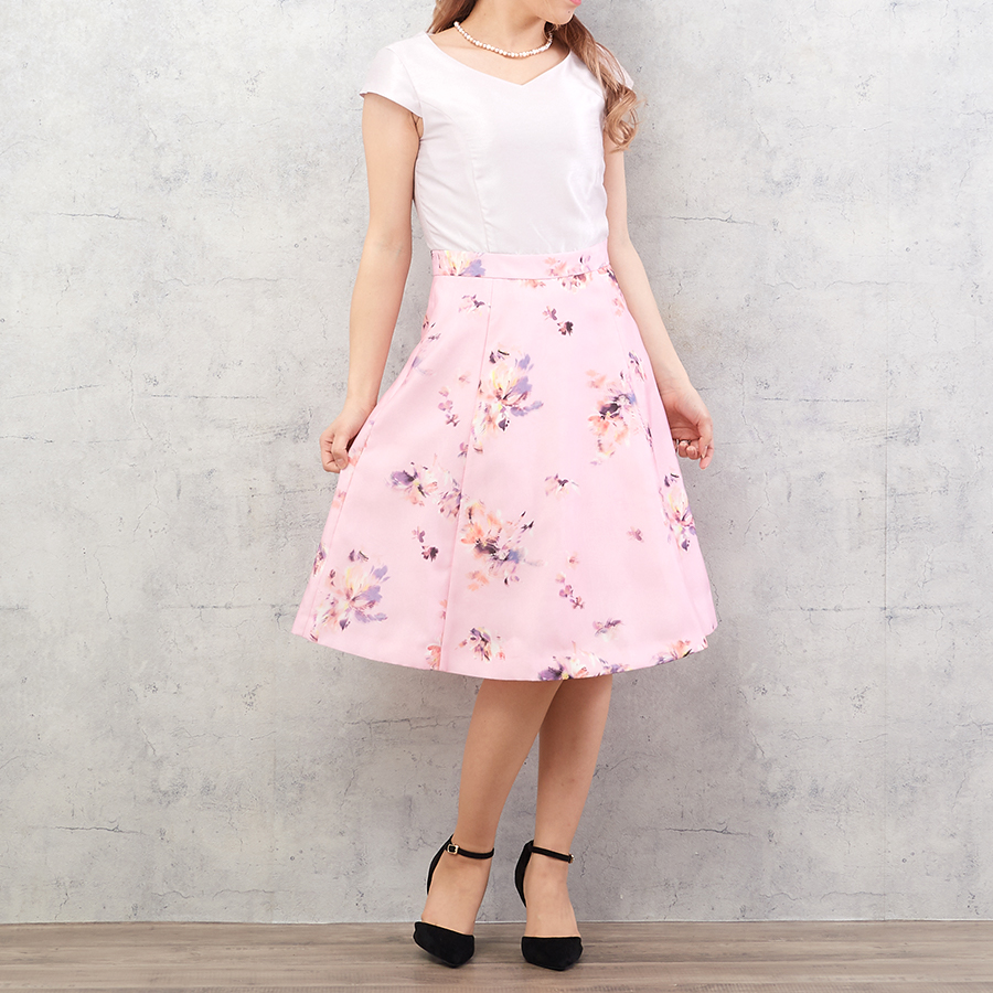 立体感のある花柄とフレアスカートがフェミニンな雰囲気に。