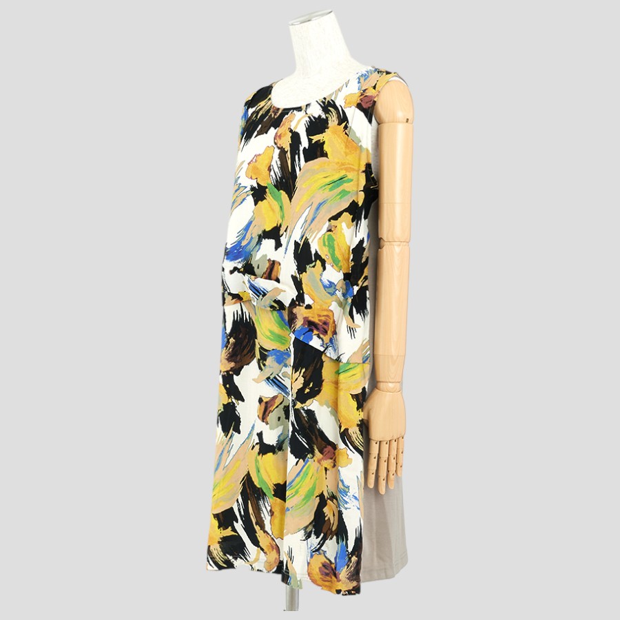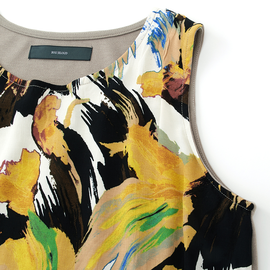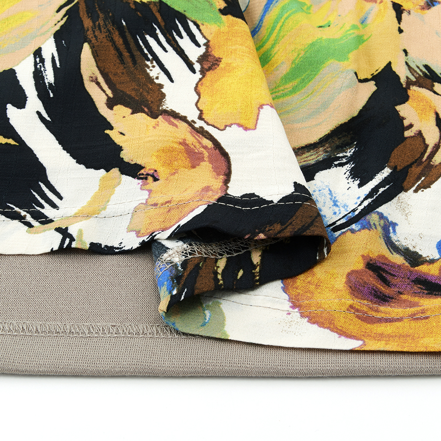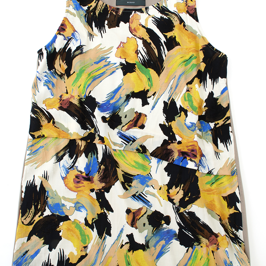 ★スタッフコメント★大胆なボタニカル風プリントが目をひくワンピース。前身頃は縦ジワ加工されたレーヨン素材で、こなれたカジュアルな雰囲気です。アシメトリーなウエストのブラウジングもポイント。ポンチ素材の背面は背中部分にタックをとっているので、体型カバーも◎短め丈なので、パンツ等とレイヤードして頂いてもスマートにご利用頂けます。