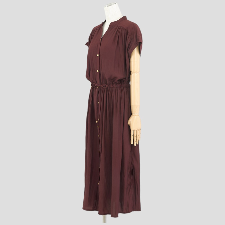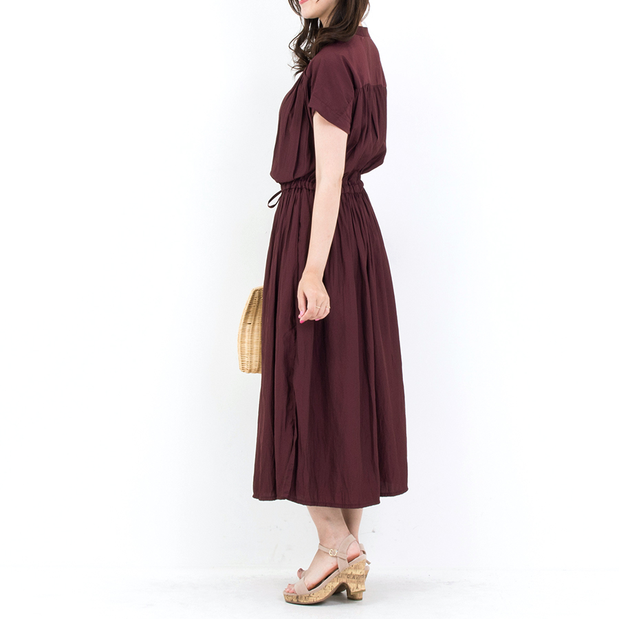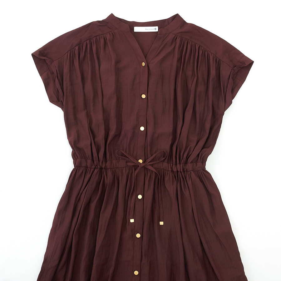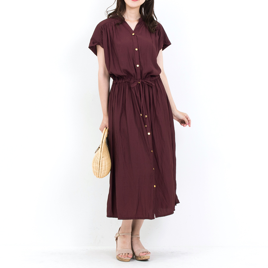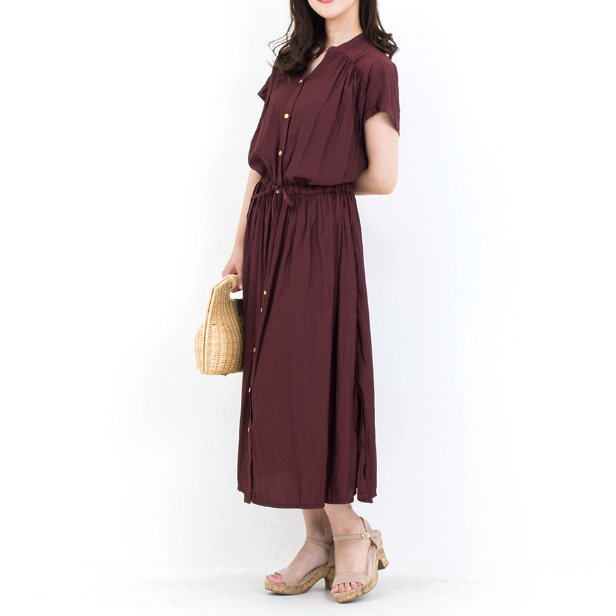 ★スタッフコメント★落ち着いた色合いで晩夏にぴったりなワンピース。マットサテン生地で滑らかな肌触りです。薄手で軽い素材なので、暑い時期でも快適に着て頂けます。シワ加工でこなれた印象に。ダークトーンにゴールドボタンがきらりと光ります。肩口とウエストのギャザーで立体感をプラス。ワンピースとしてはもちろん、前ボタンを開けて羽織りものとしてもご利用頂けます。 ※着用モデル:163cm 着用サイズ:M ※小物はレンタルに含まれません。※ロング丈となっておりますので、サイズ詳細をご確認ください。