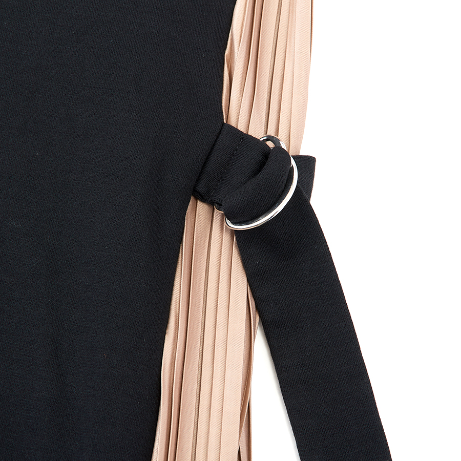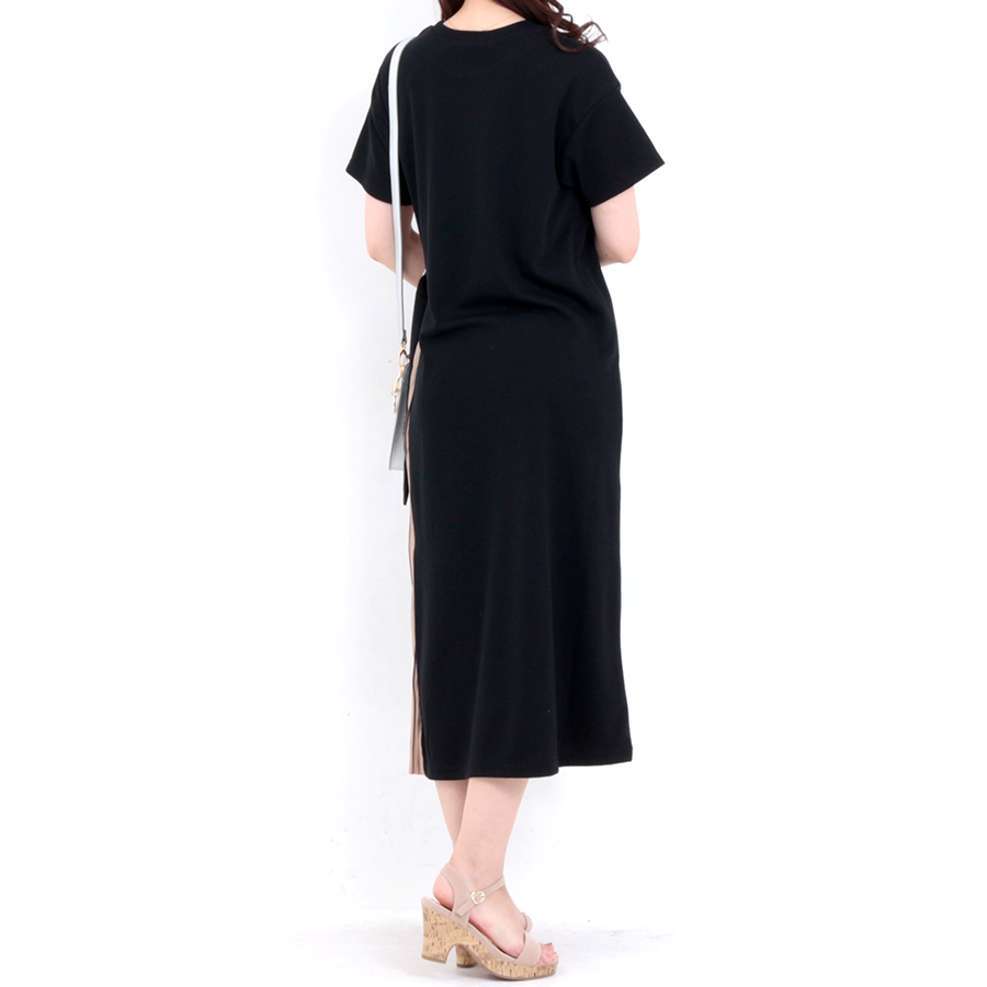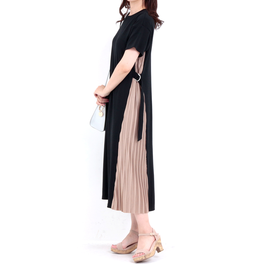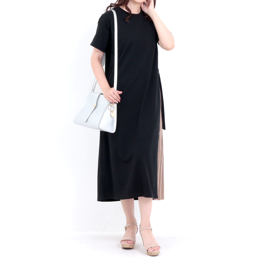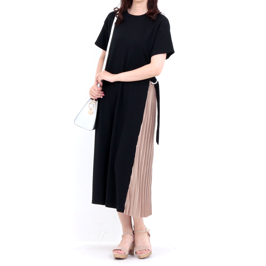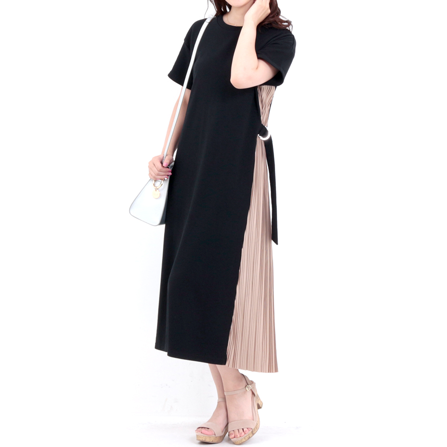 ★スタッフコメント★楽ちんなのにお洒落に見えるワンピース。伸縮性のあるカットソー素材で、着心地抜群です。左サイドのサテンプリーツが歩く度に揺れて華やかさをプラス。長めの丈感とシックな配色で可愛すぎず大人な雰囲気に。プリーツ部分のベルトもアクセントになっています。ストンとしたシルエットなので、体型カバーも◎。※着用モデル:163cm 着用サイズ:F※小物はレンタルに含まれません。