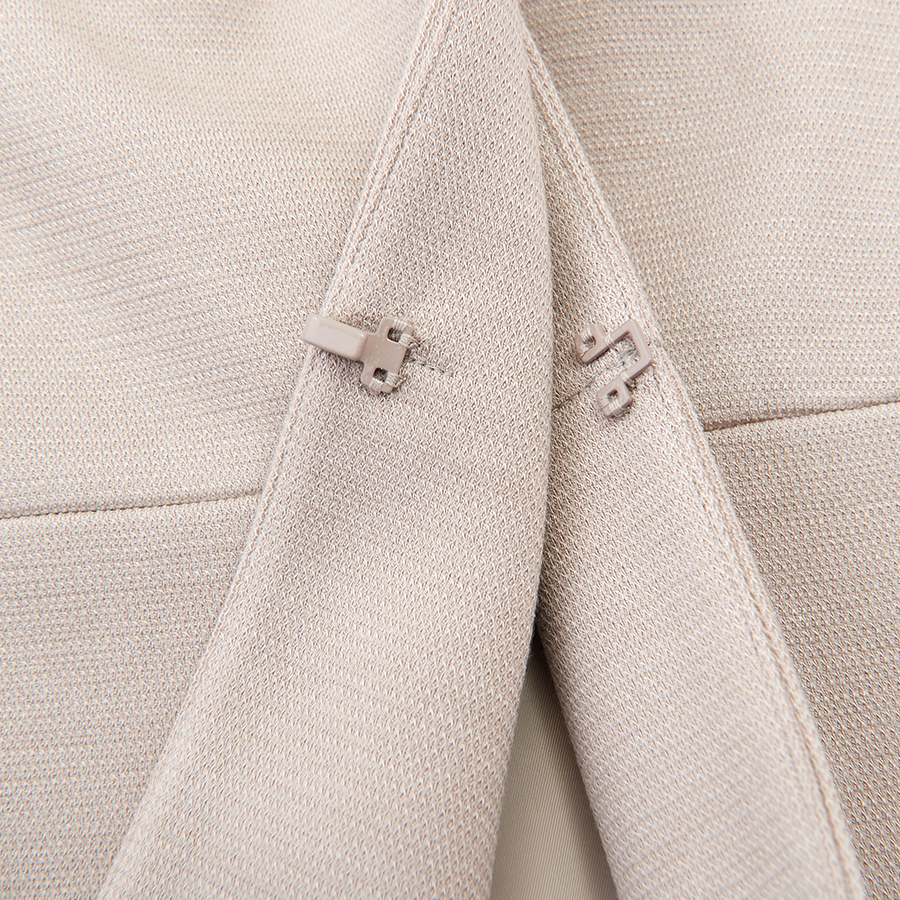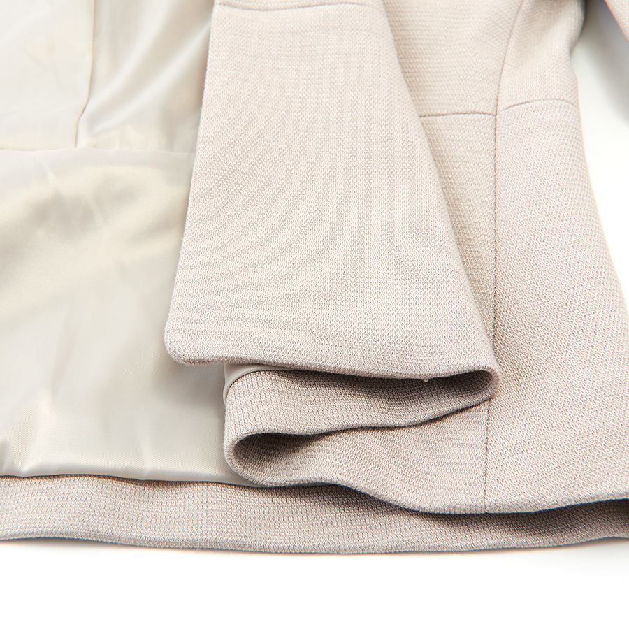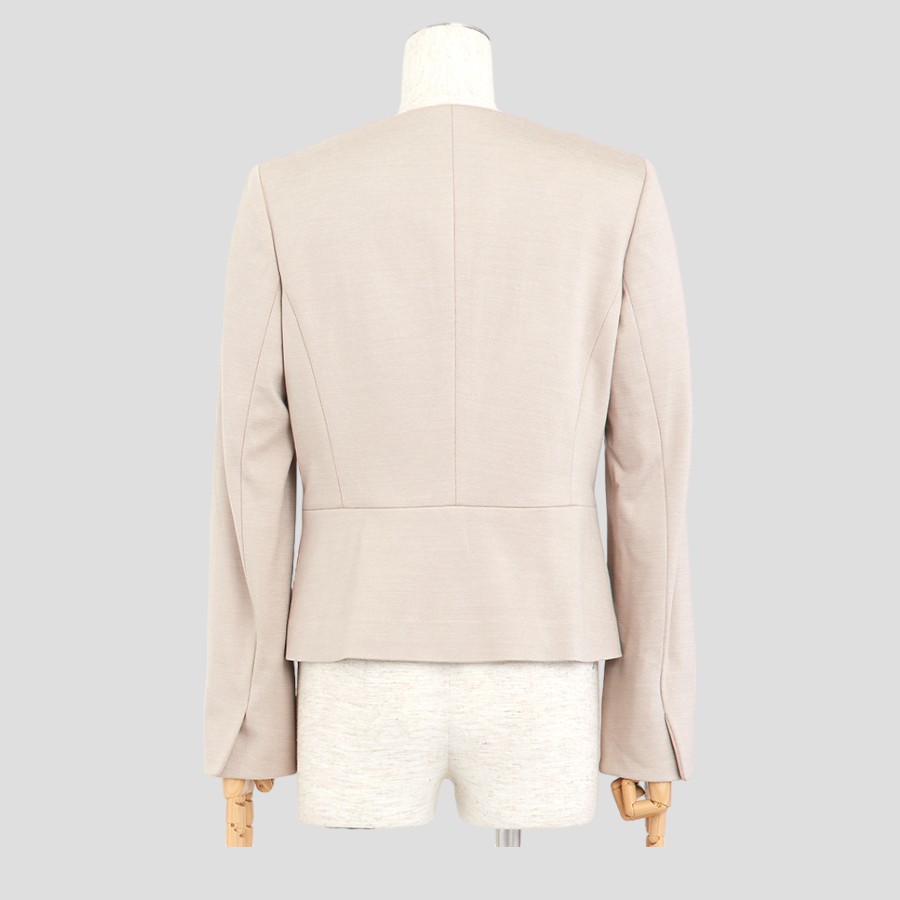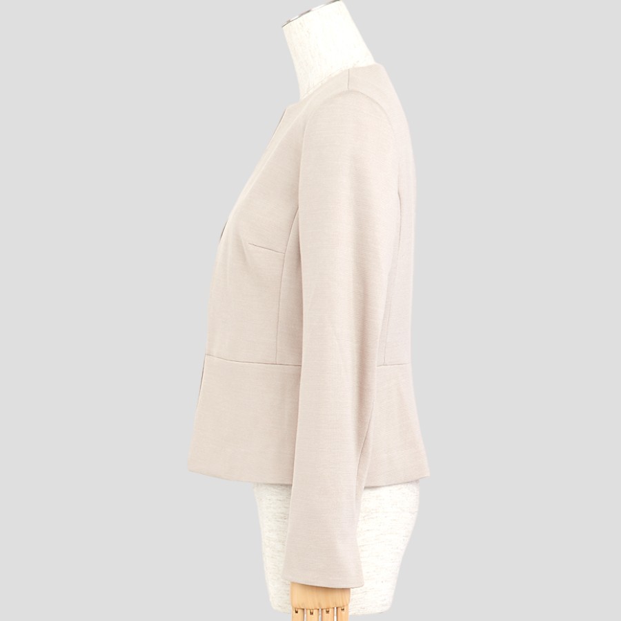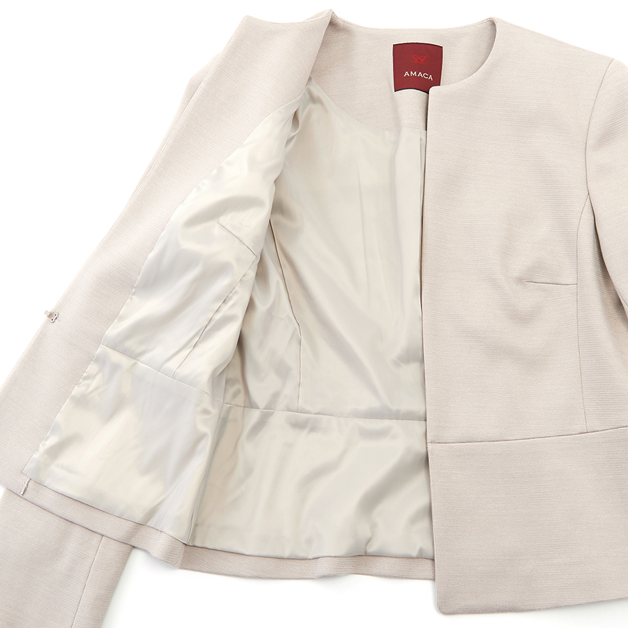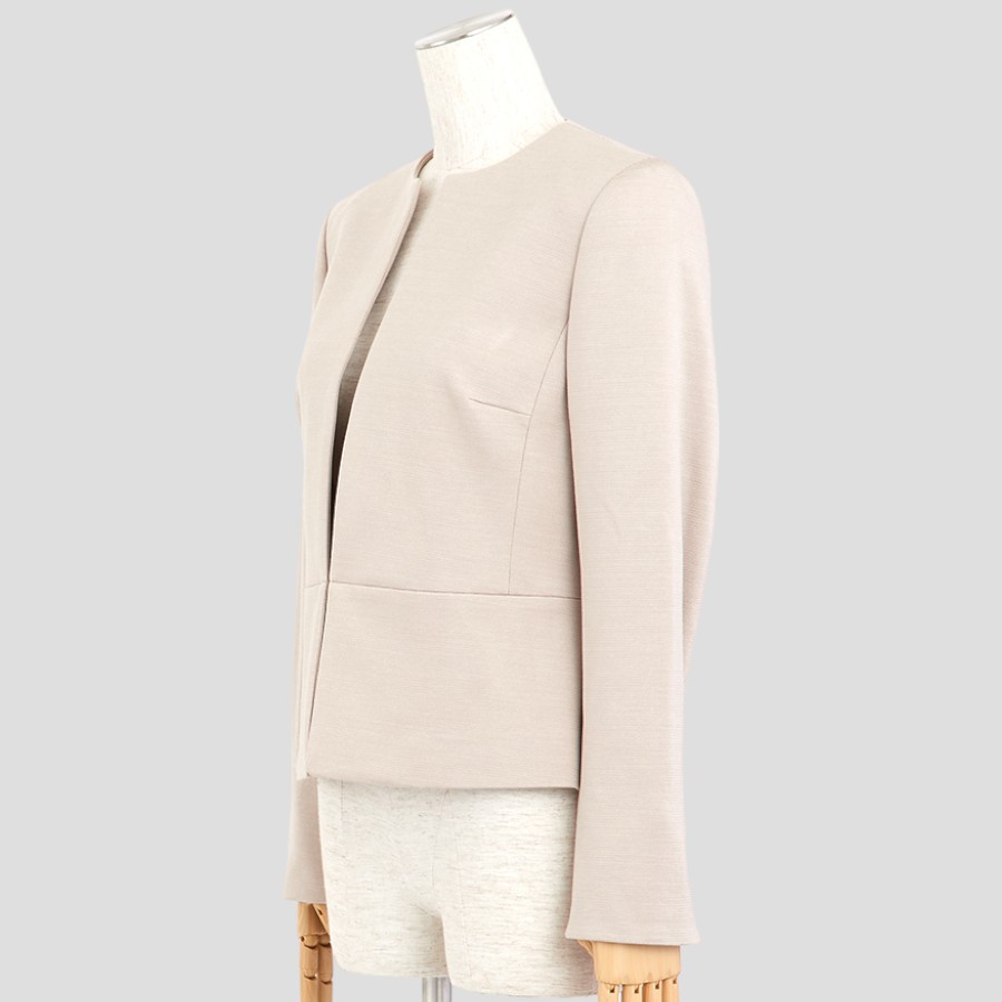 しっかりしたノーカラージャケット。写真よりも少しアイボリーっぽい。とても上品です。